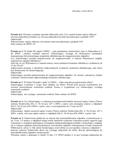Wrocław, 16.03.2012r. Pytanie nr1: Prosimy o podanie sposobu obliczenia ceny. Czy wartość brutto należy obliczyć od ceny jednostkowej brutto czy od ceny jednostkowej netto powiększonej o podatek VAT? Odpowiedź: Wartość brutto należy obliczyć od wartości netto powiększonej o podatek VAT. Patrz zmiany do SIWZ -IV Pytanie nr 2: W dziale III. punkt 4 SIWZ - ,,opis przedmiotu zamówienia" oraz w Załączniku nr 2 do SIWZ -,,Istotne warunki umowy'' Zamawiający wymaga od Wykonawcy posiadania stacjonarnego lub przenośnego urządzenia chłodniczego do magazynowania odpadów. Czy Zamawiający posiada pomieszczenie do magazynowanli, w którym Wykonawca mógłby zamontować agregat chłodniczy? Jeśli nię, to czy Wykonawca w ramach umowy moze podstawić kontener chłodniczy o kubaturze od 15 do 18 m3? Jednocześnie prosimy o określenie maksymalnych wymiarów kontenera chłodniczego, jaki może być dostarczony do Zamawiającego. Odpowiedź: Zamawiający posiada pomieszczenia do magazynowania odpadów. Po stronie wykonawcy bedzie wybranie i dostosowanie odpowiedniego kontenera chłodniczego. Pytanie nr 3. W dziale XI punkt 3 ppkt 1c) SIWZ - ,,Opis sposobu przygotowania oferty"Zamawiąjący wymienia z czego musi składać się oferta. Wśród tych pozycji wymienione jest również potwierdzenie wniesienia wadium. Proszę o wyjaśnienie czy Zamawiający wymaga wniesienia wadium? Odpowiedź: Zamawiający nie wymaga wniesienia wadium. Patrz zmiany do SIWZ. Pytanie nr 4. Czy Zamawiający w niniejszym postępowaniu będzie stosował zapisy Ustawy Prawo ochrony Środowiska (Dz. U. Nr 62 poz. 627 z 2001r. z poźn. zm) orazzapisy ustawy o odpadach (Dz.U. Nr 62 poz.628 z2001r. z poźn. zm), a wszczegolności art. 9 oraz art.42? Odpowiedź: Zamawiający będzie stosował zapisy Ustawy Prawo ochrony Środowiska (Dz. U. Nr 62 poz. 627 z 2001r. z poźn. zm) oraz zapisy ustawy o odpadach (Dz.U. Nr 62 poz.628 z2001r. z poźn. zm) Pytanie nr 5. Zamówienia publiczne na odzysk lub unieszkodliwianie odpadów wymienionych w art. 9 ust. 3-5 ustawy o odpadach mogą zostać udzielone wyłącznie wykonawcy,który zapewni jego wykonanie w instalacji spełniającej wymagania najlepszejdostępnej techniki i technologii i znajduje się w miejscu najbliżej położonymmiejsca wytwarzania odpadów (interpretacja Urzędu Zamówień Publicznych- zał.nr 1). Jak zatem Zamawiający oceni ofertę czy jest zgodna z ustawą o odpadach i prawem ochrony Środowiska skoro nie wymaga załączenia do oferty decyzji uprawniającej do unieszkodliwiania odpadów medycznych? Wnosimy zatem o dopisanie w dziale VI pkt. 2 C SIWZ punktu 2, to jest wymogu dołączenia do oferty decyzji uprawniającej podmiot do odbioru, transportu iutylizacji odpadów objętych przedmiotem zamówienia. Odpowiedź: Zgodnie z art.25, ust. 1-3 ustawy z dnia 27 kwietnia 2001r. o odpadach (Dz. U. 2011, nr 62,poz.628 z późn.zm.) Zamawiający będący wytwórcą odpadów zleca wykonanie obowiazku gospodarowania odpadami innemu posiadaczowi odpadów mającemu uprawnienia do zbierania odpadów. Odpowiedzialność za dalsze gospodarowanie odpadami, w tym za transport i unieszkodliwianie odpadów, przenosi sie na tego nastepnego posiadacza odpadów. Pytanie nr 6: Odnośnie wymogu posiadania przez Wykonawcę stacjonarnego lub przenośnego urządzenia chłodniczego do magazynowania odpadów, proszę o wyjaśnienie czy Zamawiający wyrazi zgodę na zamontowanie w przystosowanym pomieszczeniu agregatu chłodniczego? Odpowiedź: Zamawiający nie wyraża zgody na montaż agregatu chłodniczego. Patrz odpowiedź na pytanie nr 2.