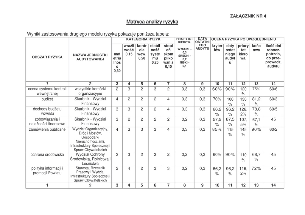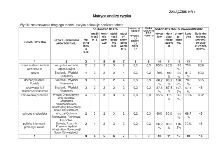 ZAŁ CZNIK NR 4 Matryca analizy ryzyka Wyniki zastosowania drugiego modelu ryzyka pokazuje poni sza tabela: KATEGORIA RYZYK OBSZAR RYZYKA 1 ocena systemu kontroli wewn trznej bud et dochody bud etu Powiatu zobowi zania i nale no ci finansowe zamówienia publiczne ochrona rodowiska polityka informacji i promocji Powiatu 1 NAZWA JEDNOSTKI AUDYTOWANEJ wra li kontr stabil stopi wo ola no e mat 0,15 wew. syste skom etria 0,20 mu pliko Ino 0,25 wania 0,10 0,30 DATA OCENA RYZYKA PO UWZGL DNIENIU PRIORYTET KIEROW. OSTATNI WYSOKI – 0,3 REDNI 0,2 NISKI 0,1 EGO kryter AUDYTU iów daty priory ko c ostat tet owa niego kiero audyt wa. u ilo dni robocz. potrzeb, do przeprowadz, audytu 2 wszystkie komórki organizacyjne Skarbnik - Wydział Finansowy Skarbnik - Wydział Finansowy Skarbnik - Wydział Finansowy 3 2 4 3 5 2 6 3 7 2 8 0,3 9 0,3 60% 90% 4 2 2 2 4 0,3 0,3 70% 3 3 2 2 4 0,3 0,3 3 2 2 2 2 0,2 0,3 Wydział Organizacyjny, Dróg i Mostów, Gospodarki Nieruchomo ciami, Infrastruktury Społecznej i Spraw Obywatelskich 4 3 3 3 4 0,3 0,3 66,2 % 57,5 % 85% 2 3 2 3 2 0,2 0,3 60% 90% 110 % 68,7 % 45 2 4 2 3 3 0,2 0,3 66,2 % 96,2 % 116, 2% 72% 45 3 4 5 6 7 8 9 10 11 12 13 14 Wydział Ochrony rodowiska, Rolnictwa i Le nictwa Starosta, Rzecznik Prasowy i Wydział Infrastruktury Społecznej i Spraw Obywatelskich 2 10 11 100 % 96,2 % 87,5 % 115 % 12 120 % 130 % 126, 2% 107, 5% 145 % 13 75% 81,2 % 78,8 % 67,1 % 90% 14 60/6 60/3 60/5 45 60/2 1 2 zarz dzanie zasobami Powiatowy Urz d Pracy, ludzkimi Wydział Organizacyjny 3 4 4 4 5 3 6 3 7 3 8 0,3 9 0,3 10 86,2 % 11 116, 2% 12 146, 2% 13 91,3 % 14 60/1 Wydział Organizacyjny pozostałe komórki funkcjonalne Wydział Finansowy i jednostki organizacyjne Powiatu Skarbnik - Wydział Finansowy Wydział Gospodarki Nieruchomo ciami Wydział O wiaty i Wychowania, o wiatowe jednostki organizacyjne Wydział Organizacyjny 2 2 2 2 3 0,1 0,3 50,2 % 80,2 % 90,2 % 56,2 % 45 2 1 1 1 2 0,1 0,3 35% 65% 75% 41,8 % 35 3 2 2 2 4 0,2 0,3 2 2 2 2 0,1 0,3 4 4 4 2 4 0,3 0,3 87,5 % 70,3 % 65,2 % 92,1 % 45 2 62,5 92,5 112, 5% % % 50% 80% 90% 2 2 2 2 2 0,1 0,3 50% 80% 90% 50,2 % 45 PCPR, PODGiK 2 2 2 3 3 0,1 0,3 58,7 % 88,7 % 98,7 % 61% 45 Wydział Komunikacji i Transportu Wydział Architektury i Budownictwa, Wydział Dróg i Mostów Wydział Finansowy 2 4 2 2 3 0,1 0,3 60% 90% 2 2 2 4 0,2 0,3 62,5 % 92,5 % 62,5 % 70,3 % 45 3 100 % 112, 5% 2 2 2 2 3 0,1 0,3 52% 82,5 % 92,5 % 57,1 % 45 bezpiecze stwo informatyczne gospodarka kasowa dotacje i subwencje nadzór wła cicielski regulaminy i systemy płacowe w o wiacie i placówkach wychowawczych Zarz dzanie systemami informatycznymi nadzór nad jednostkami podległymi ocena stanu rejestracji pojazdów inwestycje rozliczenie inwentaryzacji 117, 5% 147, 1% 35 90 45 ZAŁ CZNIK NR 4 Kolumna 10 - warto ci nadane * waga ryzyka w ka dej kategorii: przez 4 tj. max. warto Kolumna 11 - kolumna 10 + warto z kolumny 9 (0,1-10 %; 0,2-20 %; 0,3-30 %). Kolumna 12 - kolumna 11 + warto z kolumny 8 (0,1-10%; 0,2-20%; 0,3-30%). jak mo na nada . Kolumna 13 - sprawdzenie uzyskanych wyników procentowych do wspólnego mianownika. Algorytm oblicze jest nast puj cy: (koi. 12) 147,5 :160 (jest warto ci max. jak mo e uzyska w analizie ryzyka zadanie audytowe) = 0,921=92,1% Kolumna 14 - pozwala podporz dkowa poszczególnym zadaniom audytowym odpowiedni ilo 100% - i powy ej nadzwyczajny priorytet - 90 dni roboczych 100 % - 75 % najwy szy priorytet - 60 dni roboczych; 75 % - 50 % wysoki priorytet - 45 roboczych; 50 % - 30 % - redni priorytet - 35 dni roboczych poni ej 30 % - mały priorytet - 25 dni roboczych dni roboczych: