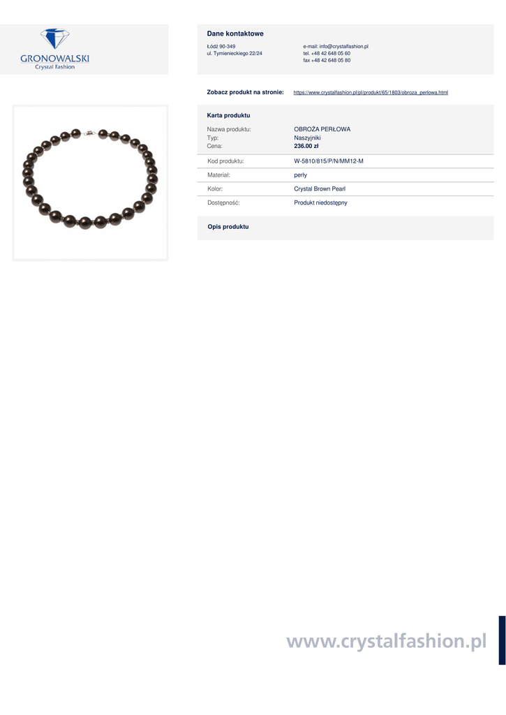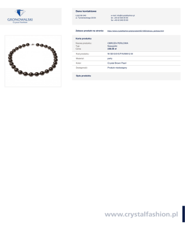 Powered by TCPDF (www.tcpdf.org) Dane kontaktowe Łódź 90-349 ul. Tymienieckiego 22/24 Zobacz produkt na stronie: e-mail: [email protected] tel. +48 42 648 05 60 fax +48 42 648 05 80 https://www.crystalfashion.pl/pl/produkt/65/1803/obroza_perlowa.html Karta produktu Nazwa produktu: Typ: Cena: OBROŻA PERŁOWA Naszyjniki 236.00 zł Kod produktu: W-5810/815/P/N/MM12-M Materiał: perły Kolor: Crystal Brown Pearl Dostępność: Produkt niedostępny Opis produktu