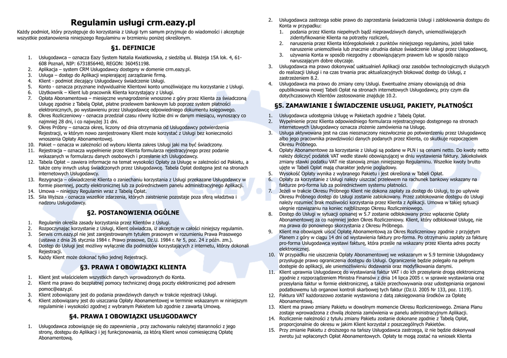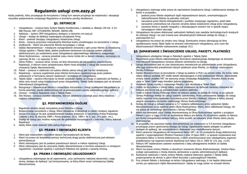 Regulamin usługi crm.eazy.pl 2. Usługodawca zastrzega sobie prawo do zaprzestania świadczenia Usługi i zablokowania dostępu do Konta w przypadku: 1. podania przez Klienta niepełnych bądź nieprawdziwych danych, uniemożliwiających zidentyfikowanie Klienta na potrzeby rozliczeń, 2. naruszenia przez Klienta któregokolwiek z punktów niniejszego regulaminu, jeżeli takie naruszenie uniemożliwia lub znacznie utrudnia dalsze świadczenie Usługi przez Usługodawcę, 3. używania Konta w sposób niezgodny z obowiązującym prawem lub w sposób rażąco naruszającym dobre obyczaje. Usługodawca ma prawo dokonywać uaktualnień Aplikacji oraz zasobów technologicznych służących do realizacji Usługi i na czas trwania prac aktualizacyjnych blokować dostęp do Usługi, z zastrzeżeniem 8.2. Usługodawca ma prawo do zmiany ceny Usługi. Ewentualne zmiany obowiązują od dnia opublikowania nowej Tabeli Opłat na stronach internetowych Usługodawcy, przy czym dla dotychczasowych Klientów zastosowanie znajduje 10.2. Każdy podmiot, który przystępuje do korzystania z Usługi tym samym przyjmuje do wiadomości i akceptuje wszystkie postanowienia niniejszego Regulaminu w brzmieniu poniżej określonym. §1. DEFINICJE 1. 2. 3. 4. 5. 6. 7. 8. 9. 10. 11. 12. 13. 14. 15. Usługodawca – oznacza Eazy System Natalia Kwiatkowska, z siedzibą ul. Błażeja 15A lok. 4, 61608 Poznań, NIP: 6731856440, REGON: 360451198. Aplikacja – system CRM Usługodawcy dostępny w domenie crm.eazy.pl. Usługa – dostęp do Aplikacji wspierającej zarządzanie firmą. Klient - podmiot zlecający Usługodawcy świadczenie Usługi. Konto - oznacza przyznane indywidualnie Klientowi konto umożliwiające mu korzystanie z Usługi. Użytkownik – Klient lub pracownik Klienta korzystający z Usługi. Opłata Abonamentowa – miesięczne wynagrodzenie wnoszone z góry przez Klienta za świadczoną Usługę zgodnie z Tabelą Opłat, płatne przelewem bankowym lub poprzez system płatności elektronicznych, po wystawieniu przez Usługodawcę odpowiedniego dokumentu księgowego. Okres Rozliczeniowy - oznacza przedział czasu równy liczbie dni w danym miesiącu, wynoszący co najmniej 28 dni, i co najwyżej 31 dni. Okres Próbny – oznacza okres, liczony od dnia otrzymania od Usługodawcy potwierdzenia Rejestracji, w którym nowo zarejestrowany Klient może korzystać z Usługi bez konieczności wnoszenia Opłaty Abonamentowej. Pakiet – oznacza w zależności od wyboru klienta zakres Usługi jaki ma być świadczony. Rejestracja – oznacza wypełnienie przez Klienta formularza rejestracyjnego przez podanie wskazanych w formularzu danych osobowych i przesłanie ich Usługodawcy. Tabela Opłat – zawiera informacje na temat wysokości Opłaty za Usługę w zależności od Pakietu, a także ceny innych usług świadczonych przez Usługodawcę. Tabela Opłat dostępna jest na stronach internetowych Usługodawcy. Rezygnacja – oświadczenie Klienta o zaniechaniu korzystania z Usługi przekazane Usługodawcy w formie pisemnej, poczty elektronicznej lub za pośrednictwem panelu administracyjnego Aplikacji. Umowa – niniejszy Regulamin wraz z Tabelą Opłat. Siła Wyższa - oznacza wszelkie zdarzenia, których zaistnienie pozostaje poza sferą władztwa i nadzoru Usługodawcy. §2. POSTANOWIENIA OGÓLNE 1. 2. 3. 4. 5. Regulamin określa zasady korzystania przez Klientów z Usługi. Rozpoczynając korzystanie z Usługi, Klient oświadcza, iż akceptuje w całości niniejszy regulamin. Serwis crm.eazy.pl nie jest zarejestrowanym tytułem prasowym w rozumieniu Prawa Prasowego (ustawa z dnia 26 stycznia 1984 r. Prawo prasowe, Dz.U. 1984 r. Nr 5, poz. 24 z późn. zm.). Dostęp do Usługi jest możliwy wyłącznie dla podmiotów korzystających z internetu, którzy dokonali Rejestracji. Każdy Klient może dokonać tylko jednej Rejestracji. §3. PRAWA I OBOWIĄZKI KLIENTA 1. 2. 3. 4. Klient jest właścicielem wszystkich danych wprowadzonych do Konta. Klient ma prawo do bezpłatnej pomocy technicznej drogą poczty elektronicznej pod adresem [email protected]. Klient zobowiązany jest do podania prawdziwych danych w trakcie rejestracji Usługi. Klient zobowiązany jest do uiszczania Opłaty Abonamentowej w terminie wskazanym w niniejszym regulaminie i wysokości zgodnej z wybranym Pakietem lub zgodnie z zawartą Umową. §4. PRAWA I OBOWIĄZKI USŁUGODAWCY 1. Usługodawca zobowiązuje się do zapewnienia , przy zachowaniu należytej staranności z jego strony, dostępu do Aplikacji i jej funkcjonowania, za którą Klient wnosi comiesięczną Opłatę Abonamentową. 3. 4. §5. ZAMAWIANIE I ŚWIADCZENIE USŁUGI, PAKIETY, PŁATNOŚCI 1. 2. 3. 4. 5. 6. 7. 8. 9. 10. 11. 12. 13. 14. 15. Usługodawca udostępnia Usługę w Pakietach zgodnie z Tabelą Opłat. Wypełnienie przez Klienta odpowiedniego formularza rejestracyjnego dostępnego na stronach internetowych Usługodawcy oznacza złożenie zamówienia na Usługę. Usługa aktywowana jest na czas nieoznaczony niezwłocznie po potwierdzeniu przez Usługodawcę albo jego pracownika prawdziwości danych podanych przez Klienta, co skutkuje rozpoczęciem Okresu Próbnego. Opłaty Abonamentowe za korzystanie z Usługi są podane w PLN i są cenami netto. Do kwoty netto należy doliczyć podatek VAT wedle stawki obowiązującej w dniu wystawienia faktury. Jakiekolwiek zmiany stawki podatku VAT nie stanowią zmian niniejszego Regulaminu. Wszelkie kwoty brutto ujęte w Tabeli Opłat mają charakter jedynie poglądowy. Wysokość Opłaty wynika z wybranego Pakietu i jest określona w Tabeli Opłat. Opłaty za korzystanie z Usługi należy uiszczać przelewem na rachunek bankowy wskazany na fakturze pro-forma lub za pośrednictwem systemu płatności. Jeżeli w trakcie Okresu Próbnego Klient nie dokona zapłaty za dostęp do Usługi, to po upływie Okresu Próbnego dostęp do Usługi zostanie zablokowany. Przez zablokowanie dostępu do Usługi należy rozumieć brak możliwości korzysta