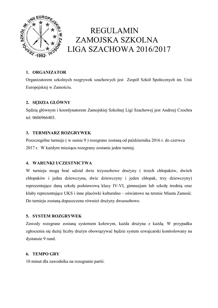 REGULAMIN ZAMOJSKA SZKOLNA LIGA SZACHOWA 2016/2017 1. ORGANIZATOR Organizatorem szkolnych rozgrywek szachowych jest Zespół Szkół Społecznych im. Unii Europejskiej w Zamościu. 2. SĘDZIA GŁÓWNY Sędzią głównym i koordynatorem Zamojskiej Szkolnej Ligi Szachowej jest Andrzej Czochra tel. 0606966403. 3. TERMINARZ ROZGRYWEK Poszczególne turnieje ( w sumie 9 ) rozegrane zostaną od października 2016 r. do czerwca 2017 r. W każdym miesiącu rozegrany zostanie jeden turniej. 4. WARUNKI UCZESTNICTWA W turnieju mogą brać udział dwie trzyosobowe drużyny ( trzech chłopaków, dwóch chłopaków i jedna dziewczyna, dwie dziewczyny i jeden chłopak, trzy dziewczyny) reprezentujące daną szkołę podstawową klasy IV-VI, gimnazjum lub szkołę średnią oraz kluby reprezentujące UKS i inne placówki kulturalno – oświatowe na terenie Miasta Zamość. Do turnieju zostaną dopuszczone również drużyny dwuosobowe. 5. SYSTEM ROZGRYWEK Zawody rozegrane zostaną systemem kołowym, każda drużyna z każdą. W przypadku zgłoszenia się dużej liczby drużyn obowiązywać będzie system szwajcarski kontrolowany na dystansie 9 rund. 6. TEMPO GRY 10 minut dla zawodnika na rozegranie partii. 7. PUNKTACJA W POSZCZEGÓLNYCH TURNIEJACH O zwycięstwie w całym cyklu Zamojskiej Szkolnej Ligi Szachowej decyduje suma zdobytych punktów za uzyskane miejsca w poszczególnych turniejach. Punkty za miejsca zdobyte w poszczególnych turniejach przyznawane będą wg następujących kryteriów: M I E JS C E PUNKTY I miejsce 20 punktów II miejsce 15 punktów III miejsce 10 punktów IV miejsce 9 punktów V miejsce 8 punktów VI miejsce 7 punktów VII miejsce 6 punktów VIII miejsce 5 punktów IX miejsce 4 punkty X miejsce 3 punkty W razie zdobycia przez drużyny równej ilości punktów w całym cyklu zawodów o miejscu decyduje większa liczba zdobytych pierwszych miejsc, drugich miejsc itp. W razie braku możliwości ustalenia końcowej klasyfikacji o miejscu decyduje suma małych punktów turniejowych zdobytych w poszczególnych turniejach. 8. NAGRODY Najlepsze trzy drużyny całego cyklu otrzymają puchary, dyplomy. Pozostałe drużyny otrzymają pamiątkowe dyplomy. Po zakończeniu wszystkich turniejów najlepsza szkoła otrzyma Puchar Przechodni oraz medale. 9. TURNIEJ I Turniej pierwszy rozegrany zostanie w środę 19 października 2016 r. o godz. 10.00. 10. MIEJSCE ROZGRYWEK Turniej rozegrany zostanie w sali europejskiej Zespołu Szkół Społecznych im. Unii Europejskiej w Zamościu, ul. Koszary 14. 11. POSTANOWIENIA KOŃCOWE # koszty organizacyjne Zamojskiej Szkolnej Ligi Szachowej pokrywają organizatorzy, # koszty przejazdów drużyn na miejsce zawodów pokrywa szkoła wystawiająca drużyny, # drużynę do zawodów zgłasza pisemnie szkoła ( nazwa i adres szkoły, imienny wykaz zawodników, pieczątka i podpis dyrektora szkoły), # zgłoszona drużyna jest pod opieką nauczyciela/pracownika szkoły, # nieobecność na zajęciach lekcyjnych uczniów biorących udział w zawodach usprawiedliwia dyrektor startującej szkoły lub placówki. Koordynator mgr Andrzej Czochra tel. 606966403