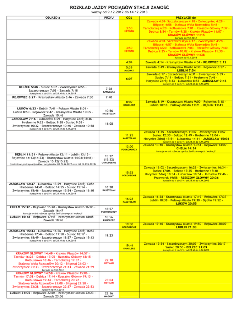 ROZKŁAD JAZDY POCIĄGÓW STACJI ZAMOŚĆ ważny od 9.12.2012 do 14.12.2013 ODJAZD z PRZYJ ODJ 3:50 HETMAN PRZYJAZD do Zawada 4:01- Szczebrzeszyn 4:18 - Zwierzyniec 4:29 Biłgoraj 4:58 - Stalowa Wola Rozwadów 5:48 Tarnobrzeg 6:20 - Kolbuszowa 7:01 - Rzeszów Główny 7:37 Dębica 8:54 - Tarnów 9:28 - Kraków Płaszów 11:07 KRAKÓW GŁÓWNY 11:15 kursuje do 9.II.2013 3:50 HETMAN Zawada 4:01- Szczebrzeszyn 4:17 - Zwierzyniec 4:28 Biłgoraj 4:57 - Stalowa Wola Rozwadów 5:48 Tarnobrzeg 6:20 - Kolbuszowa 7:03 - Rzeszów Główny 7:40 Dębica 9:25 - Tarnów 10:02 - Kraków Płaszów 11:30 KRAKÓW GŁÓWNY 11:38 kursuje od10.II.2013 4:04 Zawada 4:14 - Krasnystaw Miasto 4:54 - REJOWIEC 5:12 5:39 Zawada 5:49 - Krasnystaw Miasto 6:30 - Rejowiec 6:57 LUBLIN 7:54 Zawada 6:17 - Szczebrzeszyn 6:31 - Zwierzyniec 6:39 Susiec 7:11 - Bełżec 7:31 - Hrebenne 7:46 Horyniec Zdrój 8:33 - Lubaczów 8:53 - JAROSŁAW 9:46 MAGNAT 6:07 kursuje od 1 do 5.V i od 28.VI do 1.IX.2013 BEŁŻEC 5:48 - Susiec 6:07 - Zwierzyniec 6:55 Szczebrzeszyn 7:03 - Zawada 7:18 kursuje od 1 do 5.V i od 28.VI do 1.IX.2013 REJOWIEC 6:27 - Krasnystaw Miasto 6:46 - Zawada 7:30 7:28 KANCLERZ 7:40 8:09 KANCLERZ ŁUKÓW 6:23 - Dęblin 7:41 - Puławy Miasto 8:01 Lublin 8:50 - Rejowiec 9:47 - Krasnystaw Miasto 10:05 Zawada 10:46 JAROSŁAW 7:16 - Lubaczów 8:09 - Horyniec Zdrój 8:36 Hrebenne 9:23 - Bełżec 9:38 - Susiec 9:58 Zwierzyniec 10:32 - Szczebrzeszyn 10:40 - Zawada 10:58 Zawada 8:19 - Krasnystaw Miasto 9:00 - Rejowiec 9:18 Lublin 10:18 - Puławy Miasto 11:21 - DĘBLIN 11:41 10:56 KASZTELAN 11:08 kursuje od 1 do 5.V i od 28.VI do 1.IX.2013 11:25 KASZTELAN Zawada 11:35 - Szczebrzeszyn 11:49 - Zwierzyniec 11:57 Susiec 12:30 - Bełżec 12:49 - Hrebenne 13:04 Horyniec Zdrój 13:51 - Lubaczów 14:11 - JAROSŁAW 15:04 kursuje od 1 do 5.V i od 28.VI do 1.IX.2013 13:00 PODKOMORZY DĘBLIN 11:51 - Puławy Miasto 12:11 - Lublin 13:15 Rejowiec 14:13(14:23) - Krasnystaw Miasto 14:31(14:41) Zawada 15:12(15:22) (zmienione godziny odjazdów i przyjazdów 20,21.XI.2012 oraz 10,16,29.I.2013) Zawada 13:10 - Krasnystaw Miasto 13:51 - Rejowiec 14:09 CHEŁM 14:34 kursuje w dni robocze oprócz ferii zimowych i wakacji 15:22 (15:32) ODRODZENIE 15:52 ODRODZENIE Zawada 16:02 - Szczebrzeszyn 16:26 - Zwierzyniec 16:34 Susiec 17:06 - Bełżec 17:25 - Hrebenne 17:40 Horyniec Zdrój 18:34 - Lubaczów 18:54 - Jarosław 19:46 Przeworsk 19:58 - RZESZÓW GŁÓWNY 20:36 kursuje od 1 do 5.V i od 28.VI do 1.IX.2013 JAROSŁAW 12:37 - Lubaczów 13:29 - Horyniec Zdrój 13:54 Hrebenne 14:41 - Bełżec 14:55 - Susiec 15:14 Zwierzyniec 15:46 - Szczebrzeszyn 15:54 - Zawada 16:10 16:20 KASZTELAN kursuje od 1 do 5.V i od 28.VI do 1.IX.2013 16:28 KASZTELAN CHEŁM 15:32 - Rejowiec 15:48 - Krasnystaw Miasto 16:06 Zawada 16:47 kursuje w dni robocze oprócz ferii zimowych i wakacji LUBLIN 16:48 - Rejowiec 17:47 - Krasnystaw Miasto 18:05 Zawada 18:46 16:57 PODKOMORZY 18:56 KANCLERZ 19:00 ODRODZENIE JAROSŁAW 15:43 - Lubaczów 16:36 - Horyniec Zdrój 16:57 Hrebenne 17:44 - Bełżec 17:58 - Susiec 18:17 Zwierzyniec 18:49 - Szczebrzeszyn 18:57 - Zawada 19:13 Zawada 16:38 - Krasnystaw Miasto 17:19 - Rejowiec 17:37 Lublin 18:38 - Puławy Miasto 19:30 - Dęblin 19:52 ŁUKÓW 20:55 Zawada 19:10 - Krasnystaw Miasto 19:50 - Rejowiec 20:09 LUBLIN 21:08 19:23 kursuje od 1 do 5.V i od 28.VI do 1.IX.2013 19:44 KANCLERZ KRAKÓW GŁÓWNY 14:49 - Kraków Płaszów 14:57 Tarnów 16:26 - Dębica 17:05 - Rzeszów Główny 18:15 Kolbuszowa 18:46 - Tarnobrzeg 19:37 Stalowa Wola Rozwadów 20:12 - Biłgoraj 21:02 Zwierzyniec 21:33 - Szczebrzeszyn 21:43 - Zawada 21:59 22:10 HETMAN kursuje do 9.II.2013 KRAKÓW GŁÓWNY 14:58 - Kraków Płaszów 15:06 Tarnów 17:02 - Dębica 17:44 - Rzeszów Główny 19:13 Kolbuszowa 19:44 - Tarnobrzeg 20:22 Stalowa Wola Rozwadów 21:08 - Biłgoraj 21:58 Zwierzyniec 22:28 - Szczebrzeszyn 22:37 - Zawada 22:53 23:04 HETMAN kursuje od10.II.2013 LUBLIN 21:05 - Rejowiec 22:04 - Krasnystaw Miasto 22:23 Zawada 23:06 23:16 MAGNAT Zawada 19:54 - Szczebrzeszyn 20:09 - Zwierzyniec 20:17 Susiec 20:50 - BEŁŻEC 21:09 kursuje od 1 do 5.V i od 28.VI do 1.IX.2013