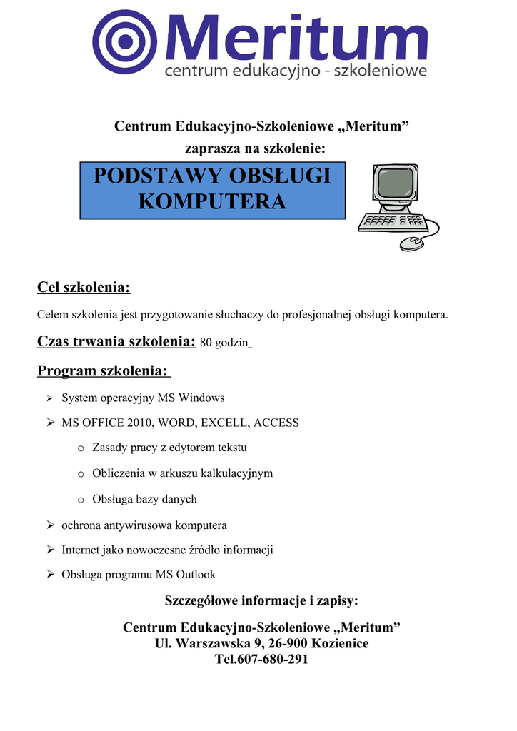 Centrum Edukacyjno-Szkoleniowe „Meritum” zaprasza na szkolenie: PODSTAWY OBSŁUGI KOMPUTERA Cel szkolenia: Celem szkolenia jest przygotowanie słuchaczy do profesjonalnej obsługi komputera. Czas trwania szkolenia: 80 godzin Program szkolenia: System operacyjny MS Windows MS OFFICE 2010, WORD, EXCELL, ACCESS o Zasady pracy z edytorem tekstu o Obliczenia w arkuszu kalkulacyjnym o Obsługa bazy danych ochrona antywirusowa komputera Internet jako nowoczesne źródło informacji Obsługa programu MS Outlook Szczegółowe informacje i zapisy: Centrum Edukacyjno-Szkoleniowe „Meritum” Ul. Warszawska 9, 26-900 Kozienice Tel.607-680-291