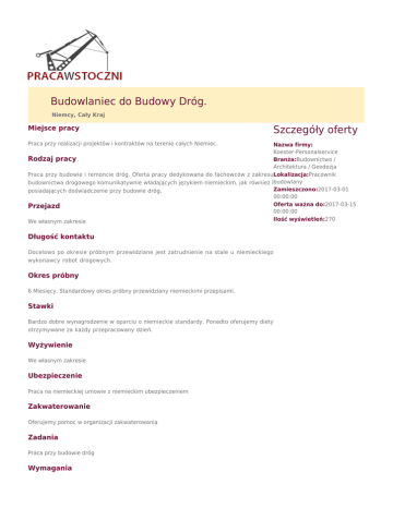 Budowlaniec do Budowy Dróg. Niemcy, Cały Kraj Miejsce pracy Praca przy realizacji projektów i kontraktów na terenie całych Niemiec. Szczegóły oferty Nazwa firmy: Koester-Personalservice Rodzaj pracy Branża:Budownictwo / Architektura / Geodezja Praca przy budowie i remoncie dróg. Oferta pracy dedykowana do fachowców z zakresuLokalizacja:Pracownik budownictwa drogowego komunikatywnie władających językiem niemieckim, jak również ibudowlany Zamieszczono:2017-03-01 posiadających doświadczenie przy budowie dróg. 00:00:00 Oferta ważna do:2017-03-15 Przejazd 00:00:00 Ilość wyświetleń:270 We własnym zakresie Długość kontaktu Docelowo po okresie próbnym przewidziane jest zatrudnienie na stale u niemieckiego wykonawcy robot drogowych. Okres próbny 6 Miesięcy. Standardowy okres próbny przewidziany niemieckimi przepisami. Stawki Bardzo dobre wynagrodzenie w oparciu o niemieckie standardy. Ponadto oferujemy diety otrzymywane za każdy przepracowany dzień. Wyżywienie We własnym zakresie Ubezpieczenie Praca na niemieckiej umowie z niemieckim ubezpieczeniem Zakwaterowanie Oferujemy pomoc w organizacji zakwaterowania Zadania Praca przy budowie dróg Wymagania ● ● ● ● ● Wykształcenie w kierunku budowy dróg Minimum komunikatywna znajomość języka niemieckiego Mile widziana umiejętność czytania rysunku technicznego Mile widziane dodatkowe uprawnienia do nadzoru lub kierowania robotami drogowymi Wymagane jest doświadczenie przy pracach drogowych Oferujemy ● ● ● Bardzo dobre wynagrodzenie w oparciu o niemieckie standardy Możliwość rozwoju zawodowego i awansu Pomoc w organizacji zakwaterowania w pobliżu placu budowy Czas pracy Normowany niemieckim kodeksem pracy. Umowa na pełen etat. Istnieje możliwość nadgodzin.