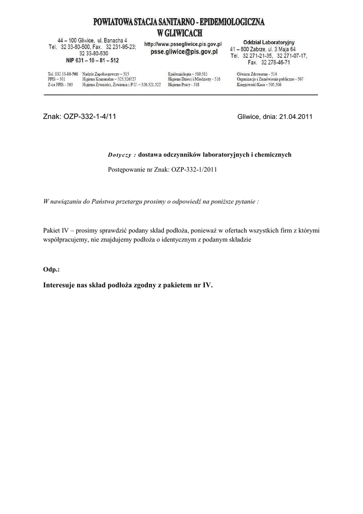 Znak: OZP-332-1-4/11 Gliwice, dnia: 21.04.2011 Do ty cz y : dostawa odczynników laboratoryjnych i chemicznych Postępowanie nr Znak: OZP-332-1/2011 W nawiązaniu do Państwa przetargu prosimy o odpowiedź na poniŜsze pytanie : Pakiet IV – prosimy sprawdzić podany skład podłoŜa, poniewaŜ w ofertach wszystkich firm z którymi współpracujemy, nie znajdujemy podłoŜa o identycznym z podanym składzie Odp.: Interesuje nas skład podłoŜa zgodny z pakietem nr IV.