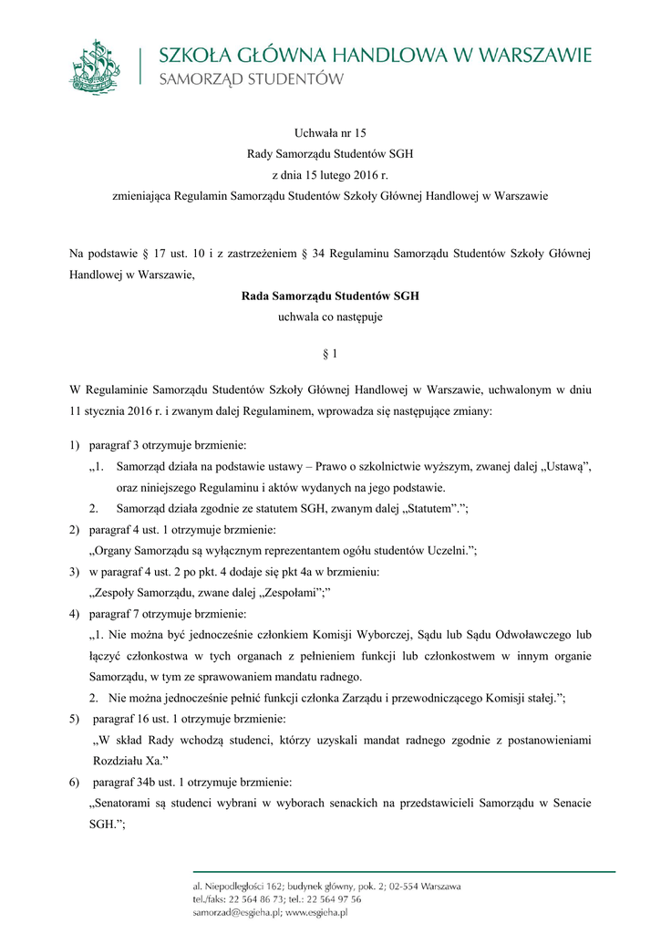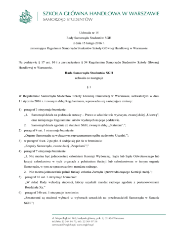 Uchwała nr 15 Rady Samorządu Studentów SGH z dnia 15 lutego 2016 r. zmieniająca Regulamin Samorządu Studentów Szkoły Głównej Handlowej w Warszawie Na podstawie § 17 ust. 10 i z zastrzeżeniem § 34 Regulaminu Samorządu Studentów Szkoły Głównej Handlowej w Warszawie, Rada Samorządu Studentów SGH uchwala co następuje §1 W Regulaminie Samorządu Studentów Szkoły Głównej Handlowej w Warszawie, uchwalonym w dniu 11 stycznia 2016 r. i zwanym dalej Regulaminem, wprowadza się następujące zmiany: 1) paragraf 3 otrzymuje brzmienie: „1. Samorząd działa na podstawie ustawy – Prawo o szkolnictwie wyższym, zwanej dalej „Ustawą”, oraz niniejszego Regulaminu i aktów wydanych na jego podstawie. 2. Samorząd działa zgodnie ze statutem SGH, zwanym dalej „Statutem”.”; 2) paragraf 4 ust. 1 otrzymuje brzmienie: „Organy Samorządu są wyłącznym reprezentantem ogółu studentów Uczelni.”; 3) w paragraf 4 ust. 2 po pkt. 4 dodaje się pkt 4a w brzmieniu: „Zespoły Samorządu, zwane dalej „Zespołami”;” 4) paragraf 7 otrzymuje brzmienie: „1. Nie można być jednocześnie członkiem Komisji Wyborczej, Sądu lub Sądu Odwoławczego lub łączyć członkostwa w tych organach z pełnieniem funkcji lub członkostwem w innym organie Samorządu, w tym ze sprawowaniem mandatu radnego. 2. Nie można jednocześnie pełnić funkcji członka Zarządu i przewodniczącego Komisji stałej.”; 5) paragraf 16 ust. 1 otrzymuje brzmienie: „W skład Rady wchodzą studenci, którzy uzyskali mandat radnego zgodnie z postanowieniami Rozdziału Xa.” 6) paragraf 34b ust. 1 otrzymuje brzmienie: „Senatorami są studenci wybrani w wyborach senackich na przedstawicieli Samorządu w Senacie SGH.”; 7) paragraf 34c ust. 1 otrzymuje brzmienie: „Członkiem Rady Kolegium jest student wybrany w wyborach kolegialnych na przedstawiciela Samorządu w danej Radzie Kolegium.”; 8) w paragrafie 39 ust. 1 dodaje się pkt 15 w brzmieniu: „spraw studenckich” 9) paragraf 41 ust. 1 pkt 2a otrzymuje brzmienie: „z własnej inicjatywy lub na wniosek Zarządu, powołuje, rozwiązuje i znosi niestałe Komisje oraz powołuje i odwołuje przewodniczących Komisji” 10) w paragrafie 41 ust. 1 po pkt 2b dodaje się ustęp 2c w brzmieniu: „z własnej inicjatywy lub na wniosek przewodniczącego Komisji, powołuje, rozwiązuje i znosi Zespoły oraz powołuje i odwołuje przewodniczących Zespołów i wiceprzewodniczących Komisji” 11) w paragrafie 41 ust. 1 po pkt 3b dodaje się ustęp 3c w brzmieniu: „prowadzi nadzór nad działalnością Zespołów;” 12) w paragrafie 41 ust. 1 po pkt. 8 dodaje się pkt. 8a w brzmieniu: „ogłasza tekst jednolity Regulaminu i aktów prawnych wydanych na jego podstawie” 13) w paragrafie 41 po ust. 1 dodaje się ust. 1a w brzmieniu: „Przewodniczący wydaje zarządzenia, obwieszczenia, komunikaty i decyzje w zakresie objętym swoimi kompetencjami i uprawnieniami.” 14) paragraf 46 otrzymuje tytuł „Komisje” i brzmienie: „1. Komisja jest podstawową jednostką organizacyjną prowadzącą bieżącą działalność Samorządu w obszarach przypisanych jej w zakresie określonym przez Przewodniczącego. 2. Przewodniczący powołując Komisję, powołuje prezydium Komisji. 3. Prezydium Komisji stanowią przewodniczący i wiceprzewodniczący Komisji. 4. Przewodniczący Komisji: 1) kieruje działaniami Komisji; 2) nadzoruje działalność wiceprzewodniczących Komisji; 3) nadzoruje działalność Zespołów realizujących działalność Komisji; 4) odpowiada za działalność Samorządu prowadzoną przez Komisję; 5) w porozumieniu z Przewodniczącym powołuje i odwołuje członków Komisji. 5. Wiceprzewodniczący Komisji kieruje działaniami Komisji w zakresie powierzonym przez przewodniczącego Komisji i odpowiada za nie. 6. Zarząd może uchwalić regulamin Komisji na wniosek jej przewodniczącego.” 15) paragraf 47 otrzymuje tytuł „Komisje stałe” i brzmienie: „1. Komisje stałe prowadzą bieżącą działalność Samorządu w obszarze akademików, pomocy socjalnej, stypendiów i rozpatrywania odwołań. 2. Komisjami stałymi są: 1) Komisja ds. Akademików, 2) Komisja ds. Stypendiów, 3) Odwoławcza Komisja ds. Stypendiów. 3. Prace Komisji stałych oraz działania ich przewodniczących są stale nadzorowane przez Przewodniczącego oraz członka Zarządu właściwego ds. akademików, pomocy socjalnej, stypendiów i rozpatrywania odwołań.” 16) paragraf 48 otrzymuje tytuł „Zespoły” i brzmienie: „1. Zespół realizuje bieżącą działalność Komisji w zakresie powierzonym mu przez Przewodniczącego w porozumieniu z przewodniczącymi odpowiednich Komisji. 2. Przewodniczący powołując Zespół, powołuje przewodniczącego Zespołu spośród wiceprzewodniczących odpowiednich Komisji lub innych kandydatów wskazanych przez przewodniczących odpowiednich Komisji. 3. Przewodniczący Zespołu: 1) kieruje działaniami Zespołu; 2) odpowiada za działalność Komisji realizowaną przez Zespół; 3) w porozumieniu z Przewodniczącym i przewodniczącymi odpowiednich Komisji powołuje i odwołuje członków Zespołu. 4. Zarząd może uchwalić regulamin Zespołu na wniosek jego przewodniczącego.” 17) paragraf 49 otrzymuje tytuł „Rada Gabinetowa” i brzmienie: „1. Rada Gabinetowa jest organem doradczym Zarządu. 2. Przewodniczący lub wyznaczony przez niego członek Zarządu zwołuje i prowadzi posiedzenia Rady Gabinetowej. 3. W skład Rady Gabinetowej wchodzą: 1) członkowie Zarządu; 2) przewodniczący Komisji; 3) Pełnomocnicy; 4) przewodniczący Zespołów; 5) wiceprzewodniczący Komisji; 6) osoby zaproszone przez Przewodniczącego. 4. Przewodniczący może ustalić listę osób stale zapraszanych na posiedzenia Rady Gabinetowej, o której informuje Radę Gabinetową.” 18) w paragrafie 57 po ust. 1 dodaje się ust. 1a w brzmieniu: „Członek Zarządu właściwy do spraw studenckich aktywnie wspiera działania Rzecznik