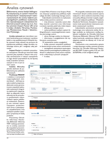 BIBLIOTEKA Analiza cytowań w bazie Web of Science oraz Scopus. Może ona dotyczyć pojedynczej publikacji, bądź całego dorobku naukowego danego autora. Indywidualne zamówienie na wykonanie takiej analizy powinno zawierać: • imię (imiona) i nazwisko autora (lub listę nazwisk autorów) oraz informacje o zmianie nazwiska, jeżeli taka miała miejsce • afiliację pierwszego autora • wykaz publikacji z pełnym opisem bibliograficznym z wyszczególnieniem nazwiska pierwszego autora • okres, którego analiza ma dotyczyć • informację o uwzględnieniu lub wykluczeniu autocytowań. W zestawienie można uwzględnić: • liczbę cytowań wszystkich publikacji w dostarczonym przez autora zamówieniu • szczegółowe zestawienie zawierające liczbę cytowań poszczególnych publikacji podanych w załączonym przez autora wykazie wraz z informacją o pracach cytujących • h-index. Liczba cytowań jest miernikiem wartości konkretnej pracy naukowej i wyników badań w niej opublikowanych.Wskaźnik liczby cytowań może odnosić się zarówno do pojedynczej publikacji, całego dorobku naukowego autora, jak i osiągnięć całej jednostki. Impact Factor to wskaźnik cytowalności czasopisma. Określa go stosunek liczby cytowań, jaką uzyskały w danym roku artykuły zamieszczone w danym czasopiśmie w ciągu dwóch poprzednich lat, do łącznej liczby artykułów zamieszczonych w nim w tym samym czasie. Indeks Hirscha określa zdolność do publikowania prac cyklicznie cytowanych. Punktacja MNiSW – ustalana w corocznych rozporządzeniach ministerialnych – definiuje zasady na jakich przeprowadzana jest ocena parametryczna wszystkich jednostek naukowych. Integralną częścią tych rozporządzeń są załączniki, które odnoszą się do procedury punktowania różnoScopus rodnych typów publikacji naukowych. Zawierają one również rejestr czasopism punktowanych (wraz z późniejszymi uzupełnieniami) oraz wykazami tytułów czasopism i przyznaną im liczbą punktów. Pracownicy Ośrodka Informacji Naukowej Biblioteki Głównej WAT realizują zamówienia na analizę cytowań dla wszystkich pracowników Wojskowej Akademii Technicznej.Analiza cytowań przeprowadzana jest Web of Science 32 W przypadku niedostarczenia wyżej wymienionych danych, analiza zostanie oparta wyłącznie o dane osobowe (nazwisko, imię) oraz jedną afiliację (również w języku angielskim), czyli wyłącznie publikacji – Wojskowa Akademia Techniczna. Zawężenie wyszukiwania może spowodować nieznaczne zaniżenie ostatecznych wyników. Indywidualne zamówienia pracownika naukowego oraz wykonanie analizy dla całego wydziału są realizowane według kolejności nadsyłania do Ośrodka Informacji Naukowej Biblioteki Głównej WAT. Czas takiej kwerendy uzależniony będzie od jej objętości, jednak nie dłuższy niż 14 dni od dnia wpływu. Zamówienia oraz ewentualne pytania i uwagi dotyczące analizy cytowań prosimy kierować do Ośrodka Informacji Naukowej BG WAT (I piętro, pokój 215), tel.: /22/ 261839396; e-mail: [email protected] Anna Peszel Fot. Anna Peszel Bibliometria, zwana kiedyś bibliografią statystyczną, to system metod matematycznych i statystycznych wykorzystywanych do oceny wpływu poszczególnych publikacji naukowych. Do najważniejszych wskaźników bibliometrycznych zalicza się m.in.: liczbę cytowań, Impact Factor (IF) oraz h-index (Indeks Hirscha), Punktację Ministerstwa Nauki i Szkolnictwa Wyższego. GŁOS AKADEMICKI 02/2015