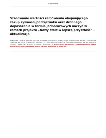 PCPR Gliwice Szacowanie wartości zamówienia obejmującego zakup żywności/poczęstunku oraz drobnego doposażenia w formie jednorazowych naczyń w ramach projektu „Nowy start w lepszą przyszłość” aktualizacja Powiatowe Centrum Pomocy Rodzinie w Gliwicach w związku z ogłoszonym szacowaniem wartości zamówienia obejmującego zakup żywności/poczęstunku oraz drobnego doposażenia w formie jednorazowych naczyń w ramach projektu „Nowy start w lepszą przyszłość” informuje, że koniecznym warunkiem szczegółowym jest także posiadanie przez Sprzedawcę punktu odbioru produktów w Gliwicach. 1