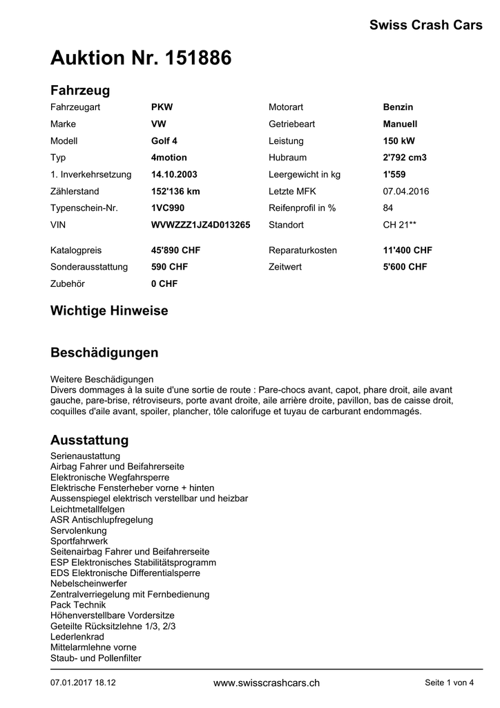 Swiss Crash Cars Auktion Nr. 151886 Fahrzeug Fahrzeugart PKW Motorart Benzin Marke VW Getriebeart Manuell Modell Golf 4 Leistung 150 kW Typ 4motion Hubraum 2'792 cm3 1. Inverkehrsetzung 14.10.2003 Leergewicht in kg 1'559 Zählerstand 152'136 km Letzte MFK 07.04.2016 Typenschein-Nr. 1VC990 Reifenprofil in % 84 VIN WVWZZZ1JZ4D013265 Standort CH 21** Katalogpreis 45'890 CHF Reparaturkosten 11'400 CHF Sonderausstattung 590 CHF Zeitwert 5'600 CHF Zubehör 0 CHF Wichtige Hinweise Beschädigungen Weitere Beschädigungen Divers dommages à la suite d'une sortie de route : Pare-chocs avant, capot, phare droit, aile avant gauche, pare-brise, rétroviseurs, porte avant droite, aile arrière droite, pavillon, bas de caisse droit, coquilles d'aile avant, spoiler, plancher, tôle calorifuge et tuyau de carburant endommagés. Ausstattung Serienaustattung Airbag Fahrer und Beifahrerseite Elektronische Wegfahrsperre Elektrische Fensterheber vorne + hinten Aussenspiegel elektrisch verstellbar und heizbar Leichtmetallfelgen ASR Antischlupfregelung Servolenkung Sportfahrwerk Seitenairbag Fahrer und Beifahrerseite ESP Elektronisches Stabilitätsprogramm EDS Elektronische Differentialsperre Nebelscheinwerfer Zentralverriegelung mit Fernbedienung Pack Technik Höhenverstellbare Vordersitze Geteilte Rücksitzlehne 1/3, 2/3 Lederlenkrad Mittelarmlehne vorne Staub- und Pollenfilter 07.01.2017 18.12 www.swisscrashcars.ch Seite 1 von 4 Auktion Nr. 151886 Swiss Crash Cars Ausstattung Warnsummer für Licht Lenkrad verstellbar Kopfstützen vorne und hinten ABS und EBV Elektr. Bremskraftverteilung Dachantenne Sportsitze vorne Lendenwirbelstützen Vordersitze Radio/ Tonband Gamma Kindersitz-Vorbereitung Isofix Climatronic (Klimaautomat) Getönte Scheiben Keine Gewähr auf die Angaben der Serienausstattungen Sonderausstattung Metallic-Lackierung Fotos 07.01.2017 18.12 www.swisscrashcars.ch Seite 2 von 4 Auktion Nr. 151886 07.01.2017 18.12 Swiss Crash Cars www.swisscrashcars.ch Seite 3 von 4 Auktion Nr. 151886 07.01.2017 18.12 Swiss Crash Cars www.swisscrashcars.ch Seite 4 von 4
