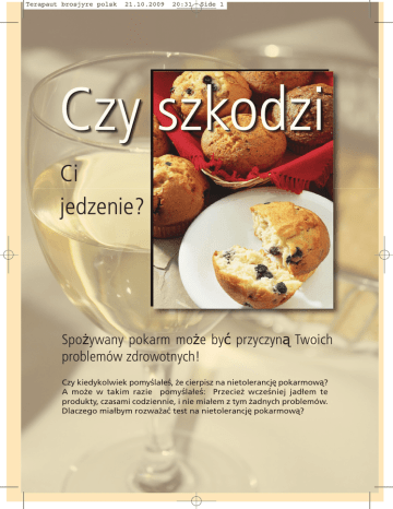 Terapaut brosjyre polsk 21.10.2009 20:31 Side 1 Czy szkodzi Ci jedzenie? Spożywany pokarm może być przyczyną Twoich problemów zdrowotnych! Czy kiedykolwiek pomyślałeś, że cierpisz na nietolerancję pokarmową? A może w takim razie pomyślałeś: Przecież wcześniej jadłem te produkty, czasami codziennie, i nie miałem z tym żadnych problemów. Dlaczego miałbym rozważać test na nietolerancję pokarmową? Terapaut brosjyre polsk 21.10.2009 20:32 Side 2 Czy kiedykolwiek pomyślałeś, że cierpisz na nietolerancję pokarmową? A może w takim razie pomyślałeś: Przecież wcześniej jadłem te produkty, czasami codziennie, i nie miałem z tym żadnych problemów. Dlaczego miałbym rozważać test na nietolerancję pokarmową? Wzmianki o nietolerancjach pokarmowych pojawiły się po raz pierwszy 100 lat temu, w roku 1905. Dr Frances Hare, brytyjski lekarz, praktykujący medycynę środowiskową, znalazł powiązanie między szczególnymi dolegliwościami, takimi jak zapalenie stawów czy egzema, a jedzeniem. Odkrył także, że w przypadku odstawienia wywołującego problemy pokarmu , objawy nagle łagodnieją. Wielu pionierów podążyło w ślady dr. Hare’a. Zainteresowanie alergiami i nietolerancjami pokarmowymi jest nadal duże. Wiadomo, iż jedzenie wywołuje w ciele wiele zaburzeń, które powstają w wyniku działania różnorodnych mechanizmów. Pewnie znasz kogoś, kto nie trawi produktów mleczarskich. Zaburzenie takie nazywamy nietolerancją laktozy, która powstaje, kiedy ciało nie potrafi produkować enzymu laktazy lub produkuje go zbyt mało. Inne pokarmy, takie jak czekolada, zawierają substancje chemiczne, które mogą mieć wpływ na nasz nastrój. Pewnie słyszałeś o „czekoladoholikach”, albo może nawet sam nim jesteś. Nie są to alergie pokarmowe. Alergie pokarmowe to wywołane przez jedzenie zaburzenia, które powiązać można bezpośrednio z układem odpornościowym. Porozmawiajmy krótko o układzie odpornościowym, który stanowi znakomity i bardzo złożony element ciała człowieka. Zacznij od wyobrażenia sobie układu odpornościowego jako strażnika twierdzy, który ma cię chronić przed intruzami. W przypadki alergii i nietolerancji, intruzów tych określamy mianem alergenów. Nazywają się tak, ponieważ wywołują reakcję alergiczną lub wzmożoną odpowiedź immunologiczną. Strażnik posiada wiele możliwości ataku, w tym przeciwciała. Przeciwciała odpowiadają, usuwając szkodliwą substancję, i rozpoczynają łańcuch reakcji, prowadzących do usunięcia alergenów. Twoje objawy to sposób, w jaki ciało informuje o zachodzących w nim reakcjach. 2 Terapaut brosjyre polsk 21.10.2009 20:32 Side 3 Organizm człowieka posiada pięć różnych przeciwciał. Z alergiami pokarmowymi wiąże się zazwyczaj przeciwciała IgE i IgG. IgE przyłączają się do komórek układu odpornościowego, zwłaszcza mastocytów i bazofili, zawsze powodując uwolnienie histaminy. Histamina z kolei wywołuje rozszerzenie naczyń włosowatych i łagodne napięcie mięśni, które ostatecznie przynosi rezultat w postaci twoich własnych objawów. IgE reagują prędko i szybko prowadzą do powstawania takich objawów, jak katar, trudności w oddychaniu czy wysypka. IgG z kolei reagują wolniej. Objawy mogą rozwinąć się dopiero po trzech tygodniach, dlatego często określa się je mianem reakcji opóźnionej. Ponadto IgG mogą przyłączyć się bezpośrednio do alergenu. Takie połączenia antygenów i przeciwciał mogą odkładać się w tkankach całego ciała, powodując mnóstwo objawów, jak np. ból kolana. Ostatnie badania wykazały nawet, iż w pewnych przypadkach IgG mogą reagować w podobny sposób, co IgE. Alergie i nietolerancje pokarmowe mogą być zmartwieniem dla większości ludzi. Niestety nadal wielu lekarzy nie widzi związku między złym zdrowiem a spożywanymi pokarmami. Kiedy nieznana jest przyczyna choroby, ciało nadal cierpi. Przypadki alergii pokarmowych są wszędzie tematem dyskusji. Prawie 10 lat temu ponad 10% mieszkańców USA dotkniętych było immunologiczną nadwrażliwością pokarmową. Liczba alergenów pokarmowych stale rośnie. Wraz z tym wzrostem wskazania kliniczne obejmują coraz bardziej złożone objawy. Niestety trudno jest oszacować liczbę alergii i nietolerancji pokarmowych, ze względu na różnorodność objawów, występujących u różnych osób. Rozmaite okoliczności poszczególnych testów oraz różne procedury testowania mogą dać różnorodne wyniki. Dla tych z nas, którzy dotknięci są jednym lub wieloma objawami, albo licznymi dolegliwościami, rozwiązanie liczy się bardziej, niż sam test. Objawy wszystkich typów nietolerancji pokarmowych mogą być tak różnorodne i wielowymiarowe, że nieomal napadają i „okupują” umysł. Każdy człowiek jest unikalny i może przedstawiać różne objawy nietolerancji pokarmowej, w porównaniu z innymi. Poniżej znajdziesz listę objawów, stworzoną, by pomóc uświadomić Cię, że Twoje objawy mogą stanowić nadwrażliwą reakcję na pokarm. Jednakże należy pamiętać, iż objawy te można również skojarzyć z innymi schorzeniami. O różnicach decyduje jedynie solidny wywiad i badanie lekarskie oraz testy laboratoryjne. Układ trawienny • Skurcze żołądka • Bóle żołądka • Nieświeży oddech • Ulewanie • Zgaga po posiłku • Gazy • Swędzenie podniebienia • Wymioty Układ nerwowy • Niepokój • Dezorientacja • Depresja • Hiperaktywność • Problemy z koncentracją • Agresywność • Drażliwość • Nerwowość 3 Terapaut brosjyre polsk 21.10.2009 20:32 Side 4 Mięśnie i stawy • Zapalenie stawów • Bóle stawów • Bóle mięśni • Osłabienie mięśni Układ moczowo-płciowy • Moczenie • Częste oddawanie moczu • Częsta potrzeba oddawania moczu • Swędzenie pochwy • Upławy • PMS Układ oddechowy • Astma • Rozpieranie w klatce piersiowej • Przewlekły kaszel 