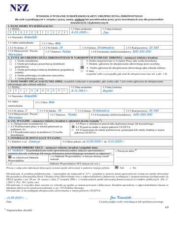 WNIOSEK O WYDANIE EUROPEJSKIEJ KARTY UBEZPIECZENIA ZDROWOTNEGO dla osób wyjeżdżających w związku z pracą, nauką, studiami lub poszukiwaniem pracy przez bezrobotnych oraz dla pracowników konsularnych i dyplomatycznych 1. DANE OSOBY WYJEŻDŻAJĄCEJ: 1.1 PESEL: 1.2 Data urodzenia: 1.3 Imię (imiona): 9 5 0 3 0 8 1 1 2 2 3 8-03-1995 r. Jan 1.4 Nazwisko: Kowalski 1.5 Adres zamieszkania 1.5.1 Ulica: Miła 1.5.2 Nr domu: 2 1.5.6 Miejscowość / Poczta: 1.5.3 Nr lokalu: 15 Warszawa 1.5.7 Państwo: Polska 1.5.4 Gmina: Śródmieście 1.5.5 Kod pocztowy: 01-100 1.5.8 Ewentualny telefon kontaktowy: 500-100-200 2. TYTUŁ DO UBEZPIECZENIA ZDROWOTNEGO W NARODOWYM FUNDUSZU ZDROWIA - zaznaczyć właściwy kwadrat: □ 1. Osoba zatrudniona; □ 6. Osoba zarejestrowana w Urzędzie Pracy jako osoba bezrobotna □ 2. Osoba prowadząca pozarolniczą działalność □ 7. Student, zgłoszony do ubezpieczenia zdrowotnego przez uczelnię; gospodarczą; 8. Osoba zgłoszona do ubezpieczenia zdrowotnego jako członek rodziny; □ 3. Osoba prowadząca rolniczą działalność gospodarczą □ 9. Inne: …………………………………………………………………. (rolnik); (wypełnić tylko w przypadku gdy tytuł do ubezpieczenia inny niż w pkt. 1-8) □ 4. Osoba pobierająca świadczenia emerytalne; □ 5. Osoba pobierająca rentę; 3. DANE OSOBY OPŁACAJĄCEJ SKŁADKĘ: (wypełnić wyłącznie w przypadku, gdy osobą z pkt. 1 jest osoba zgłoszona do ubezpieczenia zdrowotnego jako członek rodziny) 3.1 PESEL: 3.2 Data urodzenia: 3.3 Imię (imiona): 6 3 1 1 0 8 0 0 0 0 1 8-11-1963 r. Bogdan 3.4 Nazwisko: Kowalski 3.6 Adres 3.5.1 Ulica: Miła zamieszkania: 3.5.2 Nr domu: 2 3.5.3 Nr lokalu: 15 3.5.4 Gmina: Śródmieście 3.5.5 Kod pocztowy: 01-100 3.5.6 Miejscowość / Poczta: 3.5.7 Państwo: Polska 3.5.8 Ewentualny telefon kontaktowy: 600-200-300 Warszawa 4. CEL WYJAZDU - zaznaczyć właściwy kwadrat w zależności od celu wyjazdu 1): □ 4.1 Delegowanie na podstawie A1; □ 4.4 Praca w charakterze pracownika dyplomatycznego lub konsularnego; □ 4.2 Wykonywanie pracy w dwóch państwach na 4.5 Wyjazd na studia w innym państwie UE/EFTA; podstawie A1; □ 4.6 Uczęszczanie do szkoły podstawowej, gimnazjum lub szkoły średniej w innym □ 4.3 Poszukiwanie pracy na podstawie U2 (osoba państwie UE/EFTA; bezrobotna); 5. INFORMACJE DOTYCZACE WYJAZDU: 5.1 Państwo /(-a): Szwecja 5.2 Okres pobytu: od 11.05.2015 r. do 11.11.2015 r. 6. SPOSÓB ODBIORU EKUZ – zaznaczyć właściwy kwadrat i uzupełnić dane: 6.1 Osobiście / Za pośrednictwem osoby upoważnionej (należy załączyć upoważnienie z numerem dowodu osobistego lub innego dokumentu potwierdzającego tożsamość ze zdjęciem)*: □ w Oddziale Wojewódzkim, w którym złożony został we właściwym Oddziale wniosek Wojewódzkim □ w …………………. ……………… Oddziale Wojewódzkim NFZ (innym niż ww.) Proszę o załączenie informacji dotyczącej systemu opieki zdrowotnej w państwie mojego pobytu: □ Pocztą na adres 2) ….…………………………………………………. ….………………………………………………….. Tak □ Nie Oświadczam, iż zostałem poinformowany / zapoznałem się (załącznik nr 1)* z zasadami w sprawie utraty uprawnień do świadczeń opieki zdrowotnej dla posiadacza Europejskiej Karty Ubezpieczenia Zdrowotnego oraz o odpowiedzialności finansowej wynikającej z nieuprawnionego posługiwania się EKUZ zgodnie z art. 50 ust. 16 ustawy z dnia 27 sierpnia 2004 r. o świadczeniach opieki zdrowotnej finansowanych ze środków publicznych (Dz. U. z 2015 r. Poz. 581 z późn. zm.) Oświadczam, iż wszystkie dane zawarte we wniosku są zgodne ze stanem prawnym i faktycznym. Zostałem uprzedzony o odpowiedzialności karnej za składanie fałszywych zeznań przewidzianej w art. 233 Kodeksu Karnego. Oświadczam, iż nie podlegam ubezpieczeniu zdrowotnemu w innym państwie UE/EFTA. …11.05.2015 r. … Data *) ……………………… Jan Kowalski…………………………. Czytelny podpis osoby wnioskującej lub opiekuna prawnego 1/3 Niepotrzebne skreślić Zasady wypełniania pkt. 4 i pkt. 6 1) W pkt. 4 należy zaznaczyć cel wyjazdu Pkt. 4.1 zaznacza: pracownik najemny, który został oddelegowany przez pracodawcę do pracy w innym państwie UE/EFTA – na podstawie A1; dotyczy to również pracowników transportu międzynarodowego, żołnierzy zawodowych, tzw. funkcjonariuszy służb mundurowych, tj. m.in. Policji, Straży Granicznej, Służby Celnej, Agencji Wywiadu, Agencji Bezpieczeństwa Wewnętrznego, Biura Bezpieczeństwa Narodowego, Biura Ochrony Rządu, Państwowej Straży Pożarnej oraz Służby Więziennej, jak również sędziów i prokuratorów oraz osoby duchowne. osoba prowadząca działalność gospodarczą na terytorium RP, udająca się do innego państwa wykonywać podobną działalność, tzw. samodelegowanie – na podstawie A1; dotyczy to również osoby prowadzącej działalność gospodarczą z zakresu transportu międzynarodowego, Pkt. 4.2 zaznacza: pracownik najemny lub osoba prowadząca działalność gospodarczą, która wykonuję pracę w dwóch lub więcej państwach UE/EFTA na podstawie A1 np. dwóch pracodawców, dwie działalności; Pkt. 4.3 zaznacza osoba zarejestrowana w Urzędzie Pracy, która udaje się do innego państwa UE/EFTA w celu poszukiwania tam pracy na podstawie formularza U2; Pkt. 4.4 zaznacza pracownik dyplomatyczny lub konsularny oddelegowany do pracy na placówce; Pkt. 4.5 zaznacza student, który udaje się na studia do innego państwa UE/EFTA Pkt. 4.6 zaznacza uczeń, który udaje się szkoły podstawowej, gimnazjum lub szkoły średniej w innym państwie UE/EFTA; 2) Pkt. 6 - EKUZ może być wysłana na adres zamieszkania tylko w przypadku, gdy wniosek złożony był osobiście lub za pośrednictwem poczty. Wniosek złożony za pośrednictwem poczty elektronicznej, który nie zawiera podpisu, wymaga osobistego od