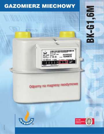 wyd.12.2012 R BK-G1,6 ymowe sy neod Odporny na magne BK-G1,6M GAZOMIERZ MIECHOWY Dane techniczne A E DN C akres omiarowy iczydła 99999 999 m róg rozruchu 3 dm Ko or 35 12IBKG1,613012345678 BK-G1,6M budowa sta owa ł czona na zakładkę 3 2,5 m /h Q Q min 0,016 m3/h V 1,2 dm 3 P max 0,1 bar "T" max DE-07-MI002-PTB005 class 1,5 t m -25°C...+55°C Nr. fabr. t g -25°C...+55°C M12 0102 INTERGAZ 12345678 NG-4701BR0171 EN 1359:1998/A1:2006 1 imp =^ 0,01 m 3 12345678 B cjona nie Nadajnik im u sów 1 im 1m da ny odczyt moduły SE K ersja jednokró cowa D Rys.1 Qmin Qmax Typ Rys. BK-G1,6M 2,5 Przyłącze dm3 N Gwint 1,2 25 1 ¼” A B C D E Waga mm kg 1 BK G 5 1 V m3/h 0,025 13 1 15 19 BK G Krótka informacja Krzywa spadków ciśnienia 2 Gazomierz typu BK-G1,6M V1,2 jest gazomiegazu w nych w gos odarstwach kuchenkę typu „Junkers”. domowych gazow i Gazomierz objętoś cyk iczna wy osa o- odgrzewacz ten cechuje wody m. in.: 1 dm /h maksyma ne ciśnienie robocze 5 k a ub 1 k a d a wykonania wysokotemperaturowego T1 i gazu od omiaru 5 5 ła stabi noś zakres tem eratury otoczenia do cicha S adek ciśnienia ∆p [mbar] rzem miechowym rzeznaczonym do omiaru zu ycia owietrze d 1 55 raca długotrwa- metro ogiczna mo iwoś odł czenia BK G1 i BK G nowocześniejsze z o cj hekker Gazomierz ten osiada najantywłamaniowe iczydło ty u iczydło to zabez ieczone jest rzed wszystkimi obecnie znanymi rodzajami i mani u acji ingerencji onadto gazomierz jest od orny na działanie o a magnetycznego astosowane wysokiej k asy materiały i kom onenty gwarantuj e gazomierz ten jest urz dzeniem omiarowym o najwy szej jakości 0,5 0,2Qmax 1 1,75 2,5 Qmax Strumień objętości Q [m3/h] Krzywa błędów wskazania jest a e mo e on by wykonany jako 0,5 d gęstoś 3 2,5 Krzywa błędów Granice błędów wg EN 1359 2 Błędy wskazania E [%] gazomierz BK G 5 1 0 nadajnika im u sów oraz modułów zda nego odczytu odstawow wie kości gazomierza ty u BK 1 1,5 0,016 0,25 Qmin du a dokładnoś bezawaryjna Gaz ziemny d 1,5 1 0,5 0 -0,5 -1 -1,5 -2 -2,5 -3 0,016 0,25 Qmin 0,5 0,2Qmax 1 1,75 2,5 Qmax Strumień objętości Q [m3/h] Zakład Wytwórczy Urządzeń Gazowniczych „INTERGAZ” Sp. z o.o. arnowskie Góry u Nakie ska / e 3 5 15 a 3 5 5 [email protected], www.intergaz.eu R