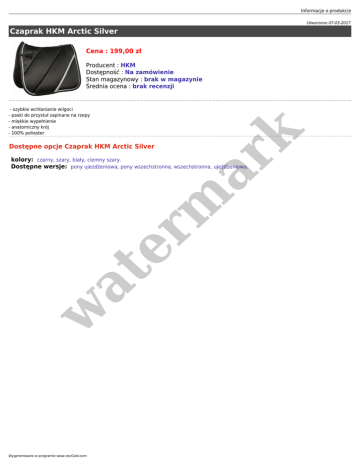 Informacje o produkcie Utworzono 07-03-2017 Czaprak HKM Arctic Silver Cena : 199,00 zł - szybkie wchłanianie wilgoci - paski do przystuł zapinane na rzepy - miękkie wypełnienie - anatomiczny krój - 100% poliester er m ar k Producent : HKM Dostępność : Na zamówienie Stan magazynowy : brak w magazynie Średnia ocena : brak recenzji Dostępne opcje Czaprak HKM Arctic Silver w at kolory: czarny, szary, biały, ciemny szary. Dostępne wersje: pony ujezdżeniowa, pony wszechstronna, wszechstronna, ujeżdżeniowa. Wygenerowano w programie www.oscGold.com