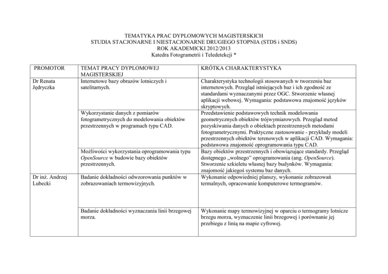 TEMATYKA PRAC DYPLOMOWYCH MAGISTERSKICH STUDIA STACJONARNE I NIESTACJONARNE DRUGIEGO STOPNIA (STDS i SNDS) ROK AKADEMICKI 2012/2013 Katedra Fotogrametrii i Teledetekcji * PROMOTOR Dr Renata Jędryczka TEMAT PRACY DYPLOMOWEJ MAGISTERSKIEJ Internetowe bazy obrazów lotniczych i satelitarnych. Wykorzystanie danych z pomiarów fotogrametrycznych do modelowania obiektów przestrzennych w programach typu CAD. Możliwości wykorzystania oprogramowania typu OpenSource w budowie bazy obiektów przestrzennych. Dr inż. Andrzej Lubecki Badanie dokładności odwzorowania punktów w zobrazowaniach termowizyjnych. Badanie dokładności wyznaczania linii brzegowej morza. KRÓTKA CHARAKTERYSTYKA Charakterystyka technologii stosowanych w tworzeniu baz internetowych. Przegląd istniejących baz i ich zgodność ze standardami wyznaczanymi przez OGC. Stworzenie własnej aplikacji webowej. Wymagania: podstawowa znajomość języków skryptowych. Przedstawienie podstawowych technik modelowania geometrycznych obiektów trójwymiarowych. Przegląd metod pozyskiwania danych o obiektach przestrzennych metodami fotogrametrycznymi. Praktyczne zastosowanie - przykłady modeli przestrzennych obiektów terenowych w aplikacji CAD. Wymagania: podstawowa znajomość oprogramowania typu CAD. Bazy obiektów przestrzennych i obowiązujące standardy. Przegląd dostępnego „wolnego” oprogramowania (ang. OpenSource). Stworzenie szkieletu własnej bazy budynków. Wymagania: znajomość jakiegoś systemu baz danych. Wykonanie odpowiedniej planszy, wykonanie zobrazowań termalnych, opracowanie komputerowe termogramów. Wykonanie mapy termowizyjnej w oparciu o termogramy lotnicze brzegu morza, wyznaczenie linii brzegowej i porównanie jej przebiegu z linią na mapie cyfrowej. Dr inż. Piotr Sawicki Fotogrametryczne pozycjonowanie punktów obiektu na podstawie zdjęć cyfrowych wykonanych sensorem CCD/CMOS telefonu komórkowego Opracowanie cyfrowego fotoplanu elewacji budynku Zastosowanie pakietu PhotoModeler do generowania modelu 3D obiektu bliskiego zasięgu Fotogrametryczne wyznaczenie parametrów geometrycznych linii energetycznej Badanie deformacji obiektu inżynierskiego metodą pseudostereogramów Fotogrametryczny pomiar przekrojów pionowych tuneli/korytarzy metodą płaszczyzny światła Porównanie dokładności budowy pojedynczego modelu metodą sekwencyjną i metodą wiązek Wykonanie zdjęć cyfrowych obiektu, terenowy pomiar fotopunktów, pomiar obrazów cyfrowych, orientacja systemu i wyznaczenie współrzędnych 3D obiektu metodą DLT, analiza wyników i ocena dokładności Wykonanie zdjęć cyfrowych, pomiar osnowy, zdefiniowanie stref, cyfrowe przetworzenie zdjęć m. Transformacji rzutowej 2D, mozaikowanie, edycja fotoplanu, ocena dokładności Wykonanie zdjęć cyfrowych obiektu, terenowy pomiar fotopunktów, pomiar obrazów cyfrowych, kalibracja kamery, pomiar punktów, przetworzenie zdjęd, utworzenie modelu szkieletowego, nałożenie tekstury, analiza wyników i ocena dokładności Wykonanie zdjęć cyfrowych obiektu, terenowy pomiar elementów referencyjnych, pomiar obrazów cyfrowych, obliczenie parametrów geometrycznych, opracowanie graficzne wyników pomiaru, ocena dokładności Wykonanie zdjęć cyfrowych obiektu, terenowy pomiar elementów referencyjnych, orientacja zdjęć w autografie VSD, pomiar obrazów cyfrowych, obliczenie wektorów deformacji, opracowanie graficzne wyników, ocena dokładności Budowa projektora światła z punktami referencyjnymi, wykonanie zdjęć cyfrowych obiektu, pomiar przekrojów na obrazach cyfrowych, transformacja przekrojów do układu współrzędnych obiektu, wyznaczenie kształtu przekrojów, opracowanie graficzne wyników, ocena dokładności Orientacja zdjęć metodą sekwencyjną (DDPS/VSD), pomiar punktów kontrolnych i masowych, przygotowanie plików inicjalnych, budowa modelu metodą wiązek w programie AeroSys, analiza wyników, ocena dokładności Wyznaczenie objętości mas ziemnych na podstawie Analiza danych inicjalnych do opracowania, orientacja pary stereofotogrametrycznego pomiaru zdjęć lotniczych lotniczych zdjęć cyfrowych w autografie VSD, pomiar punktów w strukturze GRID, analityczne wyznaczenie objętości mas ziemnych, ocena wyników opracowania Wyznaczenie metodą fotogrametryczną deformacji gruntu w badaniach geotechnicznych Wektoryzacja granic działek i użytków gruntowych na podstawie ortofotomapy cyfrowej dla wybranego obrębu ewidencyjnego Kalibracja i ocena parametrów orientacji wewnętrznej sensorów CCD/CMOS telefonów komórkowych z zastosowaniem pakietu PhotoModeler Fotogrametryczne opracowanie NMT i jego wizualizacja 3D w programie CAD Ocena przydatności przeglądarek graficznych typu freeware do wstępnego przetwarzania (preprocessing) cyfrowych obrazów fotogrametrycznych Analiza danych z pomiaru in situ, skanowanie zdjęć, pomiar punktów sygnalizowanych próbek gruntu w kolejnych epokach, analityczne wyznaczenie przemieszczeń gruntu, interpretacja graficzna, ocena wyników opracowania Analiza istniejącego zasobu danych (kartograficznych i opisowych) dla wybranego obiektu, wybór arkusza ortofotomapy cyfrowej, wybór i nauka programu dedykowanego, wektoryzacja granic działek i użytków gruntowych, ocena wyników opracowania, analiza dokładności Analiza i wybór modeli komórek do kalibracji sensorów CCD/CMOS (kryterium - różna rozdzielczość), nauka modułu Calibration programu PhotoModeler, rejestracja pola testowego, pomiar zdjęd, analiza wyników i dokładności kalibracji Orientacja stereogramu zdjęć cyfrowych, wyznaczenie punktów homologicznych NMT metodą dopasowania (matching), generowanie NMT w strukturze GRID, import danych do systemu CAD, wizualizacja 3D NMT Określenie zakresu analizy i wstępnego przetwarzania (histogram, zmiana: kontrastu, jasności, saturacji, wyrównania poziomów, filtracja itd.) obrazów cyfrowych, wybór przeglądarek graficznych typu freeware, instalacja programów, 