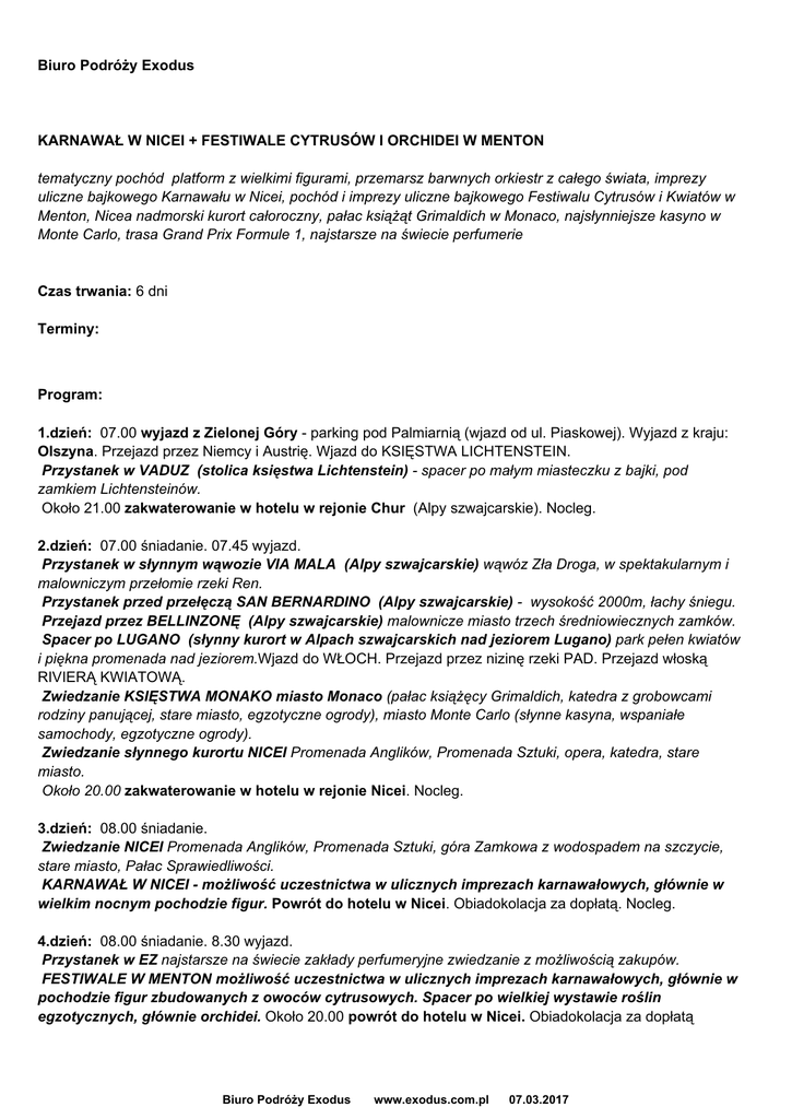 Biuro Podróży Exodus KARNAWAŁ W NICEI + FESTIWALE CYTRUSÓW I ORCHIDEI W MENTON tematyczny pochód platform z wielkimi figurami, przemarsz barwnych orkiestr z całego świata, imprezy uliczne bajkowego Karnawału w Nicei, pochód i imprezy uliczne bajkowego Festiwalu Cytrusów i Kwiatów w Menton, Nicea nadmorski kurort całoroczny, pałac książąt Grimaldich w Monaco, najsłynniejsze kasyno w Monte Carlo, trasa Grand Prix Formule 1, najstarsze na świecie perfumerie Czas trwania: 6 dni Terminy: Program: 1.dzień: 07.00 wyjazd z Zielonej Góry - parking pod Palmiarnią (wjazd od ul. Piaskowej). Wyjazd z kraju: Olszyna. Przejazd przez Niemcy i Austrię. Wjazd do KSIĘSTWA LICHTENSTEIN. Przystanek w VADUZ (stolica księstwa Lichtenstein) - spacer po małym miasteczku z bajki, pod zamkiem Lichtensteinów. Około 21.00 zakwaterowanie w hotelu w rejonie Chur (Alpy szwajcarskie). Nocleg. 2.dzień: 07.00 śniadanie. 07.45 wyjazd. Przystanek w słynnym wąwozie VIA MALA (Alpy szwajcarskie) wąwóz Zła Droga, w spektakularnym i malowniczym przełomie rzeki Ren. Przystanek przed przełęczą SAN BERNARDINO (Alpy szwajcarskie) - wysokość 2000m, łachy śniegu. Przejazd przez BELLINZONĘ (Alpy szwajcarskie) malownicze miasto trzech średniowiecznych zamków. Spacer po LUGANO (słynny kurort w Alpach szwajcarskich nad jeziorem Lugano) park pełen kwiatów i piękna promenada nad jeziorem.Wjazd do WŁOCH. Przejazd przez nizinę rzeki PAD. Przejazd włoską RIVIERĄ KWIATOWĄ. Zwiedzanie KSIĘSTWA MONAKO miasto Monaco (pałac książęcy Grimaldich, katedra z grobowcami rodziny panującej, stare miasto, egzotyczne ogrody), miasto Monte Carlo (słynne kasyna, wspaniałe samochody, egzotyczne ogrody). Zwiedzanie słynnego kurortu NICEI Promenada Anglików, Promenada Sztuki, opera, katedra, stare miasto. Około 20.00 zakwaterowanie w hotelu w rejonie Nicei. Nocleg. 3.dzień: 08.00 śniadanie. Zwiedzanie NICEI Promenada Anglików, Promenada Sztuki, góra Zamkowa z wodospadem na szczycie, stare miasto, Pałac Sprawiedliwości. KARNAWAŁ W NICEI - możliwość uczestnictwa w ulicznych imprezach karnawałowych, głównie w wielkim nocnym pochodzie figur. Powrót do hotelu w Nicei. Obiadokolacja za dopłatą. Nocleg. 4.dzień: 08.00 śniadanie. 8.30 wyjazd. Przystanek w EZ najstarsze na świecie zakłady perfumeryjne zwiedzanie z możliwością zakupów. FESTIWALE W MENTON możliwość uczestnictwa w ulicznych imprezach karnawałowych, głównie w pochodzie figur zbudowanych z owoców cytrusowych. Spacer po wielkiej wystawie roślin egzotycznych, głównie orchidei. Około 20.00 powrót do hotelu w Nicei. Obiadokolacja za dopłatą Biuro Podróży Exodus www.exodus.com.pl 07.03.2017 Nocleg. 5.dzień: 08.00 śniadanie. Czas wolny - możliwość zakupów na licznych wyprzedażach. Około 12.00 wyjazd . Przejazd przez północne Włochy i Szwajcarię. Nocny przejazd przez Austrię i Niemcy. 6.dzień: przejazd przez Niemcy. Wjazd do kraju: Gubinek. Około 10.00 rozwiązanie imprezy w Zielonej Górze parking pod Palmiarnią. W cenie: autokar: wysokopokładowy, klimatyzacja, WC, video, napoje zimne i gorące (płatne) około 2900 km noclegi: 4 x hotele**, pokoje 2,3-osob. z łaz/WC. wyżywienie: 4 śniadania kontynentalne pilot BP EXODUS ubezpieczenie NW, KL, bagaż podatek VAT Dodatkowe opłaty: wjazd do centrum Monaco i Monte Carlo 5 /os. Biuro Podróży Exodus www.exodus.com.pl 07.03.2017
