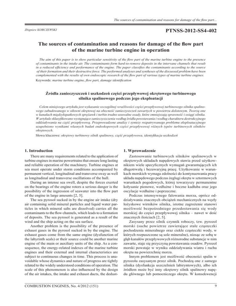 The sources of contamination and reasons for damage of the flow part... PTNSS-2012-SS4-402 Zbigniew KORCZEWSKI The sources of contamination and reasons for damage of the flow part of the marine turbine engine in operation The aim of this paper is to show particular sensitivity of the flow part of the marine turbine engine to the presence of contaminants in the intake air. The contaminants form hard-to-remove deposits in the intervane channels that result in a reduced efficiency and performance of the engine. The paper classifies the contaminants according to the source of their formation and their destructive force. The performed analyses and syntheses of the discussed problem have been complemented with the results of own endoscopic research of the flow part of various types of marine turbine engines. Keywords: marine turbine engine, flow part, damage identification Źródła zanieczyszczeń i uszkodzeń części przepływowej okrętowego turbinowego silnika spalinowego podczas jego eksploatacji Celem niniejszego artykułu jest wykazanie szczególnej wrażliwości części przepływowej turbinowego silnika spalinowego zabudowanego w siłowni okrętowej na obecność zanieczyszczeń zawartych w powietrzu dolotowym. Tworzą one w kanałach międzyłopatkowych sprężarek i turbin trudno usuwalne osady, które zmniejszają sprawność i osiągi silnika. W artykule sklasyfikowano występujące zanieczyszczenia według źródła powstawania i według charakteru destrukcyjnego oddziaływania na część przepływową. Przeprowadzone analizy i syntezy rozpatrywanego problemu eksploatacyjnego uzupełniono wynikami własnych badań endoskopowych części przepływowej różnych typów turbinowych silników okrętowych. Słowa kluczowe: okrętowy turbinowy silnik spalinowy, część przepływowa, identyfikacja uszkodzeń 1. Introduction 1. Wprowadzenie There are many requirements related to the application of turbine engines in marine powertrains that ensure long lasting and reliable operation of the machinery. Turbine engines at sea must operate under storm conditions accompanied by permanent vertical, longitudinal and transverse sway as well as longitudinal and transverse oscillations of the hull. During an intense sea swell, despite the forces exerted on the bearings of the engine rotors a serious danger is the possibility of the ingression of seawater into the flow part of the engine in large amounts [2, 5]. The sea pyrosol sucked in by the engine air intake (dry air containing solid mineral particles and liquid water particles in which mineral salts are dissolved) carries all the contaminants to the flow channels, which leads to a formation of deposits. The sea pyrosol is generated as a result of the wind and the ship acting on the sea surface. Another problem is the possibility of the presence of exhaust gases in the pyrosol sucked in by the engine. The exhaust gases come from the same engine (dysfunction of the labyrinth seals) or their source could be another marine engine of the main or auxiliary units of the ship. As a consequence, the energy-related indexes of the marine turbine engines and their external and internal characteristics are subject to continuous changes in time. This process is unavoidable whose dynamics and nature of progress are tightly related to the widely understood conditions of operation. The scale of this phenomenon is also influenced by the design of the air intakes, the intake and exhaust ducts, the dedust- Zastosowanie turbinowych silników spalinowych w okrętowych układach napędowych stawia przed użytkownikiem wiele specyficznych wymagań gwarantujących ich długotrwałą i bezawaryjną pracę. Użytkowanie w warunkach morskich wymaga zdolności do kontynuowania pracy układu napędowego podczas żeglugi okrętu w sztormowych warunkach pogodowych, której towarzyszy permanentne kołysanie pionowe, wzdłużne i boczne kadłuba oraz jego oscylacje wzdłużne i poprzeczne. Podczas intensywnego falowania morza, oprócz oddziaływania znacznych obciążeń mechanicznych na węzły łożyskowe wirników silnika, istotne zagrożenie stanowi możliwość bezpośredniego przedostawania się wody morskiej do części przepływowej silnika – nawet w dość znacznych ilościach [2, 5]. Zasysany przez silnik czynnik roboczy, tzw. pyrozol morski (suche powietrze zawierające stałe cząsteczki pochodzenia mineralnego oraz ciekłe cząsteczki wody, w których rozpuszczone są sole mineralne), niosąc ze sobą w głąb kanałów przepływowych różnorodne substancje w nim zawarte, staje się przyczyną powstawania osadów. Pyrozol morski powstaje w wyniku oddziaływania wiatru i ruchu okrętu na powierzchnię morza. Innym problemem jest możliwość obecności spalin w pyrozolu zasysanym przez silnik. Pochodzą one z samego silnika (dysfunkcja uszczelnień labiryntowych), albo ich źródłem może być inny okrętowy silnik spalinowy napędu głównego lub pomocniczego okrętu. W konsekwencji COMBUSTION ENGINES, No. 4/2012 (151) 9 Źródła zanieczyszczeń i uszkodzeń części przepływowej okrętowego turbinowego... ers and the engine loads. An existing rule when designing a turbine-powered vessel is to place the air intakes closest to the diametrical and midship sections above the sea level (8 meters). Their shape and location should reduce the probability of water splash and exhaust gases getting into the intake channels. Modern fast warships (but not only) with a turbine propulsion are equipped with deduster systems that reduce the amount of water and mineral salts getting into the engine intervane channels. Their design and geometry as well as thermal/flow characteristics depend on the design and the parameters of the vessel. The total pressure losses for a clean deduster should not exceed 500 ÷ 1800 Pa at the flow velocities of 2.5 ÷ 10 m/s. This corresponds to approximately 1 ÷ 2% power loss [5, 6]. Marine engines have an admissible increase in the flow res