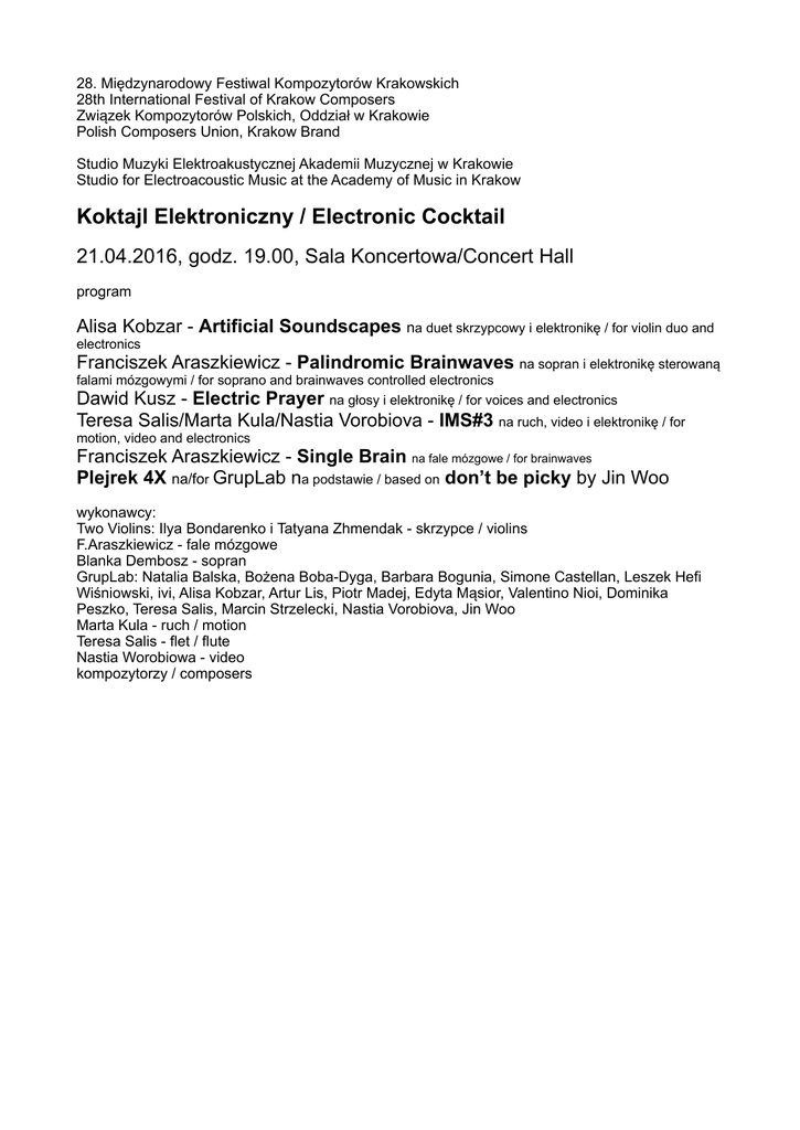 28. Międzynarodowy Festiwal Kompozytorów Krakowskich 28th International Festival of Krakow Composers Związek Kompozytorów Polskich, Oddział w Krakowie Polish Composers Union, Krakow Brand Studio Muzyki Elektroakustycznej Akademii Muzycznej w Krakowie Studio for Electroacoustic Music at the Academy of Music in Krakow Koktajl Elektroniczny / Electronic Cocktail 21.04.2016, godz. 19.00, Sala Koncertowa/Concert Hall program Alisa Kobzar - Artificial Soundscapes na duet skrzypcowy i elektronikę / for violin duo and electronics Franciszek Araszkiewicz - Palindromic Brainwaves na sopran i elektronikę sterowaną falami mózgowymi / for soprano and brainwaves controlled electronics Dawid Kusz - Electric Prayer na głosy i elektronikę / for voices and electronics Teresa Salis/Marta Kula/Nastia Vorobiova - IMS#3 na ruch, video i elektronikę / for motion, video and electronics Franciszek Araszkiewicz - Single Brain na fale mózgowe / for brainwaves Plejrek 4X na/for GrupLab na podstawie / based on don’t be picky by Jin Woo wykonawcy: Two Violins: Ilya Bondarenko i Tatyana Zhmendak - skrzypce / violins F.Araszkiewicz - fale mózgowe Blanka Dembosz - sopran GrupLab: Natalia Balska, Bożena Boba-Dyga, Barbara Bogunia, Simone Castellan, Leszek Hefi Wiśniowski, ivi, Alisa Kobzar, Artur Lis, Piotr Madej, Edyta Mąsior, Valentino Nioi, Dominika Peszko, Teresa Salis, Marcin Strzelecki, Nastia Vorobiova, Jin Woo Marta Kula - ruch / motion Teresa Salis - flet / flute Nastia Worobiowa - video kompozytorzy / composers