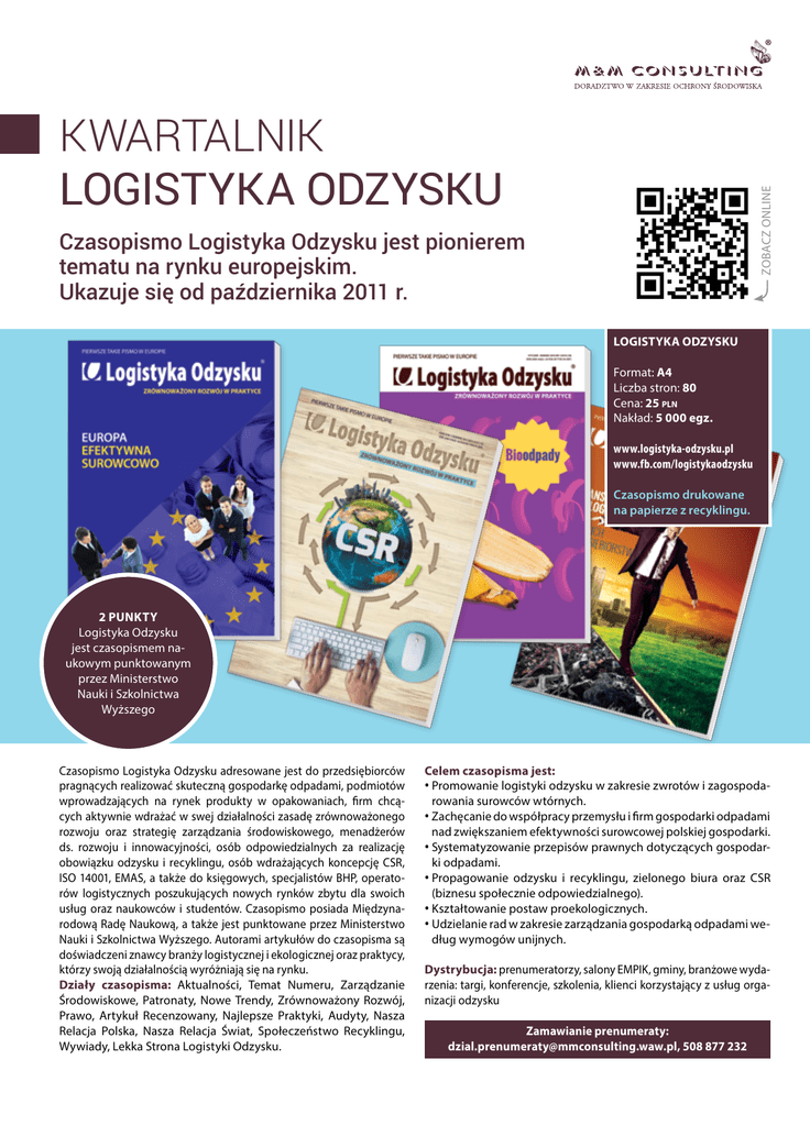 zobacz online KWARTALNIK Logistyka Odzysku Czasopismo Logistyka Odzysku jest pionierem tematu na rynku europejskim. Ukazuje się od października 2011 r. LOGISTYKA ODZYSKU Format: A4 Liczba stron: 80 Cena: 25 pln Nakład: 5 000 egz. www.logistyka-odzysku.pl www.fb.com/logistykaodzysku Czasopismo drukowane na papierze z recyklingu. 2 punkty Logistyka Odzysku jest czasopismem naukowym punktowanym przez Ministerstwo Nauki i Szkolnictwa Wyższego Czasopismo Logistyka Odzysku adresowane jest do przedsiębiorców pragnących realizować skuteczną gospodarkę odpadami, podmiotów wprowadzających na rynek produkty w opakowaniach, firm chcących aktywnie wdrażać w swej działalności zasadę zrównoważonego rozwoju oraz strategię zarządzania środowiskowego, menadżerów ds. rozwoju i innowacyjności, osób odpowiedzialnych za realizację obowiązku odzysku i recyklingu, osób wdrażających koncepcję CSR, ISO 14001, EMAS, a także do księgowych, specjalistów BHP, operatorów logistycznych poszukujących nowych rynków zbytu dla swoich usług oraz naukowców i studentów. Czasopismo posiada Międzynarodową Radę Naukową, a także jest punktowane przez Ministerstwo Nauki i Szkolnictwa Wyższego. Autorami artykułów do czasopisma są doświadczeni znawcy branży logistycznej i ekologicznej oraz praktycy, którzy swoją działalnością wyróżniają się na rynku. Działy czasopisma: Aktualności, Temat Numeru, Zarządzanie Środowiskowe, Patronaty, Nowe Trendy, Zrównoważony Rozwój, Prawo, Artykuł Recenzowany, Najlepsze Praktyki, Audyty, Nasza Relacja Polska, Nasza Relacja Świat, Społeczeństwo Recyklingu, Wywiady, Lekka Strona Logistyki Odzysku. Celem czasopisma jest: • Promowanie logistyki odzysku w zakresie zwrotów i zagospodarowania surowców wtórnych. • Zachęcanie do współpracy przemysłu i firm gospodarki odpadami nad zwiększaniem efektywności surowcowej polskiej gospodarki. • Systematyzowanie przepisów prawnych dotyczących gospodarki odpadami. • Propagowanie odzysku i recyklingu, zielonego biura oraz CSR (biznesu społecznie odpowiedzialnego). •K ształtowanie postaw proekologicznych. • Udzielanie rad w zakresie zarządzania gospodarką odpadami według wymogów unijnych. Dystrybucja: prenumeratorzy, salony EMPIK, gminy, branżowe wydarzenia: targi, konferencje, szkolenia, klienci korzystający z usług organizacji odzysku Zamawianie prenumeraty: [email protected], 508 877 232 Podział czytelników Logistyki Odzysku ze względu na branżę* 18% 27% 2% 2% 2% 5% 3% 5% 3% 3% 7% 17% 5% spożywcza (27%) farmacja (3%) odzież/obuwie/tekstylia (7%) budowlana/AGD/RTV (17%) kosmetyki/chemia gospodarcza (5%) opakowania (3%) motoryzacja i transport (3%) przemysł (5%) m etalowa/narzędzia (5%) t worzywa sztuczne (2%) u sługi/sprzedaż/dystrybucja (2%) h obby/rekreacja (2%) i nne (18%) * na podstawie ogólnej liczby prenumeratorów i głównych kanałów dystrybucji Cennik reklam w czasopiśmie Reklamy w kolorze (CMYK) 1/4 strony reklamy 1 200 zł 1/3 strony reklamy 1 600 zł 1/2 strony reklamy 2 000 zł 1/1 strona reklamy 3 600 zł IV okładka 4 500 zł III okładka 3 900 zł II okładka 4 100 zł I okładka (2/3 strony) 6 900 zł 1/1 strona artykułu sponsorowanego 3 400 zł Reklamy w czarnobieli (K) lub w dwóch kolorach (K+1**) 1/4 strony reklamy 840 zł 1/3 strony reklamy 1 120 zł 1/2 strony reklamy 1 400 zł 1/1 strona reklamy 2 520 zł 1/1 strona artykułu sponsorowanego 2 380 zł Insert*** 2 500 zł Drobne ogłoszenie (moduł 8x4 cm) 250 zł Do podanych cen należy doliczyć podatek VAT w wysokości 23%. ** dodatkowy kolor jest obligatoryjny w danym numerze i wybierany przez wydawnictwo. *** n iestandardowe formy insertów, wybranie miejsca insertowania, foliowanie - podlegają dodatkowej opłacie, ustalanej indywidualnie KONTAKT: [email protected], 519 184 337 Harmonogram tematów wiodących w numerach na 2014 r. 2014/1 (10) ODZYSK WODY Dostępny od 08.01.2014 r. Termin składania zamówień/reklam do 10.12.2013 r. • Systemy zamknięte w gospodarowaniu wodą • Co oznaczają poszczególne kolory wody związane z jej odzyskiem? • Kwaśne deszcze a zrównoważony rozwój • Ochrona atmosfery i klimatu a problem wody 2014/2 (11) AUDYT EKOLOGICZNY W PRZEDSIĘBIORSTWIE Dostępny od 08.04.2014 r. Termin składania zamówień/reklam do 10.03.2014 r. • Jakie koszty ponosi przedsiębiorca w związku z przepisami w zakresie ochrony środowiska? • Przegląd firm konsultingowych w ochronie środowiska na polskim rynku • Czy jest szansa na stabilizację przepisów w zakresie ochrony środowiska? • Ekologia w firmie – czy ktoś wie, o co w tym chodzi? 2014/3 (12) RECYKLING TWORZYW SZTUCZNYCH W POLSCE Dostępny od 08.07.2014 r. Termin składania zamówień/reklam do 10.06.2014 r. • Wzrost masy opakowań z tworzyw sztucznych a ich struktura • Wpływ rosnącej masy plastiku na różnorodność biologiczną i gospodarowanie na terenach prawem chronionych • S ystem kaucyjny w Polsce i na świecie • Grupa 7 „inne” 2014/4 (13) EKOLOGIA W MAŁYCH I ŚREDNICH PRZEDSIĘBIORSTWACH Dostępny od 08.10.2014 r. Termin składania zamówień/reklam do 10.09.2014 r. •C o firmy rodzinne myślą o zrównoważonym rozwoju? •C zy polskie firmy 25 lat po transformacji stać na ekologię? • I nnowacyjność w ochronie środowiska dla MŚP •B HP a ochrona przyrody MMCONSULTING.WAW.PL Harmonogram tematów wiodących w numerach na 2015 i 2016 r. 2015/1 (14) EUROPA EFEKTYWNA SUROWCOWO Dostępny od 13.01.2015 r. Termin składania zamówień/reklam do 10.12.2014 r. • 2020-2050 narzędzia efektywności surowcowej zaproponowane przez UE • Redukuj zużycie surowców naturalnych – produkuj taniej i bardziej ekologicznie • Raport Komisji Europejskiej – Polska na tle innych państw unijnych • Czy i jak jesteśmy w stanie przodować w proekologicznej działalności? 2015/2 (15) CSR Dostępny od 14.04.2015 r. Termin składania zamówień/reklam do 10.03.201