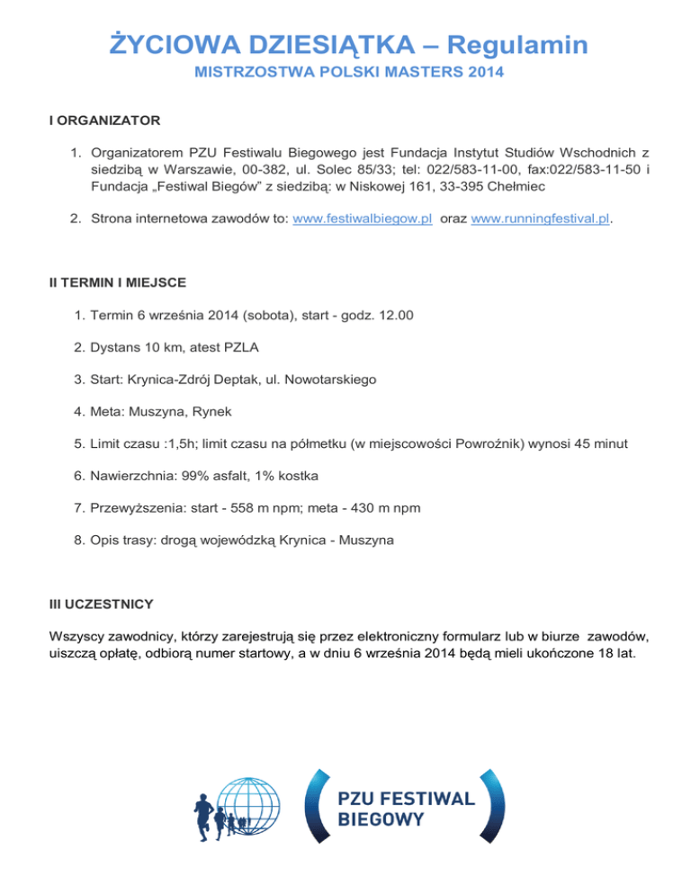 ŻYCIOWA DZIESIĄTKA – Regulamin MISTRZOSTWA POLSKI MASTERS 2014 I ORGANIZATOR 1. Organizatorem PZU Festiwalu Biegowego jest Fundacja Instytut Studiów Wschodnich z siedzibą w Warszawie, 00-382, ul. Solec 85/33; tel: 022/583-11-00, fax:022/583-11-50 i Fundacja „Festiwal Biegów” z siedzibą: w Niskowej 161, 33-395 Chełmiec 2. Strona internetowa zawodów to: www.festiwalbiegow.pl oraz www.runningfestival.pl. II TERMIN I MIEJSCE 1. Termin 6 września 2014 (sobota), start - godz. 12.00 2. Dystans 10 km, atest PZLA 3. Start: Krynica-Zdrój Deptak, ul. Nowotarskiego 4. Meta: Muszyna, Rynek 5. Limit czasu :1,5h; limit czasu na półmetku (w miejscowości Powroźnik) wynosi 45 minut 6. Nawierzchnia: 99% asfalt, 1% kostka 7. Przewyższenia: start - 558 m npm; meta - 430 m npm 8. Opis trasy: drogą wojewódzką Krynica - Muszyna III UCZESTNICY Wszyscy zawodnicy, którzy zarejestrują się przez elektroniczny formularz lub w biurze zawodów, uiszczą opłatę, odbiorą numer startowy, a w dniu 6 września 2014 będą mieli ukończone 18 lat. ŻYCIOWA DZIESIĄTKA – Regulamin MISTRZOSTWA POLSKI MASTERS 2014 IV ZGŁOSZENIA 1. Zgłoszenia przyjmowane są na stronie www.festiwalbiegow.pl. Istnieje możliwość zgłoszenia się do biegów Festiwalu bezpośrednio w biurze zawodów w dniach 5 - 6 września. 2. Zarejestrowany zawodnik, który poprawnie wypełnił kartę zgłoszenia i uiścił opłatę, otrzymuje w biurze zawodów numer startowy, który widnieje przy jego nazwisku na liście startowej 3. Zgłoszenie każdego zawodnika powinno być własnoręcznie podpisane. Podpis na karcie rejestracji można dokonać przy odbiorze numeru startowego w biurze zawodów lub przesyłając podpisaną kartę rejestracji bezpośrednio do biura organizatora. 4. Opłaty startowe zawarte są w Regulaminie Festiwalu Biegowego. V KLASYFIKACJA I NAGRODY Klasyfikacje i wysokość nagród zostanie opublikowana najpóźniej do 01.08.2014. VI POSTANOWIENIA KOŃCOWE 1. Regulamin jest spójny z postanowieniami regulaminu Festiwalu Biegowego. 2. Ostateczna interpretacja regulaminu należy do Organizatorów. REGULAMIN MISTRZOSTWA POLSKI MASTERS 2014 I CEL IMPREZY 1. Wyłonienie Mistrzyń i Mistrzów Polski Masters w biegu na 10km w poszczególnych kategoriach wiekowych. 2. Popularyzacja biegów długodystansowych. ŻYCIOWA DZIESIĄTKA – Regulamin MISTRZOSTWA POLSKI MASTERS 2014 II ORGANIZATOR 1. Organizatorem PZU Festiwalu Biegowego jest Fundacja Instytut Studiów Wschodnich z siedzibą w Warszawie, 00-382, ul. Solec 85/33; tel: 022/583-11-00, fax:022/583-11-50 i Fundacja „Festiwal Biegów” z siedzibą: w Niskowej 161, 33-395 Chełmiec 2. Strona internetowa zawodów to: www.festiwalbiegow.pl oraz www.runningfestival.pl. III TERMIN I MIEJSCE 1.Termin 06 września 2014 (sobota), start – godz. 12.00 2. Dystans 10 km, atest PZLA 3. Start: Krynica-Zdrój Deptak, ul. Nowotarskiego , 4. Meta: Muszyna, Rynek, 5. Limit czasu :1,5h; limit czasu na półmetku (w miejscowości Powroźnik) wynosi 45 minut. 6. Nawierzchnia: 99% asfalt, 1% kostka 7. Przewyższenia: start – 558 m npm; meta – 430 m npm 8. Opis trasy: drogą wojewódzką Krynica – Muszyna IV ZASADY UCZESTNICTWA 1. Prawo startu w Mistrzostwach mają tylko zawodnicy kategorii masters tzn. kobiety i mężczyźni, którzy urodzili się w roku 1979 i wcześniej. 2. Dla potwierdzenia wieku startującego należy przedłożyć dokument tożsamości. 3. Zawodnicy startują na własną odpowiedzialność. 4. W Mistrzostwach Polski sklasyfikowani będą zawodnicy tylko z polskim obywatelstwem. ŻYCIOWA DZIESIĄTKA – Regulamin MISTRZOSTWA POLSKI MASTERS 2014 V KATEGORIE WIEKOWE 1. Kobiety: 35-39; 40-44; 45-49; 50-54; 55-59; 60-64; 65-69; pow. 70 lat. 2. Mężczyźni: 35-39; 40-44; 45-49; 50-54; 55-59; 60-64; 65-69: pow. 70 lat. O zakwalifikowaniu do kategorii decyduje rok urodzenia. VI NAGRODY Zdobywcy pierwszych trzech miejsc w klasyfikacjach wiekowych w kategorii kobiet i mężczyzn otrzymają medale oraz nagrody rzeczowe. VII ZGŁOSZENIA 1. Zgłoszenia przyjmowane są na stronie www.festiwalbiegow.pl. Istnieje możliwość zgłoszenia się do biegów Festiwalu bezpośrednio w biurze zawodów w dniu 5 września. 2. Zarejestrowany zawodnik, który poprawnie wypełnił kartę zgłoszenia i uiścił opłatę, otrzymuje w biurze zawodów numer startowy, który widnieje przy jego nazwisku na liście startowej. 3. Zgłoszenie każdego zawodnika powinno być własnoręcznie podpisane. Podpis na karcie rejestracji można dokonać przy odbiorze numeru startowego w biurze zawodów lub przesyłając podpisaną kartę rejestracji bezpośrednio do biura organizatora. 4. Opłaty startowe zawarte są w Regulaminie PZU Festiwalu Biegowego. VIII POSTANOWIENIA KOŃCOWE 1. Regulamin jest spójny z postanowieniami regulaminu Festiwalu Biegowego. 2. Ostateczna interpretacja regulaminu należy do Organizatorów.