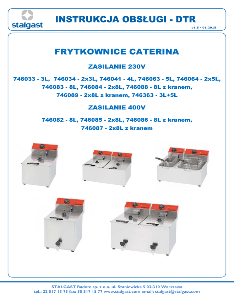 FRYTKOWNICE CATERINA ZASILANIE 230V 746033 - 3L, 746034 - 2x3L, 746041 - 4L, 746063 - 5L, 746064 - 2x5L, 746083 - 8L, 746084 - 2x8L, 746088 - 8L z kranem, 746089 - 2x8L z kranem, 746363 - 3L+5L ZASILANIE 400V 746082 - 8L, 746085 - 2x8L, 746086 - 8L z kranem, 746087 - 2x8L z kranem STALGAST Radom sp. z o.o. ul. Staniewicka 5 03-310 Warszawa tel.: 22 517 15 75 fax: 55 517 15 77 www.stalgast.com email: [email protected] 1. INSTRUKCJE BEZPIECZEŃSTWA……………………………………………………. 3 2. PRZEZNACZENIE URZĄDZENIA……………………………………………….……. 4 3. DANE TECHNICZNE……………………………………………………………………. 4 4. CHARAKTERYSTYKA BUDOWY URZĄDZENIA……………………………….... 5 5. INSTALACJA………………………………………………………….……………...….... 5 6. ZASADY BHP……………………………………………………….…………………….. 6 7. OBSŁUGA URZĄDZENIA……………………………………………….……………... 7 8. KONSERWACJA………………………………………….…………………………….... 8 9. PAKOWANIE, ŁADOWANIE I TRANSPORT……………………………….…….. 9 10. WYKAZ CZĘŚCI ZAMIENNYCH…………………………………………………….. 9 11. SCHEMAT ELEKTRYCZNY……………………………………………………………. 12. USUWANIE ZUŻYTYCH URZĄDZEŃ……………………………………………… 13. GWARANCJA………………………………………………….…………………....……. 14. DEKLARACJA ZGODNOŚCI…………………………………………………………... 2 STALGAST Radom sp. z o.o. ul. Staniewicka 5 03-310 Warszawa tel.: 22 517 15 75 fax: 22 517 15 77 www.stalgast.com email: [email protected] 9 10 10 11 Dziękujemy Państwu za zakup naszego produktu. Przed pierwszym użyciem prosimy dokładnie zapoznać się z niniejszą instrukcją obsługi. Kopiowanie niniejszej instrukcji bez zgody producenta jest zabronione. Zdjęcia oraz rysunki mają charakter poglądowy i mogą różnić się od zakupionego urządzenia. UWAGA: Instrukcję należy przechowywać w bezpiecznym oraz dostępnym dla personelu miejscu. Producent zastrzega sobie prawo do zmiany parametrów technicznych urządzeń bez zapowiedzi. 1. INSTRUKCJE BEZPIECZEŃSTWA Uwaga! Jeżeli urządzenie zostało uszkodzone podczas transportu nie wolno go podłączać! Nieprawidłowa obsługa i niewłaściwe użytkowanie może spowodować poważne uszkodzenie urządzenia lub zranienie osób. Urządzenie może być stosowane wyłącznie w celu, do którego zostało zaprojektowane. Producent nie ponosi żadnej odpowiedzialności za szkody spowodowane nieprawidłową obsługą i niewłaściwym użytkowaniem urządzenia. W czasie użytkowania zabezpiecz urządzenie i wtyczkę przewodu zasilającego przed kontaktem z wodą lub innymi płynami. W przypadku, gdyby przez nieuwagę urządzenie wpadło do wody lub zostało zalane wodą, należy natychmiast wyciągnąć wtyczkę z gniazda zasilającego, a następnie zlecić kontrolę urządzenia specjaliście. Nieprzestrzeganie tej instrukcji może spowodować zagrożenie życia. Nigdy nie otwieraj samodzielnie obudowy urządzenia. Nie wkładaj żadnych przedmiotów w otwory w obudowie urządzenia. Nie dotykaj wtyczki przewodu zasilającego wilgotnymi rękami. Regularnie kontroluj stan wtyczki i przewodu zasilającego. Jeżeli przewód zasilający ulegnie uszkodzeniu to powinien być wymieniony. Nieodłączalny przewód zasilający może być wymieniony w specjalistycznych zakładach naprawczych lub przez wykwalifikowaną osobę. W przypadku, gdy urządzenie spadnie lub ulegnie uszkodzeniu w inny sposób, zawsze zleć przed dalszym użytkowaniem przeprowadzenie kontroli i ewentualną naprawę w wyspecjalizowanym punkcie naprawczym. Nigdy nie naprawiaj urządzenia samodzielnie - może to spowodować zagrożenie życia. Zabrania się dokonywania przeróbek i napraw przez osoby nie przeszkolone zawodowo. Chroń przewód zasilający przed kontaktem z ostrymi lub gorącymi przedmiotami, a także z dala od otwartego źródła ognia. Jeżeli chcesz odłączyć urządzenie z gniazda zasilającego, zawsze chwytaj za wtyczkę, nigdy nie ciągnij za przewód zasilający. Zabezpiecz przewód zasilający, aby nikt przez omyłkę nie wyciągnął go z gniazda zasilającego lub się o niego nie potknął. Kontroluj funkcjonowanie urządzenia w czasie użytkowania. Nie należy zezwalać na użytkowanie urządzenia przez osoby niepełnoletnie, osoby upośledzone fizycznie lub umysłowo oraz upośledzone pod względem zdolności ruchowej, a także osoby nieposiadające odpowiedniego doświadczenia i wiedzy dotyczącej właściwego użytkowania urządzenia. Wyżej wymienione osoby mogą obsługiwać urządzenie jedynie pod nadzorem osoby odpowiedzialnej za bezpieczeństwo. Jeżeli urządzenie nie jest w danej chwili użytkowane lub jest właśnie czyszczone, zawsze odłącz je od źródła zasilania, wyciągając wtyczkę z gniazda zasilającego. UWAGA: Jeżeli wtyczka przewodu zasilającego jest podłączona do gniazda zasilającego, urządzenie cały czas pozostaje pod napięciem. Wyłącz urządzenie, zanim wyciągniesz wtyczkę z gniazda zasilającego. Nigdy nie ciągnij urządzenia za przewód zasilający. Urządzenie po zainstalowaniu musi być widoczne i łatwo dostępne. Należy zapewnić łatwość dostępu do wyłączenia wtyczki nieodłączanego przewodu zasilającego. 3 STALGAST Radom sp. z o.o. ul. Staniewicka 5 03-310 Warszawa tel.: 22 517 15 75 fax: 22 517 15 77 www.stalgast.com email: [email protected] 2. PRZEZNACZENIE URZĄDZENIA Frytownice przeznaczone są tylko i wyłącznie do smażenia w głębokim oleju „fryturze” w restauracjach, hotelach, punktach gastronomicznych, itp. 3. DANE TECHNICZNE WYDAJNOŚĆ (frytki mrożon
