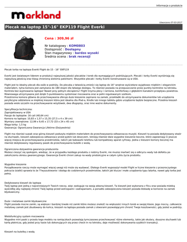 Informacje o produkcie Utworzono 07-03-2017 Plecak na laptop 15"-16" EKP119 Flight Everki Cena : 309,96 zł Nr katalogowy : KOM0803 Dostępność : Dostępny Stan magazynowy : bardzo wysoki Średnia ocena : brak recenzji Plecak torba na laptopa Everki Flight do 15 - 16'' EKP119 Everki jest światowym liderem w produkcji najwyższej jakości plecaków i toreb dla wymagających podróżujących. Plecaki i torby Everki wyróżniają się najwyższą jakością oraz klasą chronioną wieloma patentami. Wszystkie plecaki i torby Everki konstruowane są w USA. Flight jest to idealny plecak dla osób w podróży. Do plecaka z łatwością zmieści się laptop do 16" wnętrze wyściełane wyjątkowo miękkim i eleganckim materiałem, tylna komora jest zamykana do 180 stopni dla łatwego dostępu. To również pozwala na przepuszczanie przez punkty kontrolne na lotnisku. Kontrola bez wyjmowania laptopa! Nawet przy pełnym obciążeniu! Flight trzyma plecy i ramiona, komfortowy z głębokimi kanałami przepływu powietrza. Równowaga utrzymywana jest dzięki 5-punktowemu systemowi mocowania oraz w pełni regulowanym szelkom. Przestronna komora główna do przechowywania oferuje duże kieszenie zapinane na zamek, przekładki do utrzymywania dokumentów lub urządzenia peryferyjne oddzielone w miękkiej kieszeni która jest idealna dla iPad-a, Kindle lub innego tabletu gdzie urządzenie będzie bezpieczne. Przednia kieszeń posiada wiele szczelin na przechowywanie wizytówek, dwa długopisy, oraz inne ważne dokumenty. Specyfikacja techniczna: Zaprojektowany w USA Pasuje do laptopów: 16 cali (40,64 cm) Komora na laptopa: 10,83 x 1,57 x 15,35 (27,5 x 4 x 39 cm) Wymiary zewnętrzne: 12,99 x 9,45 x 17,72 (33 x 24 x 45 cm) Waga torby: 1,5 kg Gwarancja: Ograniczona Gwarancja Lifetime (Dożywotnia) Flight ma również suwak oraz górną kieszeń podszyta miękkim materiałem do przechowywania odtwarzacza muzyki. Kieszeń ta posiada dedykowany otwór na słuchawki, kieszeń zabezpiecza odtwarzacz przed pyłem lub deszczem. Istnieją również dwie wygodne kieszenie boczne, które zapewniają Ci jeszcze więcej miejsca do przechowywania przedmiotów, takich jak ładowarki telefonu lub kompaktowy aparat cyfrowy. Jedna z kieszeni komory bocznej ma również dedykowany regulowany pasek do przechowywania butelki z wodą. Ograniczona dożywotnia gwarancja producenta Możesz cieszyć się spokojem, wiedząc, że w przypadku każdego produktu z rodziny Everki, nie musisz martwić się o odkryciu wady lub defektu po zakończeniu okresu gwarancyjnego. Gwarancja Everki chroni zakup na wady produkcyjne w całym cyklu życia produktu. Wygodne kieszenie Porządkowanie rzeczy może wymagać więcej uwagi niż może się wydawać. Dlatego Everki wyposażył model Flight w liczne kieszenie z przezroczystego pokrycia (siatki) sprawia to że ??wyszukiwanie i dostęp do codziennych przedmiotów, takich jak klucze i małe urządzenia typu latarka, nawet gdy torba jest pełna. Dedykowana kieszeń do laptopa Twój laptop jest jedną z najcenniejszych Twoich rzeczy, więc zasługuje na swoją własną kieszeń. Ta kieszeń jest wykonana z filcu oraz posiada miekką wyściółkę aby najlepiej chronić Twój laptop przed wstrząsami i zadrapaniami, a ponadto zabezpieczona kieszeń posiada blokadę w komorze na zamek błyskawiczny. Duże i metalowe zamki błyskawiczne Flight posiada mocne zamki, są większe i bardziej trwałe niż zamki które możesz znaleźć na większości innych toreb w swojej klasie. Jego mocny, całkowicie metalowy zamek jest zbudowany do końca, kieszeń na laptopa posiada zamek z otworami pozwalającymi chronić Twoje kosztowności, gdy jesteś w podróży. Wielofunkcyjny system mocowania Wygodne mini paski z przodu tego modelu na ramiączkach pozwalają tymczasowo przechowywać różne elementy, takie jak okulary, douszne słuchawki lub kartę płatnicza, gdy jesteś przy kasie lub dokonujących się przez check-in na lotnisku, daje możliwość dokonywania szybkich transakcji. Kieszeń na butelkę z wodą Podróżując w ciepłym klimacie, w górach, nad morzem, zawsze warto mieć przy sobie butelkę z wodą lub ulubionym napojem. Flight Everki wyposażony jest w unikalny pasek na jednej z jego bocznych kieszeni, które bezpiecznie trzyma butelkę na miejscu. Chcesz się napić? Prob