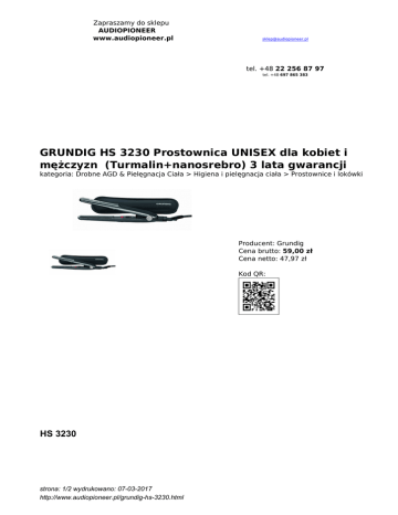 Zapraszamy do sklepu AUDIOPIONEER www.audiopioneer.pl [email protected] tel. +48 22 256 87 97 tel. +48 697 865 383 GRUNDIG HS 3230 Prostownica UNISEX dla kobiet i mężczyzn (Turmalin+nanosrebro) 3 lata gwarancji kategoria: Drobne AGD & Pielęgnacja Ciała > Higiena i pielęgnacja ciała > Prostownice i lokówki Producent: Grundig Cena brutto: 59,00 zł Cena netto: 47,97 zł Kod QR: HS 3230 strona: 1/2 wydrukowano: 07-03-2017 http://www.audiopioneer.pl/grundig-hs-3230.html Podró?na prostownica do w?osów P?ytki grzejne z pow?ok? ceramiczn?(Turmalin+nanosrebro) które zapewniaj? ochron? przed przegrzaniem dzi?ki równomiernej emisji ciep?a i wspomagaj? regeneracj? struktury w?osa. W?osy wygl?daj? zdrowo i maj? naturalny po?ysk. Dzi?ki technologi Nano Silver i obróbce p?ytek s? one bardzo odporne na dzia?anie wszelkich chemikaliów i kosmetyków. Cz?steczki srebra maj? dzia?anie antybakteryjne! Turmalin po podgrzaniu wytwarza równie? ciep?o podczerwone, które jest bardziej przyjazne dla w?osów, zapobiega wysuszaniu i chroni zewn?trzn? warstw? w?osa. EXTRA w?skie p?ytki grzejne idealne do w?osów krótkich ( damskich & meskich) Sta?a wysoka temperatura: 190 ° C - 210 ° C Szybki czas nagrzewania – 60 sek. (do 120 ° C) Zasilanie 120-240V, 50/60 Hz: funkcja automatycznego wyboru napi?cia pozwala u?ywa? urz?dzenie na ca?ym ?wiecie Przewód zasilaj?cy o d?ugo?ci 1,8 m z obrotowym przegubem, zapewniaj?cym swobod? ruchów podczas modelowania, przewód nie pl?cze si? Kolor: czarny/antracyt 3 lata gwarancji strona: 2/2 wydrukowano: 07-03-2017 http://www.audiopioneer.pl/grundig-hs-3230.html