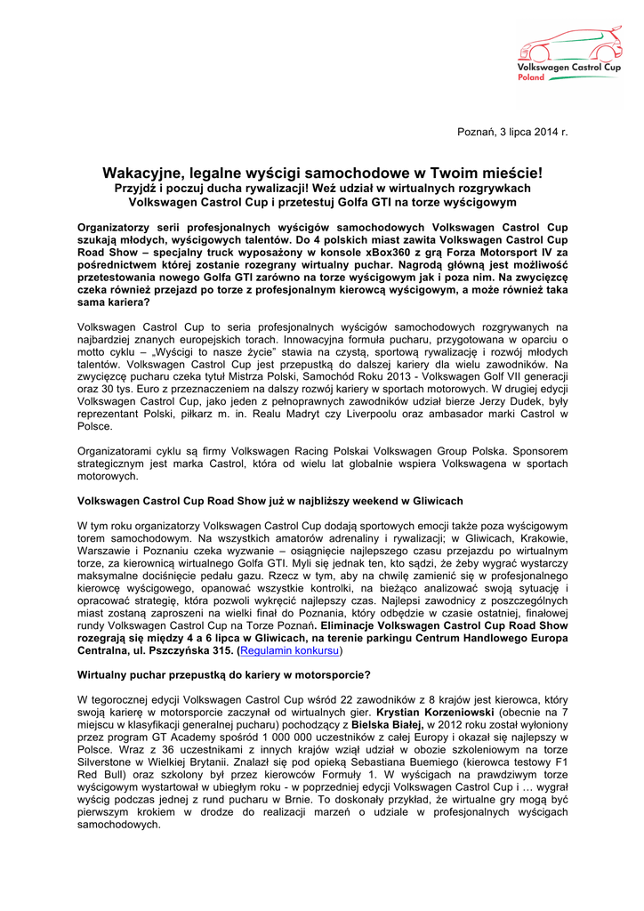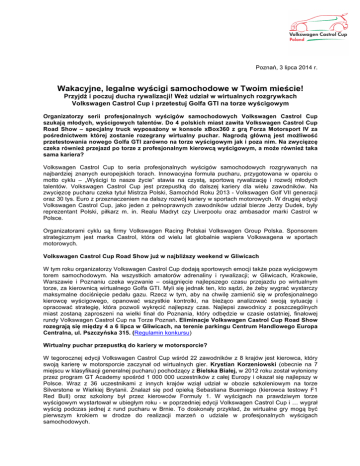 Poznań, 3 lipca 2014 r. Wakacyjne, legalne wyścigi samochodowe w Twoim mieście! Przyjdź i poczuj ducha rywalizacji! Weź udział w wirtualnych rozgrywkach Volkswagen Castrol Cup i przetestuj Golfa GTI na torze wyścigowym Organizatorzy serii profesjonalnych wyścigów samochodowych Volkswagen Castrol Cup szukają młodych, wyścigowych talentów. Do 4 polskich miast zawita Volkswagen Castrol Cup Road Show – specjalny truck wyposażony w konsole xBox360 z grą Forza Motorsport IV za pośrednictwem której zostanie rozegrany wirtualny puchar. Nagrodą główną jest możliwość przetestowania nowego Golfa GTI zarówno na torze wyścigowym jak i poza nim. Na zwycięzcę czeka również przejazd po torze z profesjonalnym kierowcą wyścigowym, a może również taka sama kariera? Volkswagen Castrol Cup to seria profesjonalnych wyścigów samochodowych rozgrywanych na najbardziej znanych europejskich torach. Innowacyjna formuła pucharu, przygotowana w oparciu o motto cyklu – „Wyścigi to nasze życie” stawia na czystą, sportową rywalizację i rozwój młodych talentów. Volkswagen Castrol Cup jest przepustką do dalszej kariery dla wielu zawodników. Na zwycięzcę pucharu czeka tytuł Mistrza Polski, Samochód Roku 2013 - Volkswagen Golf VII generacji oraz 30 tys. Euro z przeznaczeniem na dalszy rozwój kariery w sportach motorowych. W drugiej edycji Volkswagen Castrol Cup, jako jeden z pełnoprawnych zawodników udział bierze Jerzy Dudek, były reprezentant Polski, piłkarz m. in. Realu Madryt czy Liverpoolu oraz ambasador marki Castrol w Polsce. Organizatorami cyklu są firmy Volkswagen Racing Polskai Volkswagen Group Polska. Sponsorem strategicznym jest marka Castrol, która od wielu lat globalnie wspiera Volkswagena w sportach motorowych. Volkswagen Castrol Cup Road Show już w najbliższy weekend w Gliwicach W tym roku organizatorzy Volkswagen Castrol Cup dodają sportowych emocji także poza wyścigowym torem samochodowym. Na wszystkich amatorów adrenaliny i rywalizacji; w Gliwicach, Krakowie, Warszawie i Poznaniu czeka wyzwanie – osiągnięcie najlepszego czasu przejazdu po wirtualnym torze, za kierownicą wirtualnego Golfa GTI. Myli się jednak ten, kto sądzi, że żeby wygrać wystarczy maksymalne dociśnięcie pedału gazu. Rzecz w tym, aby na chwilę zamienić się w profesjonalnego kierowcę wyścigowego, opanować wszystkie kontrolki, na bieżąco analizować swoją sytuację i opracować strategię, która pozwoli wykręcić najlepszy czas. Najlepsi zawodnicy z poszczególnych miast zostaną zaproszeni na wielki finał do Poznania, który odbędzie w czasie ostatniej, finałowej rundy Volkswagen Castrol Cup na Torze Poznań. Eliminacje Volkswagen Castrol Cup Road Show rozegrają się między 4 a 6 lipca w Gliwicach, na terenie parkingu Centrum Handlowego Europa Centralna, ul. Pszczyńska 315. (Regulamin konkursu) Wirtualny puchar przepustką do kariery w motorsporcie? W tegorocznej edycji Volkswagen Castrol Cup wśród 22 zawodników z 8 krajów jest kierowca, który swoją karierę w motorsporcie zaczynał od wirtualnych gier. Krystian Korzeniowski (obecnie na 7 miejscu w klasyfikacji generalnej pucharu) pochodzący z Bielska Białej, w 2012 roku został wyłoniony przez program GT Academy spośród 1 000 000 uczestników z całej Europy i okazał się najlepszy w Polsce. Wraz z 36 uczestnikami z innych krajów wziął udział w obozie szkoleniowym na torze Silverstone w Wielkiej Brytanii. Znalazł się pod opieką Sebastiana Buemiego (kierowca testowy F1 Red Bull) oraz szkolony był przez kierowców Formuły 1. W wyścigach na prawdziwym torze wyścigowym wystartował w ubiegłym roku - w poprzedniej edycji Volkswagen Castrol Cup i … wygrał wyścig podczas jednej z rund pucharu w Brnie. To doskonały przykład, że wirtualne gry mogą być pierwszym krokiem w drodze do realizacji marzeń o udziale w profesjonalnych wyścigach samochodowych. Jak wirtualne wyścigi zmieniły wyścigowego? (Obejrzyj film). życie Krystiana w profesjonalnego kierowcę - Moje marzenia ciągle się spełniają. W Volkswagen Castrol Cup jest wszystko - radość, podniecenie, a także chęć rywalizacji i zwycięstwa. Następuje 100% skupienie i oczekiwanie na start. Niezależnie od tego czy ścigam się na prawdziwym czy wirtualnym torze – moje treningi opierają się głownie na symulatorach. Polecam wszystkim tym, którzy myślą o motorsporcie poważnie jak i tym, którzy zwyczajnie chcą się sprawdzić, poczuć ducha rywalizacji i sportowych emocji – mówi Krystian Korzeniowski, zawodnik Volkswagen Castrol Cup 2014. www.volkswagencastrolcup.pl – najświeższe informacje Na stronie internetowej pucharu www.volkswagencastrolcup.pl dostępne są informacje dotyczące wszystkich rund, zawodników, torów wyścigowych oraz samochodu. W ciągu weekendu wyścigowego publikowane będą aktualne informacje o przebiegu treningów, kwalifikacji oraz wyścigów. W zakładce media zamieszczane są komunikaty prasowe oraz zdjęcia. Castrol wspiera najlepszych W ramach globalnego partnerstwa, marki Castrol i Volkswagen już od wielu lat razem opracowują nowoczesne rozwiązania technologiczne i udoskonalają oleje oraz inne płyny eksploatacyjne, które są stosowane fabrycznie w autach grupy Volkswagen. Współpraca oznacza również wspólne projekty w sportach motorowych i liczne sukcesy takie jak na przykład zwycięstwo Sebastiana Ogiera w Rajdowych Mistrzostwach Świata. Sponsorzy główni: Castrol, Hankook, VW Bank Polska oraz STS Centrum Dystrybucji Samochodów. Partnerzy: VW Motorsport, Volkswagen R GmbH, PZM, ATS, OMP, Bilstein oraz Eibach. Partnerzy Road Show: Scania, Microsoft. Kontakt dla mediów: • Tomasz Tonder, Volkswagen PR Manager, tel. 690 406 401, e-mail: [email protected] • Dorota Staszewska – Kumiszcze, Castrol Sponsorship & Public Relation Manager, tel. 663 994 862, e-mail: [email protected] • Koordynacja Agencja: Beata Szozda, tel. 502 091 922, e-m