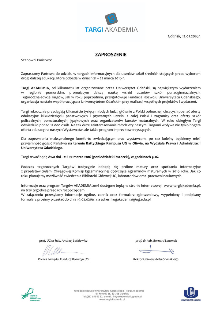 Gdańsk, 12.01.2016r. ZAPROSZENIE Szanowni Państwo! Zapraszamy Państwa do udziału w targach informacyjnych dla uczniów szkół średnich stojących przed wyborem drogi dalszej edukacji, które odbędą w dniach 21 – 22 marca 2016 r. Targi AKADEMIA, od kilkunastu lat organizowane przez Uniwersytet Gdański, są największym wydarzeniem w regionie pomorskim, promującym dalszą naukę wśród uczniów szkół ponadgimnazjalnych. Tegoroczną edycję Targów, jak w roku poprzednim, przygotowuje Fundacja Rozwoju Uniwersytetu Gdańskiego, organizacja na stałe współpracująca z Uniwersytetem Gdańskim przy realizacji wspólnych projektów i wydarzeń. Targi rokrocznie przyciągają kilkanaście tysięcy młodych ludzi, głównie z Polski północnej, chcących poznać oferty edukacyjne kilkudziesięciu państwowych i prywatnych uczelni z całej Polski i zagranicy oraz oferty szkół policealnych, pomaturalnych, językowych oraz organizatorów kursów maturalnych. W roku ubiegłym Targi odwiedziło ponad 12 000 osób. Na tak duże zainteresowanie młodzieży naszymi Targami wpływa nie tylko bogata oferta edukacyjna naszych Wystawców, ale także program imprez towarzyszących. Dla zapewnienia maksymalnego komfortu zwiedzającym oraz wystawcom, po raz kolejny będziemy mieli przyjemność gościć Państwa na terenie Bałtyckiego Kampusu UG w Oliwie, na Wydziale Prawa i Administracji Uniwersytetu Gdańskiego. Targi trwać będą dwa dni - 21 i 22 marca 2016 (poniedziałek i wtorek), w godzinach 9-16. Podczas tegorocznych Targów tradycyjnie odbędą się próbne matury oraz spotkania informacyjne z przedstawicielami Okręgowej Komisji Egzaminacyjnej dotyczące egzaminów maturalnych w 2016 roku. Jak co roku planujemy możliwość zwiedzenia Biblioteki Głównej UG, laboratoriów oraz pracowni naukowych. Informacje oraz program Targów AKADEMIA 2016 dostępne będą na stronie internetowej www.targiakademia.pl, na trzy tygodnie przed ich rozpoczęciem. W załączeniu przesyłamy informacje ogólne, cennik oraz formularz zgłoszeniowy, wypełniony i podpisany formularz prosimy przesłać do dnia 19.02.0216r. na adres [email protected] prof. UG dr hab. Andrzej Letkiewicz prof. dr hab. Bernard Lammek Prezes Zarządu Fundacji Rozwoju UG Rektor Uniwersytetu Gdańskiego FORMULARZ ZGŁOSZENIOWY – ZAMÓWIENIE Termin przyjmowania zgłoszeń: do 19 lutego 2016 r. Dane do faktury: Nazwa wystawcy: ……………………………………………………………………………………………………….………… NIP: ………………………………………………………. ul. ………………………………………………………… Kod: …………………… Miejscowość: ……………………………………….…… Dane dodatkowe: Osoba upoważniona do kontaktu: …………………………………………………www……………………………………… Nr tel.: ………………………………… Nr faksu: ………………………….… E-mail:…………………………………............ Napis na fryzie:…………………………………………………………………………………………………………..………… Zamawiamy stoisko: Stoisko: (minimalna powierzchnia 4 m2) Proszę zakreślić wybrany zestaw: (tylko w przypadku stoisk zabudowanych!) zabudowane z wyposażeniem niezabudowane bez wyposażenia 320 zł za 1 m2 200 zł za 1 m2 stolik i 4 krzesła / 4m2 lub lada i 2 krzesła / 4m2 Wybór: zabudowane / niezabudowane Cena brutto / vat 23 % / za 1 m2 Koszt brutto m2 zł - Obowiązkowy wpisu do katalogu: (nazwa instytucji zgodna z napisem na fryzie, dane teleadresowe, tekst do 1400 znaków ze spacjami) Treść wpisu proszę przysłać mailem do dnia 19.02.2016r. na adres [email protected], w pliku Word. W nazwie pliku prosimy wpisać skrót nazwy wystawcy. 450 zł Umieszczenie logo firmy we wpisie do katalogu 150 zł zł Ogłoszenie reklamowe / w formie plakatu/ w katalogu wystawców: A5 czarno- białe 500 zł zł A5 w kolorze 680 zł zł Dodatkowe zamówienia: (co, ilość, cena, koszt) – informacje w cenniku zł RAZEM (brutto) zł Internet: Imię i nazwisko osoby odpowiedzialnej za dostęp do Internetu na stoisku: Oświadczamy, że zapoznawaliśmy się w warunkami uczestnictwa w Targach AKADEMIA i akceptujemy je w całości. Data, pieczątka instytucji, podpis prawnie wiążący INFORMACJE OGÓLNE Organizator: Uniwersytet Gdański i Fundacja Rozwoju Uniwersytetu Gdańskiego – Targi AKADEMIA ul. Polanki 66, 80-306 Gdańsk tel. 058 / 552-03-53, fax.: 058 / 552-37-06, e-mail: [email protected] Termin i miejsce Targów: 21-22 marca 2016 r. Bałtycki Kampus Uniwersytetu Gdańskiego Wydział Prawa i Administracji Uniwersytetu Gdańskiego ul. Jana Bażyńskiego 6, 80-952 Gdańsk Godziny otwarcia dla zwiedzających: 21-22 marca 2016 r. (poniedziałek, wtorek): godz. 9:00 - 16:00 Internet Specjalnie dla wystawców organizator przygotuje loginy i hasła do zalogowania się do Internetu. Zgłoszenie zapotrzebowania należy wpisać w formularzu zgłoszeniowym. Na terenie targów działa również EDUROAM, więcej informacji na stronie http://eduroam.ug.edu.pl. Imprezy główne: - stoiska informacyjne wystawców - możliwość zwiedzania laboratoriów, pracowni oraz Biblioteki Głównej UG - spotkania maturzystów z ekspertami Okręgowej Komisji Egzaminacyjnej - próbne matury - konkurs na najatrakcyjniejsze stoisko Targów Akademia 2016 Warunki uczestnictwa: - Termin zgłoszenia udziału: do 19 lutego 2016 r., na podstawie załączonego formularza zgłoszeniowego zamówienia. - Protokolarny odbiór stoisk przez Wystawców: 20 marca 2016 r. w godz. 14:00 - 18:00 oraz 21 marca 2016 r. w godzinach 7.00- 8.30 - Protokolarny zwrot stoisk organizatorom: 22 marca 2016 r. od godz. 16:30 – 18:00 - Płatność: wystawca dokonuje wpłaty na konto Fundacji Rozwoju UG, w terminie 7 dni od daty otrzymania faktury VAT