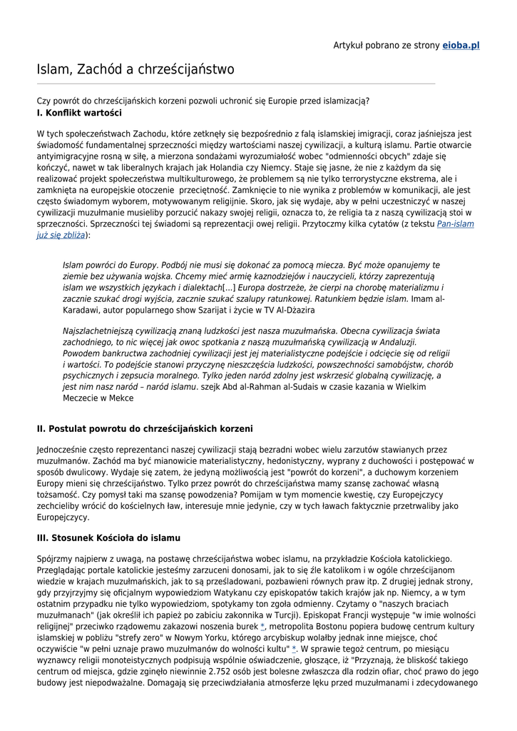 Artykuł pobrano ze strony eioba.pl Islam, Zachód a chrześcijaństwo Czy powrót do chrześcijańskich korzeni pozwoli uchronić się Europie przed islamizacją? I. Konflikt wartości W tych społeczeństwach Zachodu, które zetknęły się bezpośrednio z falą islamskiej imigracji, coraz jaśniejsza jest świadomość fundamentalnej sprzeczności między wartościami naszej cywilizacji, a kulturą islamu. Partie otwarcie antyimigracyjne rosną w siłę, a mierzona sondażami wyrozumiałość wobec "odmienności obcych" zdaje się kończyć, nawet w tak liberalnych krajach jak Holandia czy Niemcy. Staje się jasne, że nie z każdym da się realizować projekt społeczeństwa multikulturowego, że problemem są nie tylko terrorystyczne ekstrema, ale i zamknięta na europejskie otoczenie przeciętność. Zamknięcie to nie wynika z problemów w komunikacji, ale jest często świadomym wyborem, motywowanym religijnie. Skoro, jak się wydaje, aby w pełni uczestniczyć w naszej cywilizacji muzułmanie musieliby porzucić nakazy swojej religii, oznacza to, że religia ta z naszą cywilizacją stoi w sprzeczności. Sprzeczności tej świadomi są reprezentacji owej religii. Przytoczmy kilka cytatów (z tekstu Pan-islam już się zbliża): Islam powróci do Europy. Podbój nie musi się dokonać za pomocą miecza. Być może opanujemy te ziemie bez używania wojska. Chcemy mieć armię kaznodziejów i nauczycieli, którzy zaprezentują islam we wszystkich językach i dialektach[...] Europa dostrzeże, że cierpi na chorobę materializmu i zacznie szukać drogi wyjścia, zacznie szukać szalupy ratunkowej. Ratunkiem będzie islam. Imam alKaradawi, autor popularnego show Szarijat i życie w TV Al-Dżazira Najszlachetniejszą cywilizacją znaną ludzkości jest nasza muzułmańska. Obecna cywilizacja świata zachodniego, to nic więcej jak owoc spotkania z naszą muzułmańską cywilizacją w Andaluzji. Powodem bankructwa zachodniej cywilizacji jest jej materialistyczne podejście i odcięcie się od religii i wartości. To podejście stanowi przyczynę nieszczęścia ludzkości, powszechności samobójstw, chorób psychicznych i zepsucia moralnego. Tylko jeden naród zdolny jest wskrzesić globalną cywilizację, a jest nim nasz naród – naród islamu. szejk Abd al-Rahman al-Sudais w czasie kazania w Wielkim Meczecie w Mekce II. Postulat powrotu do chrześcijańskich korzeni Jednocześnie często reprezentanci naszej cywilizacji stają bezradni wobec wielu zarzutów stawianych przez muzułmanów. Zachód ma być mianowicie materialistyczny, hedonistyczny, wyprany z duchowości i postępować w sposób dwulicowy. Wydaje się zatem, że jedyną możliwością jest "powrót do korzeni", a duchowym korzeniem Europy mieni się chrześcijaństwo. Tylko przez powrót do chrześcijaństwa mamy szansę zachować własną tożsamość. Czy pomysł taki ma szansę powodzenia? Pomijam w tym momencie kwestię, czy Europejczycy zechcieliby wrócić do kościelnych ław, interesuje mnie jedynie, czy w tych ławach faktycznie przetrwaliby jako Europejczycy. III. Stosunek Kościoła do islamu Spójrzmy najpierw z uwagą, na postawę chrześcijaństwa wobec islamu, na przykładzie Kościoła katolickiego. Przeglądając portale katolickie jesteśmy zarzuceni donosami, jak to się źle katolikom i w ogóle chrześcijanom wiedzie w krajach muzułmańskich, jak to są prześladowani, pozbawieni równych praw itp. Z drugiej jednak strony, gdy przyjrzyjmy się oficjalnym wypowiedziom Watykanu czy episkopatów takich krajów jak np. Niemcy, a w tym ostatnim przypadku nie tylko wypowiedziom, spotykamy ton zgoła odmienny. Czytamy o "naszych braciach muzułmanach" (jak określił ich papież po zabiciu zakonnika w Turcji). Episkopat Francji występuje "w imie wolności religijnej" przeciwko rządowemu zakazowi noszenia burek *, metropolita Bostonu popiera budowę centrum kultury islamskiej w pobliżu "strefy zero" w Nowym Yorku, którego arcybiskup wolałby jednak inne miejsce, choć oczywiście "w pełni uznaje prawo muzułmanów do wolności kultu" *. W sprawie tegoż centrum, po miesiącu wyznawcy religii monoteistycznych podpisują wspólnie oświadczenie, głoszące, iż "Przyznają, że bliskość takiego centrum od miejsca, gdzie zginęło niewinnie 2.752 osób jest bolesne zwłaszcza dla rodzin ofiar, choć prawo do jego budowy jest niepodważalne. Domagają się przeciwdziałania atmosferze lęku przed muzułmanami i zdecydowanego potępienia propozycji palenia Koranu w dniu 11 września." * Niemieccy katolicy wspólnie z protestantami potępiają wszelkie przejawy ruchów antyislamskich *. Podobnie zresztą w Polsce Rada Wspólna Katolików i Muzułmanów potępiła protest przeciw budowie meczetu w Warszawie *. Za tym głosem zdarza się, że podążają także wierni, czasem w tak groteskowy sposób jak przypadku protestantów i katolików, którzy podarowali egzemplarze Koranu dla muzułmanów odsiadujących karę w australijskich więzieniach*. We wszystkich tych działaniach widzimy jedno: chrześcijanom zależy na ułożeniu pokojowych stosunków z islamem, dialogu i uzyskaniu w państwach islamskich podobnych warunków działania o jakie walczą dla muzułmanów w Europie, zależy im na wszystkim, tylko nie na obronie tożsamości Europy. Nie powinno to dziwić. Założyciel chrześcijaństwa powiedział wszak: Moją matką i moimi braćmi są ci, którzy słuchają słowa Bożego i wypełniają je (Łk 8,20-21). Odrzucił zatem wszelkie naturalne więzi rodzinne, plemienne czy narodowe. Dla Kościoła odtąd liczy się tylko interes własny, dla którego gotów poświęcić interes całych krajów, co w sfabularyzowanej formie można było obejrzeć na filmie Rolanda Joffé Misja. Doświadczaliśmy tego również na własnej skórze, jako Polacy. Kościół bronił interesu narodu tylko wtedy, gdy było to w jego interesie: gdy wrogami narodu byli innowiercy czy ateisci. [tu przykłady w drugą str