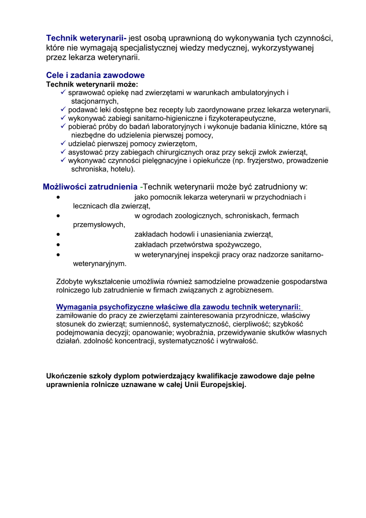 Technik weterynarii- jest osobą uprawnioną do wykonywania tych czynności, które nie wymagają specjalistycznej wiedzy medycznej, wykorzystywanej przez lekarza weterynarii. Cele i zadania zawodowe Technik weterynarii może: sprawować opiekę nad zwierzętami w warunkach ambulatoryjnych i stacjonarnych, podawać leki dostępne bez recepty lub zaordynowane przez lekarza weterynarii, wykonywać zabiegi sanitarno-higieniczne i fizykoterapeutyczne, pobierać próby do badań laboratoryjnych i wykonuje badania kliniczne, które są niezbędne do udzielenia pierwszej pomocy, udzielać pierwszej pomocy zwierzętom, asystować przy zabiegach chirurgicznych oraz przy sekcji zwłok zwierząt, wykonywać czynności pielęgnacyjne i opiekuńcze (np. fryzjerstwo, prowadzenie schroniska, hotelu). Możliwości zatrudnienia -Technik weterynarii może być zatrudniony w: jako pomocnik lekarza weterynarii w przychodniach i lecznicach dla zwierząt, w ogrodach zoologicznych, schroniskach, fermach przemysłowych, zakładach hodowli i unasieniania zwierząt, zakładach przetwórstwa spożywczego, w weterynaryjnej inspekcji pracy oraz nadzorze sanitarnoweterynaryjnym. Zdobyte wykształcenie umożliwia również samodzielne prowadzenie gospodarstwa rolniczego lub zatrudnienie w firmach związanych z agrobiznesem. Wymagania psychofizyczne właściwe dla zawodu technik weterynarii: zamiłowanie do pracy ze zwierzętami zainteresowania przyrodnicze, właściwy stosunek do zwierząt; sumienność, systematyczność, cierpliwość; szybkość podejmowania decyzji; opanowanie; wyobraźnia, przewidywanie skutków własnych działań. zdolność koncentracji, systematyczność i wytrwałość. Ukończenie szkoły dyplom potwierdzający kwalifikacje zawodowe daje pełne uprawnienia rolnicze uznawane w całej Unii Europejskiej.