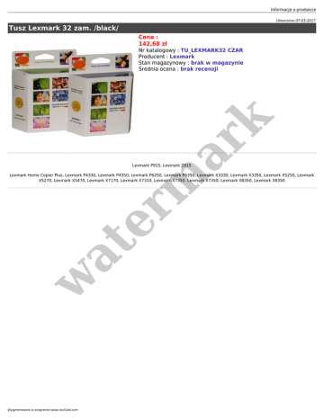 Informacje o produkcie Utworzono 07-03-2017 Tusz Lexmark 32 zam. /black/ Cena : 142,68 zł er m ar k Nr katalogowy : TU_LEXMARK32 CZAR Producent : Lexmark Stan magazynowy : brak w magazynie Średnia ocena : brak recenzji Lexmark P915, Lexmark Z815 w at Lexmark Home Copier Plus, Lexmark P4330, Lexmark P4350, Lexmark P6250, Lexmark P6350, Lexmark X3330, Lexmark X3350, Lexmark X5250, Lexmark X5270, Lexmark X5470, Lexmark X7170, Lexmark X7310, Lexmark X7350, Lexmark X7350, Lexmark X8350, Lexmark X8350 Wygenerowano w programie www.oscGold.com