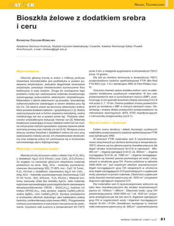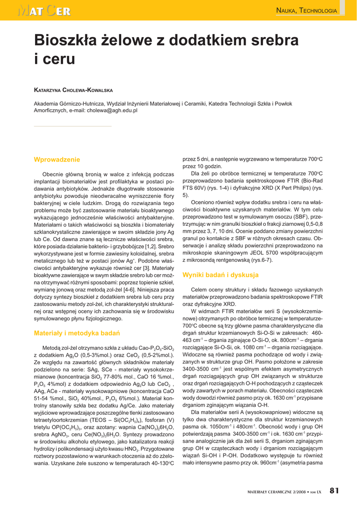 MatCer NAUKA, TECHNOLOGIA Bioszka elowe z dodatkiem srebra i ceru KATARZYNA CHOLEWA-KOWALSKA Akademia Górniczo-Hutnicza, Wydzia Inynierii Materiaowej i Ceramiki, Katedra Technologii Szka i Powok Amorcznych, e-mail: [email protected] Wprowadzenie Obecnie gówn broni w walce z infekcj podczas implantacji biomateriaów jest prolaktyka w postaci podawania antybiotyków. Jednake dugotrwae stosowanie antybiotyku powoduje nieodwracalne wyniszczenie ory bakteryjnej w ciele ludzkim. Drog do rozwizania tego problemu moe by zastosowanie materiau bioaktywnego wykazujcego jednoczenie waciwoci antybakteryjne. Materiaami o takich waciwoci s bioszka i biomateriay szklanokrystaliczne zawierajce w swoim skadzie jony Ag lub Ce. Od dawna znane s lecznicze waciwoci srebra, które posiada dziaanie bakterio- i grzybobójcze [1,2]. Srebro wykorzystywane jest w formie zawiesiny koloidalnej, srebra metalicznego lub te w postaci jonów Ag+. Podobne waciwoci antybakteryjne wykazuje równie cer [3]. Materiay bioaktywne zawierajce w swym skadzie srebro lub cer mona otrzymywa rónymi sposobami: poprzez topienie szkie, wymian jonow oraz metod zol-el [4-6]. Niniejsza praca dotyczy syntezy bioszkie z dodatkiem srebra lub ceru przy zastosowaniu metody zol-el, ich charakterystyki strukturalnej oraz wstpnej oceny ich zachowania si w rodowisku symulowanego pynu zjologicznego. Materiay i metodyka bada Metod zol-el otrzymano szka z ukadu Cao-P2O5-SiO2 z dodatkiem Ag2O (0,5-3%mol.) oraz CeO2 (0,5-2%mol.). Ze wzgldu na zawarto gównych skadników materiay podzielono na serie: SAg, SCe - materiay wysokokrzemianowe (koncentracja SiO2 77-80% mol., CaO 16 %mol., P2O5 4%mol) z dodatkiem odpowiednio Ag2O lub CeO2 , AAg, ACe - materiay wysokowapniowe (koncentracja CaO 51-54 %mol., SiO2 40%mol., P2O5 6%mol.). Materia kontrolny stanowiy szka bez dodatku Ag/Ce. Jako materiay wyjciowe wprowadzajce poszczególne tlenki zastosowano tetraetyloortokrzemian (TEOS – Si(OC2H5)4), fosforan (V) trietylu OP(OC2H5)3, oraz azotany: wapnia Ca(NO3)26H2O, srebra AgNO3, ceru Ce(NO3)36H2O. Syntezy prowadzono w rodowisku alkoholu etylowego, jako katalizatora reakcji hydrolizy i polikondensacji uyto kwasu HNO3. Przygotowane roztwory pozostawiono w warunkach otoczenia a do zelowania. Uzyskane ele suszono w temperaturach 40-130oC przez 5 dni, a nastpnie wygrzewano w temperaturze 700oC przez 10 godzin. Dla eli po obróbce termicznej w temperaturze 700oC przeprowadzono badania spektroskopowe FTIR (Bio-Rad FTS 60V) (rys. 1-4) i dyfrakcyjne XRD (X Pert Philips) (rys. 5). Oceniono równie wpyw dodatku srebra i ceru na waciwoci bioaktywne uzyskanych materiaów. W tym celu przeprowadzono test w symulowanym osoczu (SBF), przetrzymujc w nim granulki bioszkie o frakcji ziarnowej 0,5-0,8 mm przez 3, 7, 10 dni. Ocenie poddano zmiany powierzchni granul po kontakcie z SBF w rónych okresach czasu. Obserwacje i analiz skadu powierzchni przeprowadzono na mikroskopie skaningowym JEOL 5700 wspópracujcym z mikrosond rentgenowsk (rys.6-7). Wyniki bada i dyskusja Celem oceny struktury i skadu fazowego uzyskanych materiaów przeprowadzono badania spektroskopowe FTIR oraz dyfrakcyjne XRD. W widmach FTIR materiaów serii S (wysokokrzemianowe) otrzymanych po obróbce termicznej w temperaturze700oC obecne s trzy gówne pasma charakterystyczne dla drga struktur krzemianowych Si-O-Si w zakresach: 460463 cm-1 – drgania zginajce O-Si-O, ok. 800cm-1 – drgania rozcigajce Si-O-Si, ok. 1080 cm-1 – drgania rozcigajce. Widoczne s równie pasma pochodzce od wody i zwizanych w strukturze grup OH. Pasmo pooone w zakresie 3400-3500 cm-1 jest wspólnym efektem asymetrycznych drga rozcigajcych grup OH zwizanych w strukturze oraz drga rozcigajcych O-H pochodzcych z czsteczek wody zawartych w porach materiau. Obecnoci czsteczek wody dowodzi równie pasmo przy ok. 1630 cm-1 przypisane drganiom zginajcym wizania O-H. Dla materiaów serii A (wysokowapniowe) widoczne s tylko dwa charakterystyczne dla struktur krzemianowych pasma ok. 1050cm-1 i 480cm-1. Obecno wody i grup OH potwierdzaj pasma 3400-3500 cm-1 i ok. 1630 cm-1 przypisane analogicznie jak dla eli serii S, drganiom zginajcym grup OH w czsteczkach wody i drganiom rozcigajcym wiza Si-OH i P-OH. Dodatkowo wystpuje tu równie mao intensywne pasmo przy ok. 960cm-1 (asymetria pasma MATERIA£Y CERAMICZNE 2/2008 • tom LX 81 Absorbancja [j.u.] NAUKA, TECHNOLOGIA Liczby falowe [cm-1] 82 Rys. 2. Widma FTIR eli serii AAg po wygrzewaniu w temperaturze 700oC: a) 1%Ag2O, b) 2%Ag2O, c) 3%Ag2O Rys. 3. Widma FTIR eli serii SCe po wygrzewaniu w temperaturze 700oC: a) 0,5%CeO2, b) 1%CeO2, c) 2%CeO2 z max. przy ok. 1050 cm-1) pochodzce od deformacyjnych drga grup OH zwizanych z Si i P. Dla wszystkich materiaów serii A i dla materiaów serii S o 2-3% zawartoci Ag2O widoczne s pasma charakterystyczne dla drga wiza w grupach fosforanowych apatytu przy ok. 570 i 605 cm-1 (drgania zginajce O-P-O). W zakresach liczb falowych odpowiadajcych drganiom wiza Si-O-Si znajduj si równie drgania wiza P-O-P w ugrupowaniach fosforanowych co powoduje koincydencj drga i utrudnia interpretacj widm. Niemniej jednak, ze wzgldu na wystpowanie pasm 570 i 605 cm-1 , w pasmach przy ok. 1050-1080cm-1 oraz 460-480 cm-1 obecne s drgania zwizane z grupami [PO4] w strukturze materiau. Pasma te mona przypisa odpowiednio drganiom rozcigajcym P-O-P oraz drganiom zginajcym O-P-O. Kombinacja drga P-O-P i Si-O-Si w przypadku materiaów serii S powoduje asymetri pasma z maksimum przy 1080 cm-1. Poszerzenie tego pasma a do ok. 1220cm-1 moe wiadczy o wystpowaniu w strukturze materiaów wiza P=O. Dodatkowo dla materiaów serii A z 2 i 3 % mol. udziaem tlenku srebra widoczne s ostre lecz mao intensywne pasma w zakresach 511 - 517 cm-1, 712-880 cm-1 905-1000 cm-1. Obecno tych pasm jest wynikiem czciowej krystalizacji materiaów; krystalizacja HAp powoduje pojawienie si pasm w zakresie 920-1000 cm-1 , natomiast pasma w zakresie niszych liczb falowych zwizane s najprawdopodobniej z tworzeniem si kr