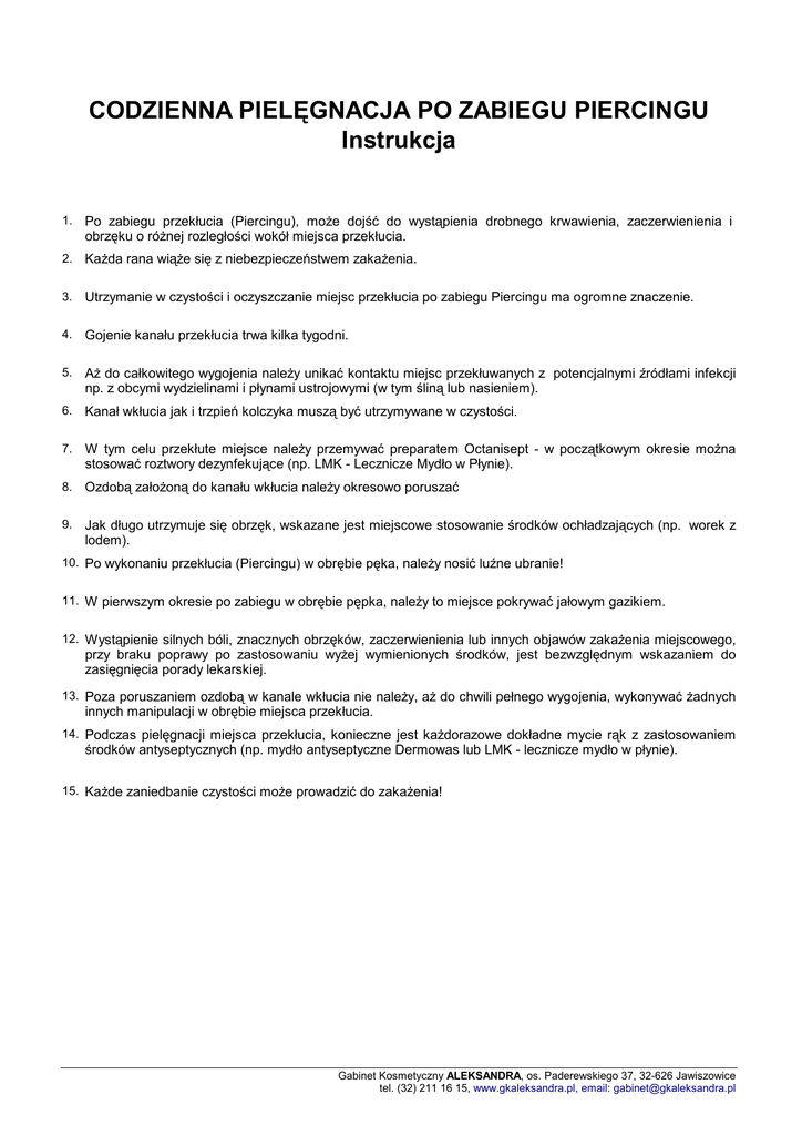 CODZIENNA PIELĘGNACJA PO ZABIEGU PIERCINGU Instrukcja 1. Po zabiegu przekłucia (Piercingu), moŜe dojść do wystąpienia drobnego krwawienia, zaczerwienienia i obrzęku o róŜnej rozległości wokół miejsca przekłucia. 2. KaŜda rana wiąŜe się z niebezpieczeństwem zakaŜenia. 3. Utrzymanie w czystości i oczyszczanie miejsc przekłucia po zabiegu Piercingu ma ogromne znaczenie. 4. Gojenie kanału przekłucia trwa kilka tygodni. 5. AŜ do całkowitego wygojenia naleŜy unikać kontaktu miejsc przekłuwanych z potencjalnymi źródłami infekcji np. z obcymi wydzielinami i płynami ustrojowymi (w tym śliną lub nasieniem). 6. Kanał wkłucia jak i trzpień kolczyka muszą być utrzymywane w czystości. 7. W tym celu przekłute miejsce naleŜy przemywać preparatem Octanisept - w początkowym okresie moŜna stosować roztwory dezynfekujące (np. LMK - Lecznicze Mydło w Płynie). 8. Ozdobą załoŜoną do kanału wkłucia naleŜy okresowo poruszać 9. Jak długo utrzymuje się obrzęk, wskazane jest miejscowe stosowanie środków ochładzających (np. worek z lodem). 10. Po wykonaniu przekłucia (Piercingu) w obrębie pęka, naleŜy nosić luźne ubranie! 11. W pierwszym okresie po zabiegu w obrębie pępka, naleŜy to miejsce pokrywać jałowym gazikiem. 12. Wystąpienie silnych bóli, znacznych obrzęków, zaczerwienienia lub innych objawów zakaŜenia miejscowego, przy braku poprawy po zastosowaniu wyŜej wymienionych środków, jest bezwzględnym wskazaniem do zasięgnięcia porady lekarskiej. 13. Poza poruszaniem ozdobą w kanale wkłucia nie naleŜy, aŜ do chwili pełnego wygojenia, wykonywać Ŝadnych innych manipulacji w obrębie miejsca przekłucia. 14. Podczas pielęgnacji miejsca przekłucia, konieczne jest kaŜdorazowe dokładne mycie rąk z zastosowaniem środków antyseptycznych (np. mydło antyseptyczne Dermowas lub LMK - lecznicze mydło w płynie). 15. KaŜde zaniedbanie czystości moŜe prowadzić do zakaŜenia! Gabinet Kosmetyczny ALEKSANDRA, os. Paderewskiego 37, 32-626 Jawiszowice tel. (32) 211 16 15, www.gkaleksandra.pl, email: [email protected]