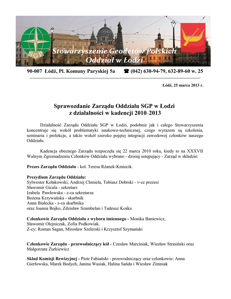 90-007 Łódź, Pl. Komuny Paryskiej 5a (042) 630-94-79, 632-89-60 w. 25 __________________________________________________________________________________________ Łódź, 25 marca 2013 r. Sprawozdanie Zarządu Oddziału SGP w Łodzi z działalności w kadencji 2010–2013 Działalność Zarządu Oddziału SGP w Łodzi, podobnie jak i całego Stowarzyszenia koncentruje się wokół problematyki naukowo-technicznej, czego wyrazem są szkolenia, seminaria i prelekcje, a także wokół szeroko pojętej integracji zawodowej członków naszego Oddziału. Kadencja obecnego Zarządu rozpoczęła się 22 marca 2010 roku, kiedy to na XXXVII Walnym Zgromadzeniu Członków Oddziału wybrano - dzisiaj ustępujący - Zarząd w składzie: Prezes Zarządu Oddziału - kol. Teresa Rżanek-Kmiecik. Prezydium Zarządu Oddziału: Sylwester Kołakowski, Andrzej Chmiela, Tobiasz Dobrski - v-ce prezesi Sławomir Gicala - sekretarz Izabela Pawłowska - z-ca sekretarza Bożena Krzywańska - skarbnik Anna Białecka - z-ca skarbnika oraz Joanna Bojko, Zdzisław Szambelan i Tadeusz Kośka Członkowie Zarządu Oddziału z wyboru imiennego - Monika Baniewicz, Sławomir Olejniczak, Zofia Podkowiak. Z-cy: Roman Sagan, Mirosław Szelerski i Krzysztof Szymański Członkowie Zarządu - przewodniczący kół - Czesław Marciniak, Wiesław Strasiński oraz Małgorzata Żurkiewicz Skład Komisji Rewizyjnej - Piotr Fabiański - przewodniczący oraz członkowie: Anna Gierłowska, Marek Bodych, Janina Wasiak, Halina Sańda i Wiesław Zimniak Skład Sądu Koleżeńskiego - Ryszard Tralewski - przewodniczący oraz członkowie: Jadwiga Mosińska, Janina Jakubowska, Jan Kwiatkowski oraz Orest Sierociński. Zarząd kadencji 2010-2013, pod przewodnictwem kol. Teresy Rżanek-Kmiecik, wpisując się w program Stowarzyszenia oraz kontynuując prace poprzedniego Zarządu i jego prezesa kol. Piotra Fabiańskiego, za priorytet uznał podnoszenie wiedzy, jak również utrzymanie i pogłębianie więzi interpersonalnych członków SGP jak i geodetów niezrzeszonych w naszym Stowarzyszeniu. Praca merytoryczna Zarządu, w kadencji 2010-2013 odbyła się na 44 protokołowanych zebraniach, w tym 6 zebraniach plenarnych. Zebrania Zarządu odbywały się z 93% frekwencją składu wybranego na XXXVII Walnym Zgromadzeniu. W zebraniach plenarnych brało udział około 60–70 członków. Niestety w omawianym okresie zmniejszyła się liczba geodetów należących do naszego oddziału - ze 112 do 107 członków (w tym 55 inżynierów oraz 49 techników), którzy są zorganizowani w 3 kołach. Prowadzona w poprzednich kadencjach działalność merytoryczna w postaci przeprowadzanych szkoleń dla geodetów była kontynuowana również w omawianym okresie sprawozdawczym. Mając za cel podwyższanie kwalifikacji zawodowych geodetów, zarówno zrzeszonych w SGP jak i niezrzeszonych oraz z uwagi na postęp techniczny a także wprowadzane zmiany w przepisach dotyczących geodezji i kartografii zorganizowano szereg szkoleń, na których omawiano m.in.: - zmiany w ustawie o gospodarce nieruchomościami (2010) układ współrzędnych płaskich „2000” (2010) zmiany w ustawie „Prawo geodezyjne i kartograficzne” w kontekście ustawy „O infrastrukturze informacji przestrzennej” (2011) - podział nieruchomości rolnych, obrót oraz wyłączanie gruntów z produkcji rolnej (2011) - planowane zmiany w sposobie obsługi geodetów w ŁOG (2012) - zmiany wprowadzone rozporządzeniem w sprawie standardów wykonywania pomiarów geodezyjnych z 9 listopada 2011 roku (2012) - tworzenie i używanie profilu zaufanego na platformie e-PUAP (2012) - pracę nowoczesnymi instrumentami geodezyjnymi. Przy okazji przeprowadzanych seminariów w latach 2010-2012 oraz spotkań integracyjnych w tymże okresie, przy współpracy firm Leica Geosystems i Trimble, zorganizowano pokazy działania sprzętu geodezyjnego najnowszej generacji, zarówno tachimetrów jak i odbiorników GNSS. Szkolenia te cieszyły się dużą popularnością wśród członków, a wykładowcami na szkoleniach byli wybitni fachowcy spoza terenu Łodzi, jak i również nasi koledzy. W okresie sprawozdawczym zorganizowano 3 kursy przygotowujące do egzaminu na uprawnienia zawodowe w dziedzinie geodezji i kartografii. Odbyły się one odpowiednio: 1. listopad – grudzień 2010 r. kurs, w którym udział wzięło 49 geodetów. 2. listopad – grudzień 2011 r. kurs, w którym udział wzięło 29 geodetów. 3. luty – marzec 2013 r., w którym udział wzięło 21 geodetów. Ważnym projektem szkoleniowym przez Zarząd Oddziału SGP w Łodzi były seminaria pod wspólnym hasłem: „Zmiany przepisów prawa w zakresie geodezji i kartografii”. W obecnej kadencji odbyły się 3 seminaria, których uczestnicy mieli możliwość wysłuchać szeregu wykładów związanych z szeroko rozumianą tematyką geodezyjną. 1. Seminarium w 2010 roku to „Zmiany przepisów prawa obowiązujących geodetów – wykonawców i pracowników administracji geodezyjnej”, które odbyło się w dniach 04-06 listopada 2010 roku w Borkach k. Tomaszowa Mazowieckiego. W jego trakcie przeprowadzono wykłady: • Nadzór geodezyjny a wykonawstwo geodezyjne – wykładowca Mirosław Szelerski – Wojewódzki Inspektor Nadzoru Geodezyjnego i Kartograficznego w Łodzi • Otoczenie prawne wykonawstwa geodezyjnego – wykładowca Aleksander Bielicki – Geodeta Województwa Łódzkiego • Zmiany w ustawie prawo geodezyjne i kartograficzne – stanowisko Związku Miast Polskich – wykładowca Wojciech Dyakowski – dyrektor Wydziału Geodezji, Katastru i Inwentaryzacji UMŁ • Budowa baz danych PZGiK w świetle nowych uwarunkowań prawnych – wykładowca Jan Schnerch – dyrektor Miejskiego Ośrodka Dokumentacji Geodezyjnej i Kartograficznej w Łodzi • Układy odniesienia. Transformacje między układami – wykładowca Marek Kłopotek • Zmiany prawa geodezyjnego i kartograficznego w związku z ustawą z dn. 4.03.2010 o infrastruktur