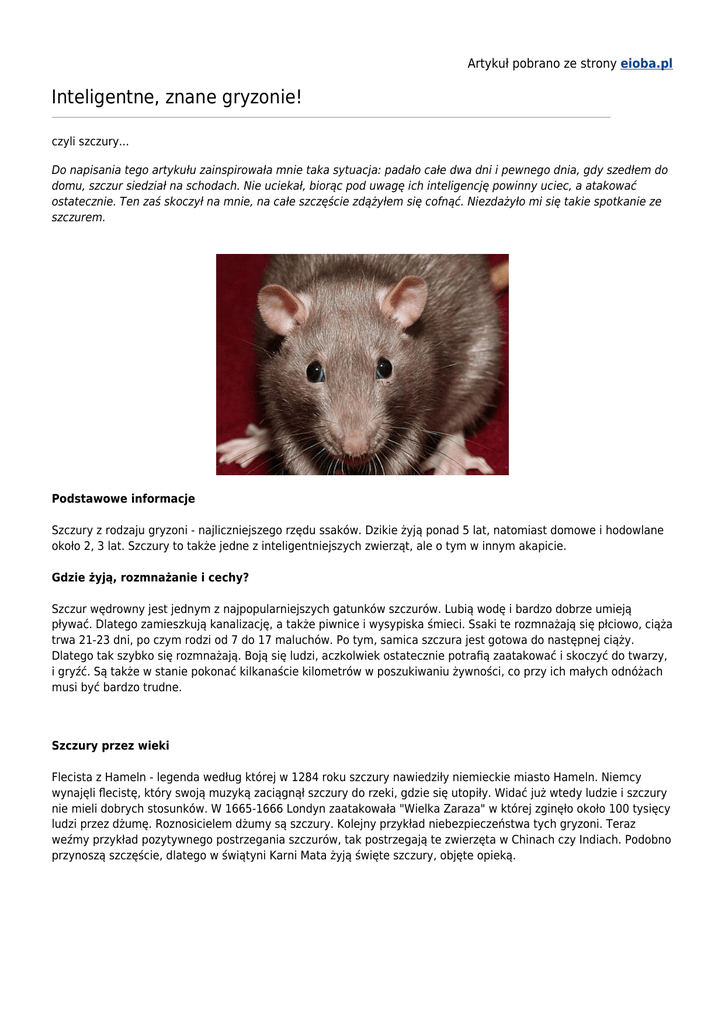 Artykuł pobrano ze strony eioba.pl Inteligentne, znane gryzonie! czyli szczury... Do napisania tego artykułu zainspirowała mnie taka sytuacja: padało całe dwa dni i pewnego dnia, gdy szedłem do domu, szczur siedział na schodach. Nie uciekał, biorąc pod uwagę ich inteligencję powinny uciec, a atakować ostatecznie. Ten zaś skoczył na mnie, na całe szczęście zdążyłem się cofnąć. Niezdażyło mi się takie spotkanie ze szczurem. Podstawowe informacje Szczury z rodzaju gryzoni - najliczniejszego rzędu ssaków. Dzikie żyją ponad 5 lat, natomiast domowe i hodowlane około 2, 3 lat. Szczury to także jedne z inteligentniejszych zwierząt, ale o tym w innym akapicie. Gdzie żyją, rozmnażanie i cechy? Szczur wędrowny jest jednym z najpopularniejszych gatunków szczurów. Lubią wodę i bardzo dobrze umieją pływać. Dlatego zamieszkują kanalizację, a także piwnice i wysypiska śmieci. Ssaki te rozmnażają się płciowo, ciąża trwa 21-23 dni, po czym rodzi od 7 do 17 maluchów. Po tym, samica szczura jest gotowa do następnej ciąży. Dlatego tak szybko się rozmnażają. Boją się ludzi, aczkolwiek ostatecznie potrafią zaatakować i skoczyć do twarzy, i gryźć. Są także w stanie pokonać kilkanaście kilometrów w poszukiwaniu żywności, co przy ich małych odnóżach musi być bardzo trudne. Szczury przez wieki Flecista z Hameln - legenda według której w 1284 roku szczury nawiedziły niemieckie miasto Hameln. Niemcy wynajęli flecistę, który swoją muzyką zaciągnął szczury do rzeki, gdzie się utopiły. Widać już wtedy ludzie i szczury nie mieli dobrych stosunków. W 1665-1666 Londyn zaatakowała "Wielka Zaraza" w której zginęło około 100 tysięcy ludzi przez dżumę. Roznosicielem dżumy są szczury. Kolejny przykład niebezpieczeństwa tych gryzoni. Teraz weźmy przykład pozytywnego postrzegania szczurów, tak postrzegają te zwierzęta w Chinach czy Indiach. Podobno przynoszą szczęście, dlatego w świątyni Karni Mata żyją święte szczury, objęte opieką. Karni Mata Inteligencja Szczury są zaliczane do najbardziej inteligentnych zwierząt. Osiągają bardzo dobre wyniki w testach z labiryntem. Prawdopodobnie przypomina to ich naturalne środowisko życia, gdzie też muszą zapamiętywać różne zaułki. Drugim testem jest "skrzynka Skinnera" w której znajduje się dźwignia, podajnik pokarmu, głośnik i lampka. Zwierzę eksplorując teren przypadkowo naciska dźwignię, która daje mu "nagrodę", im mniej takich przypadkowych kliknięć tym wyższa inteligencja szczura. Można także wprowadzić różne utrudnienia, typu poprzedzaniem naciśnięcia dźwigni jakimś sygnałem dźwiękowym. Skrzynka Skinnera Szczury doświadczalne, laboratoryjne Tym szczurom podano kukurydzę GMO. Szczury doświadczalne wykorzystywane są do eksperymentowania na nich leków czy kosmetyków i innych próbnych "dobroci". Tym samym okaleczamy ich ciała i umysły. Szczury laboratoryjne tworzone poprzez genetyczne krzyżowanie międzygatunkowe są wykorzystywane jako szczury doświadczalne, badawcze czy wystawowe. Z powodu różnych cech, budowy i długości życia są one przez jakiś czas zwierzętami domowymi. zdjęcia: Google.com Autor: 7-dni Przedruk ze strony: http://theanonimowi.blogspot.com/2013/07/inteligentne-znane-gryzonie.html Artykuł pobrano ze strony eioba.pl