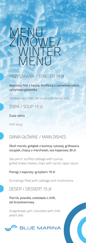MENU ZIMOWE/ WINTER MENU PRZYSTAWKA / STARTER 19 zł Wędzony filet z karpia, konfitura z czerwonej cebuli, cytrynowa galaretka Smoked carp fillet, red onion jam, lemon jelly ZUPA / SOUP 15 zł Zupa rybna Fish soup DANIA GŁÓWNE / MAIN DISHES UB-BRAND Okoń morski, gołąbek z komosy ryżowej, grillowany oscypek, chipsy z marchewki, sos kaparowy 39 zł Sea perch, stuffed cabbage with quinoa, grilled sheep cheese, chips with carrot, caper sauce Pierogi z kapustą i grzybami 19 zł Barbarossa Dumplings filled with cabbage and mushrooms DESER / DESSERT 15 zł sygnet logotyp Piernik, powidła, czekolada z chilli, żel brzoskwiniowy tauracjaGingerbread, Blue Marina jam, chocolate with chilli, peach jelly sygnet logotyp