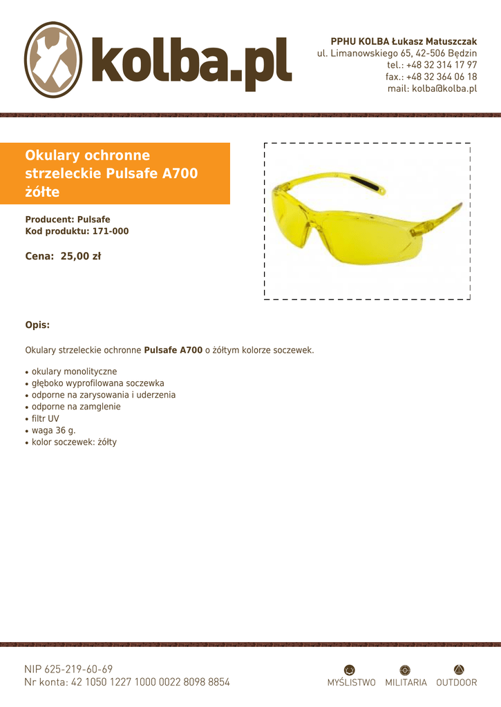 Okulary ochronne strzeleckie Pulsafe A700 żółte Producent: Pulsafe Kod produktu: 171-000 Cena: 25,00 zł Opis: Okulary strzeleckie ochronne Pulsafe A700 o żółtym kolorze soczewek. ● ● ● ● ● ● ● okulary monolityczne głęboko wyprofilowana soczewka odporne na zarysowania i uderzenia odporne na zamglenie filtr UV waga 36 g. kolor soczewek: żółty
