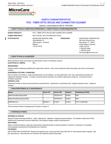Report Date : 03/01/2011 1 / 5 DATA OSTATNICH ZMIAN: 03/01/2011 NUMER PREPARATU:MCC-POCGG,MCC-POC03M,MCC-POCP KARTA CHARAKTERYSTYKI POC - FIBER OPTIC SPLICE AND CONNECTOR CLEANER Zgodnie z rozporządzenie (WE) Nr 1907/2006 1 IDENTYFIKACJA SUBSTANCJI/PREPARATU I IDENTYFIKACJA PRZEDSIĘBIORSTWA NAZWA PRODUKTU POC - FIBER OPTIC SPLICE AND CONNECTOR CLEANER NUMER PREPARATU MCC-POCGG, MCC-POC03M, MCC-POCP DYSTRYBUTOR MICROCARE EUROPE, BVBA Havendoklaan 19 1804 Cargovil - Vilvoorde Belgium +32 251 95 05 PRODUCENT MICROCARE CORPORATION 595 John Downey Drive New Britain, CT 06019 United States of America CAGE: OATV9 +1 860-827-0626 +1 860-827-8105 [email protected] 2 IDENTYFIKACJA ZAGROŻEŃ Może powodować długo utrzymujące się niekorzystne zmiany w środowisku wodnym. KLASYFIKACJA (1999/45) R53. ŚRODOWISKO Preparat zawiera substancję szkodliwą dla organizmów wodnych, która może wywoływać długo utrzymujące się zmiany w środowisku wodnym. ZAGROŻENIA FIZYCZNE I CHEMICZNE Pary są cięższe od powietrza i mogą rozprzestrzeniać się nad podłogą i po dnie pojemników. Gaz i pary wypierają tlen potrzebny do oddychania (działanie duszące). Z uwagi na stosowaną ilość preparatu oraz wielkość opakowania uznaje się, że preparat stanowi niewielkie zagrożenie. ZDROWIE LUDZI Długotrwały kontakt ze skórą może powodować zaczerwienienie, podrażnienie i wysychanie skóry. Łagodne zapalenie skóry, alergiczna wysypka. 3 SKŁAD/INFORMACJA O SKŁADNIKACH Nazwa Numer CAS Stężenie Klasyfikacja (67/548) Methyl Nonafluorobutyl Ether 163702-07-6 30-60% R53. Methyl Nonafluoroisobutyl Ether 163702-08-7 30-60% R53. 67-63-0 10-30% F;R11 Xi;R36 R67 PROPAN-2-OL Numer EC: 200-661-7 Pełne brzmienie tekstów ostrzegawczych R podano w sekcji 16 4 PIERWSZA POMOC INFORMACJA OGÓLNA Zapewnić dopływ świeżego powietrza, ciepło i odpoczynek, najlepiej w wygodnej pozycji siedzącej. W przypadku zatrzymania funkcji oddechowych zastosować sztuczne oddychanie. Nie podawać napojów osobom nieprzytomnym. WDYCHANIE Wyjść na świeże powietrze i odpocząć /wyprowadzić poszkodowanego na świeże powietrze i pozwolić mu odpocząć. W przypadku utrzymującego się dyskomfortu skontaktować się z lekarzem. POŁKNIĘCIE NIE WYWOŁYWAĆ WYMIOTÓW! Natychmiast wypłukać usta i wypić dużą ilość wody (200–300 ml). Nie podawać ofiarze napojów, jeśli jest nieprzytomna. Skonsultować się z lekarzem dla uzyskania specyficznej porady. Report Date : 03/01/2011 2 / 5 DATA OSTATNICH ZMIAN: 03/01/2011 NUMER PREPARATU:MCC-POCGG,MCC-POC03M,MCC-POCP POC - FIBER OPTIC SPLICE AND CONNECTOR CLEANER KONTAKT ZE SKÓRĄ Zdjąć skażoną odzież i dokładnie opłukać skórę wodą. KONTAKT Z OCZAMI Natychmiast płukać dużą ilością wody do 15 minut. Wyjąć ew. soczewki kontaktowe i szeroko otworzyć oczy. W przypadku utrzymującego się dyskomfortu skontaktować się z lekarzem. 5 POSTĘPOWANIE W PRZYPADKU POŻARU ŚRODKI GAŚNICZE Produkt nie jest łatwo palny. SZCZEGÓLNE PROCEDURY GAŚNICZE Pojemniki w pobliżu ognia powinny zostać wyniesione albo ochłodzone wodą. Unikać kontaktu z nieosłoniętym płomieniem i gorącymi powierzchniami, ponieważ mogą powstawać żrące i toksyczne preparaty rozpadu. NADZWYCZAJNE ZAGROŻENIA POŻAROWE I WYBUCHOWE Wskutek silnego nagrzania pojemników powstaje nadciśnienie grożące wybuchowym rozsadzeniem. ZAGROŻENIA SPECYFICZNE W przypadku pożaru mogą wydzielać się toksyczne gazy. ŚRODKI OCHRONY PERSONELU STRAŻY POŻARNEJ W warunkach pożarowych stosować urządzenia oddechowe z własnym obiegiem powietrza i odzież ochronną na całe ciało. 6 POSTĘPOWANIE W PRZYPADKU NIEZAMIERZONEGO UWOLNIENIA DO ŚRODOWISKA INDYWIDUALNE ŚRODKI OSTROŻNOŚCI W przypadku ryzyka rozprysków stosować zatwierdzone i szczelnie przylegające okulary ochronne. ŚRODKI OCHRONY ŚRODOWISKA Unikać odprowadzania do kanalizacji, gruntu lub cieków wodnych. Ograniczyć wyciek piaskiem, ziemią albo innym materiałem chłonnym. METODY OCZYSZCZANIA / USUWANIA Rozsypany lub rozlany materiał zebrać chłonnym materiałem. 7 POSTĘPOWANIE Z SUBSTANCJĄ/PREPARATEM I JEJ/JEGO MAGAZYNOWANIE OSTRZEŻENIA DLA UŻYTKOWNIKÓW Zapewnić dobrą wentylację. Unikać zanieczyszczenia skóry i oczu. ŚRODKI BEZPIECZEŃSTWA PRZY MAGAZYNOWANIU Nie przechowywać w pobliżu źródeł ciepła i nie narażać na wysokie temperatury. Przechowywać w pozycji pionowej. KLASA SKŁADOWANIA Produkt nie jest łatwo palny. 8 KONTROLA NARAŻENIA/ŚRODKI OCHRONY INDYWIDUALNEJ Nazwa Std PROPAN-2-OL NDS NDS 900 mg/m3 NDSCh Uwagi 1200 mg/m3 NDS = Najwyższe Dopuszczalne Stężenie. WYPOSAŻENIE OCHRONNE DODATKOWE ZALECENIA W ZAKRESIE ŚRODKÓW INZYNIERYJNYCH Nie odnotowano szczególnych wymogów względem wentylacji, oprócz tego, że preparatu nie należy używać w ciasnych pomieszczeniach bez dobrej wentylacji. ŚRODKI OCHRONY DRÓG ODDECHOWYCH Nie ma szczególnych zaleceń, ale w przypadku poziomu przekraczającego najwyższe dopuszczalne stężenia i natężenia w środowisku pracy musi być stosowany sprzęt oddechowy. Report Date : 03/01/2011 3 / 5 DATA OSTATNICH ZMIAN: 03/01/2011 NUMER PREPARATU:MCC-POCGG,MCC-POC03M,MCC-POCP POC - FIBER OPTIC SPLICE AND CONNECTOR CLEANER ŚRODKI OCHRONY RĄK Ochrona rąk nie jest wymagana. W przypadku długotrwałego lub powtarzającego się kontaktu ze skórą stosować odpowiednie rękawice ochronne. Zaleca się rękawice ochronne z neoprenu. ŚRODKI OCHRONY OCZU W przypadku ryzyka rozprysków stosować zatwierdzone i szczelnie przylegające okulary ochronne. HIGIENICZNE ŚRODKI OSTROŻNOŚCI Nie jeść, nie pić i nie palić podczas stosowania preparatu. Nie zanotowano szczególnych procedur higienicznych, ale właściwa higiena osobista jest zawsze wskazana, zwłaszcza przy pracy ze środkami chemicznymi. 9 WŁAŚCIWOŚCI FIZYCZNE I CHEMICZNE POSTAĆ FIZYCZNA Przejrzysty płyn KOLOR Bezbarwny ZAPACH Lekki zapach spirytusu OPIS LOTNOŚCI Lotny. ROZPUSZCZALNOŚ