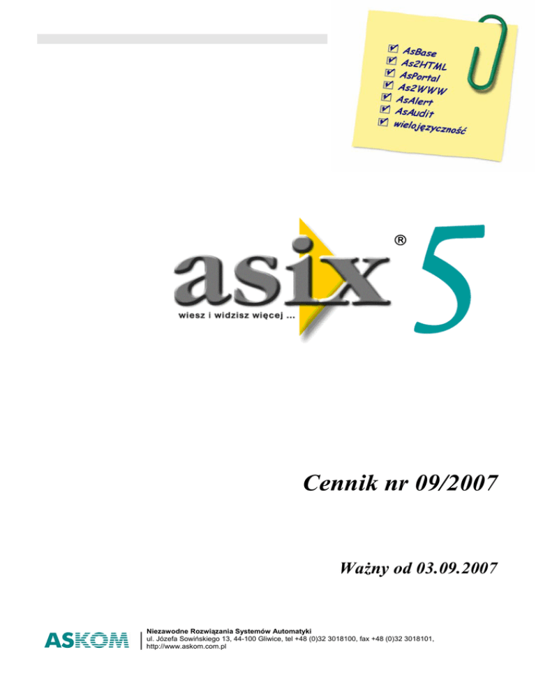 ® Cennik nr 09/2007 Ważny od 03.09.2007 Niezawodne Rozwiązania Systemów Automatyki ul. Józefa Sowińskiego 13, 44-100 Gliwice, tel +48 (0)32 3018100, fax +48 (0)32 3018101, http://www.askom.com.pl Cennik 09/2007 ASKOM® i asix® to zastrzeżone znaki firmy ASKOM Spółka z o.o., Gliwice. Inne występujące w tekście znaki firmowe bądź towarowe są zastrzeżonymi znakami ich właścicieli. Wszelkie prawa zastrzeżone. Nieautoryzowane rozpowszechnianie całości lub fragmentu niniejszej publikacji w jakiejkolwiek postaci jest zabronione. Wykonywanie kopii metodą kserograficzną, fotograficzną lub inną powoduje naruszenie praw autorskich niniejszej publikacji. ASKOM sp. z o. o. nie bierze żadnej odpowiedzialności za jakiekolwiek szkody wynikłe z wykorzystywania zawartych w publikacji treści. Wraz z pojawieniem się nowego cennika, wszystkie poprzednie tracą ważność. Copyright © 2007, ASKOM Spółka z o.o., Gliwice ASKOM Spółka z o.o., ul. Józefa Sowińskiego 13 44-100 Gliwice, tel. +48 (0) 32 3018100, fax +48 (0) 32 3018101, http://www.askom.com.pl, e-mail: [email protected] Cennik 09/2007 . OPROGRAMOWANIE Nazwa pakietu Typ Cena Stacja inżynierska lokalna asix-WDUW 450,- zł Stacja inżynierska sieciowa asix-WDUN 1.500,-zł Stacja operatorska, limit: 32 zmienne asix-WATW 1.100,-zł Stacja operatorska, limit: 64 zmienne asix-WAEW 1.800,-zł Stacja operatorska, limit: 128 zmiennych asix-WALW 2.900,-zł Stacja operatorska, limit: 256 zmiennych asix-WABW 3.900,-zł Stacja operatorska, limit: 512 zmiennych asix-WACW 5.900,-zł Stacja operatorska, limit: 1024 zmienne asix-WAAW 6.800,-zł asix-WAFW 7.900,-zł asix-WAUW 8.900,-zł Serwer operatorski, limit: 64 zmienne asix-WAES 2.200,-zł Serwer operatorski, limit: 128 zmiennych asix-WALS 3.900,-zł Serwer operatorski, limit : 256 zmiennych asix-WABS 4.700,-zł Serwer operatorski, limit : 512 zmiennych asix-WACS 7.600,-zł Serwer operatorski, limit : 1024 zmienne asix-WAAS 8.700,-zł Serwer operatorski, limit : 4096 zmiennych asix-WAFS 9.900,-zł Serwer operatorski „nielimitowany”, limit: 232 zmiennych asix-WAUS 13.600,-zł Terminal sieciowy asix -WAUT 1.800,-zł Terminal operatorski asix-WAUO 2.400, -zł Stacja operatorska, limit: 4096 zmiennych 32 Stacja operatorska „nielimitowana”, limit: 2 zmiennych Terminal sieciowy, licencja „site licence” Serwer OPC/DDE/OLE/.NET asix Connect5 Portal/Serwer WWW dla 1 jednoczesnego klienta asix4Internet Rozszerzenie licencji Portalu/Serwera WWW – 5 kolejnych klientów Serwer AsAlert Klient AsAlert, licencja zdalnego dostępu do serwera AsAlert AsAudit-Lite, licencja dla stacji inżynierskiej sieciowej WDUN, stacji operatorskich: WATW, WAEW, WALW, WABW oraz terminali 1.100,-zł 3.000,-zł AsAlert AsAudit, licencja dla serwerów operatorskich i stacji operatorskich WACW, WAAW, WAUW 700,-zł 900,-zł 500,-zł AsAudit 3.500,-zł AsAudit-Lite 1.000,-zł Rozszerzenie stacji/serwera do pracy wielomonitorowej Wymiana klucza HASP 2.500,-zł 220,-zł Każdy pakiet asix zawiera development, run time, serwer OPC/DDE/OLE/.NET oraz dokumentację elektroniczną Niezawodne Rozwiązania Systemów Automatyki ul. Józefa Sowińskiego 13, 44-100 Gliwice, tel +48 (0)32 3018100, fax +48 (0)32 3018101, http://www.askom.com.pl Strona 3 z 4 Cennik 09/2007 INFORMACJE DODATKOWE Pakiet próbny (demo) wraz z pełną dokumentacją (CD) Aktualizacja z asix dla MS DOS do asix dla Windows NT/98/2000/XP bezpłatnie Zmiana typu pakietu różnica cen wersji Aktualizacja wersji (update) bezpłatnie Wymiana wersji (upgrade) z wersji 2.xx do wersji 5.xx 60% ceny pakietu Wymiana wersji (upgrade) z wersji 3.xx do wersji 5.xx 45% ceny pakietu Wymiana wersji (upgrade) z wersji 4.xx do wersji 5.xx 30% ceny pakietu Moduły komunikacji z wyłączeniem modułów specjalnych w cenie pakietu Implementacja dowolnego protokołu komunikacyjnego, nie występującego na liście dostępnych modułów komunikacji Szkolenie 4-dniowe Strona 4 z 4 1.100,-zł Wrzesień 2007 ASIX_cennik_09_2007;MST; 15.02.08 16:08