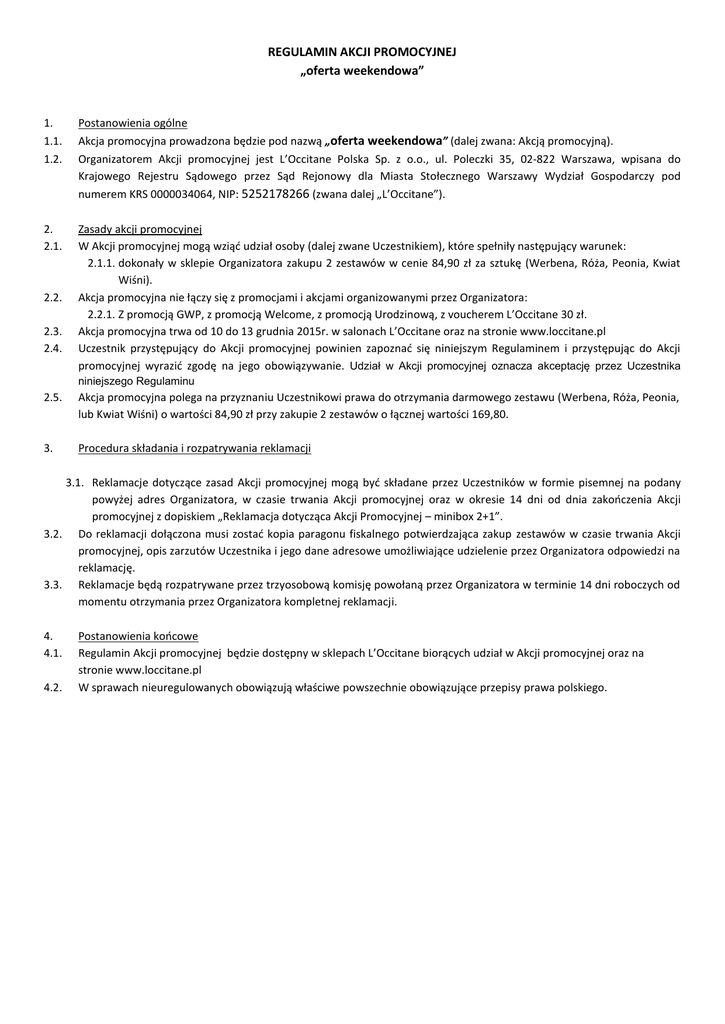 REGULAMIN AKCJI PROMOCYJNEJ „oferta weekendowa” 1. 1.1. 1.2. Postanowienia ogólne Akcja promocyjna prowadzona będzie pod nazwą „oferta weekendowa” (dalej zwana: Akcją promocyjną). Organizatorem Akcji promocyjnej jest L’Occitane Polska Sp. z o.o., ul. Poleczki 35, 02-822 Warszawa, wpisana do Krajowego Rejestru Sądowego przez Sąd Rejonowy dla Miasta Stołecznego Warszawy Wydział Gospodarczy pod numerem KRS 0000034064, NIP: 5252178266 (zwana dalej „L’Occitane”). 2. 2.1. Zasady akcji promocyjnej W Akcji promocyjnej mogą wziąć udział osoby (dalej zwane Uczestnikiem), które spełniły następujący warunek: 2.1.1. dokonały w sklepie Organizatora zakupu 2 zestawów w cenie 84,90 zł za sztukę (Werbena, Róża, Peonia, Kwiat Wiśni). Akcja promocyjna nie łączy się z promocjami i akcjami organizowanymi przez Organizatora: 2.2.1. Z promocją GWP, z promocją Welcome, z promocją Urodzinową, z voucherem L’Occitane 30 zł. Akcja promocyjna trwa od 10 do 13 grudnia 2015r. w salonach L’Occitane oraz na stronie www.loccitane.pl Uczestnik przystępujący do Akcji promocyjnej powinien zapoznać się niniejszym Regulaminem i przystępując do Akcji promocyjnej wyrazić zgodę na jego obowiązywanie. Udział w Akcji promocyjnej oznacza akceptację przez Uczestnika 2.2. 2.3. 2.4. niniejszego Regulaminu 2.5. Akcja promocyjna polega na przyznaniu Uczestnikowi prawa do otrzymania darmowego zestawu (Werbena, Róża, Peonia, lub Kwiat Wiśni) o wartości 84,90 zł przy zakupie 2 zestawów o łącznej wartości 169,80. 3. Procedura składania i rozpatrywania reklamacji 3.1. Reklamacje dotyczące zasad Akcji promocyjnej mogą być składane przez Uczestników w formie pisemnej na podany powyżej adres Organizatora, w czasie trwania Akcji promocyjnej oraz w okresie 14 dni od dnia zakończenia Akcji promocyjnej z dopiskiem „Reklamacja dotycząca Akcji Promocyjnej – minibox 2+1”. 3.2. Do reklamacji dołączona musi zostać kopia paragonu fiskalnego potwierdzająca zakup zestawów w czasie trwania Akcji promocyjnej, opis zarzutów Uczestnika i jego dane adresowe umożliwiające udzielenie przez Organizatora odpowiedzi na reklamację. 3.3. Reklamacje będą rozpatrywane przez trzyosobową komisję powołaną przez Organizatora w terminie 14 dni roboczych od momentu otrzymania przez Organizatora kompletnej reklamacji. 4. 4.1. 4.2. Postanowienia końcowe Regulamin Akcji promocyjnej będzie dostępny w sklepach L’Occitane biorących udział w Akcji promocyjnej oraz na stronie www.loccitane.pl W sprawach nieuregulowanych obowiązują właściwe powszechnie obowiązujące przepisy prawa polskiego.