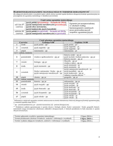 HARMONOGRAM EGZAMINU MATURALNEGO W TERMINIE DODATKOWYM* dla zdających (absolwentów wszystkich typów szkół), którzy uzyskali zgodę dyrektora okręgowej komisji egzaminacyjnej na przystąpienie do egzaminu maturalnego w dodatkowym terminie od 1 do 17 czerwca od 6 do 11 czerwca Część ustna egzaminu maturalnego język polski (prezentacja – formuła do 2014), Egzamin jest przeprowadzany języki mniejszości narodowych (prezentacja), w szkołach według języki obce nowożytne, harmonogramów ustalonych język łemkowski, język kaszubski przez przewodniczących język polski (wypowiedź – formuła od 2015), zespołów egzaminacyjnych. języki mniejszości narodowych (wypowiedź) Czerwiec Część pisemna egzaminu maturalnego Godzina 9:00 Godzina 14:00 1 środa język polski – pp** 2 czwartek język angielski – pp piątek 3 4, 5 – sobota, niedziela matematyka – pp 6 poniedziałek wiedza o społeczeństwie – pp, pr 7 wtorek biologia – pp, pr 8 środa język niemiecki – pp 9 czwartek fizyka i astronomia / fizyka – pp, pr języki mniejszości narodowych – pp piątek chemia – pp, pr 10 11, 12 – sobota, niedziela poniedziałek historia – pp, pr 13 14 wtorek język rosyjski – pp 15 środa język francuski – pp 16 czwartek język hiszpański – pp 17 piątek język włoski – pp język polski – pr** język angielski – pr język angielski – dj** matematyka – pr historia sztuki – pp, pr język łaciński i kultura antyczna – pp, pr historia muzyki – pp, pr filozofia – pp, pr wiedza o tańcu – pp, pr język niemiecki – pr język niemiecki – dj języki mniejszości narodowych – pr język kaszubski – pp, pr język łemkowski – pp, pr zadania w języku obcym *** geografia – pp, pr informatyka – pp, pr język rosyjski – pr język rosyjski – dj język francuski – pr język francuski – dj język hiszpański – pr język hiszpański – dj język włoski – pr język włoski – dj Informacja o miejscach egzaminu zostanie umieszczona na stronie internetowej właściwej okręgowej komisji egzaminacyjnej w ostatnim tygodniu maja 2016 r. * ** pp – poziom podstawowy; pr – poziom rozszerzony; dj – poziom dwujęzyczny Dodatkowe zadania egzaminacyjne w języku obcym z biologii, chemii, fizyki i astronomii / fizyki, geografii, historii, matematyki mogą rozwiązywać absolwenci oddziałów dwujęzycznych, w których przedmioty te były nauczane w języku obcym nowożytnym. *** Termin ogłaszania wyników egzaminu maturalnego: Termin przekazania szkołom świadectw, aneksów i informacji o wynikach: Termin wydania zdającym świadectw, aneksów i informacji o wynikach: 5 lipca 2016 r. 5 lipca 2016 r. 5 lipca 2016 r. 4