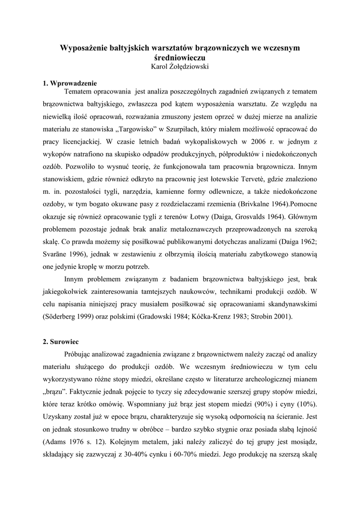 Wyposażenie bałtyjskich warsztatów brązowniczych we wczesnym średniowieczu Karol Żołędziowski 1. Wprowadzenie Tematem opracowania jest analiza poszczególnych zagadnień związanych z tematem brązownictwa bałtyjskiego, zwłaszcza pod kątem wyposażenia warsztatu. Ze względu na niewielką ilość opracowań, rozważania zmuszony jestem oprzeć w dużej mierze na analizie materiału ze stanowiska „Targowisko” w Szurpiłach, który miałem możliwość opracować do pracy licencjackiej. W czasie letnich badań wykopaliskowych w 2006 r. w jednym z wykopów natrafiono na skupisko odpadów produkcyjnych, półproduktów i niedokończonych ozdób. Pozwoliło to wysnuć teorię, że funkcjonowała tam pracownia brązownicza. Innym stanowiskiem, gdzie również odkryto na pracownię jest łotewskie Tervetė, gdzie znaleziono m. in. pozostałości tygli, narzędzia, kamienne formy odlewnicze, a także niedokończone ozdoby, w tym bogato okuwane pasy z rozdzielaczami rzemienia (Brivkalne 1964).Pomocne okazuje się również opracowanie tygli z terenów Łotwy (Daiga, Grosvalds 1964). Głównym problemem pozostaje jednak brak analiz metaloznawczych przeprowadzonych na szeroką skalę. Co prawda możemy się posiłkować publikowanymi dotychczas analizami (Daiga 1962; Svarāne 1996), jednak w zestawieniu z olbrzymią ilością materiału zabytkowego stanowią one jedynie kroplę w morzu potrzeb. Innym problemem związanym z badaniem brązownictwa bałtyjskiego jest, brak jakiegokolwiek zainteresowania tamtejszych naukowców, technikami produkcji ozdób. W celu napisania niniejszej pracy musiałem posiłkować się opracowaniami skandynawskimi (Söderberg 1999) oraz polskimi (Gradowski 1984; Kóčka-Krenz 1983; Strobin 2001). 2. Surowiec Próbując analizować zagadnienia związane z brązownictwem należy zacząć od analizy materiału służącego do produkcji ozdób. We wczesnym średniowieczu w tym celu wykorzystywano różne stopy miedzi, określane często w literaturze archeologicznej mianem „brązu”. Faktycznie jednak pojęcie to tyczy się zdecydowanie szerszej grupy stopów miedzi, które teraz krótko omówię. Wspomniany już brąz jest stopem miedzi (90%) i cyny (10%). Uzyskany został już w epoce brązu, charakteryzuje się wysoką odpornością na ścieranie. Jest on jednak stosunkowo trudny w obróbce – bardzo szybko stygnie oraz posiada słabą lejność (Adams 1976 s. 12). Kolejnym metalem, jaki należy zaliczyć do tej grupy jest mosiądz, składający się zazwyczaj z 30-40% cynku i 60-70% miedzi. Jego produkcję na szerszą skalę wprowadzili Rzymianie. Posiada on zdecydowanie lepszą lejność niż brąz, wolniej stygnie, a ponadto zmieszany w odpowiednich proporcjach jest bardzo ciągliwy, co jest ważne przy produkcji drutu (Söderberg 1999). Następnymi stopami miedzi są spiż oraz mosiądz ołowiowy (mosiądz z niewielkim dodatkiem ołowiu). Spiż składa się zazwyczaj z 76-85% miedzi, 11% cyny, 2-6% ołowiu i 2-7% cynku. Oba te stopy znane były już od starożytności. Posiadają one wysoką odporność na ścieranie. Wykorzystywane były m.in. do produkcji dzwonów, a w czasach późniejszych armat. Kolejną grupę stanowią kruszce szlachetne, jak srebro i złoto posiadające bardzo dobrą lejność i ciągliwość. Ze względu na swą wysoką cenę często jedynie powlekano nimi powierzchnię przedmiotów wykonanych ze stopów miedzi. Stanowiły one również ważny składnik różnego rodzaju lutów. Uzupełnienie wymienionych grup metali stanowiły stopy ołowiu i cyny, często mające imitować wyroby srebrne. Posiadają one bardzo niską temperaturę topnienia i dobrą lejność, jednak są wyjątkowo miękkie i podatne na ścieranie. Badania metaloznawcze wykazały, że na Łotwie do produkcji ozdób wykorzystywano zarówno brąz, jak i mosiądz o bardzo zróżnicowanych proporcjach stopowych. Wskazuje to na częste wykorzystywanie złomu stopów miedzi do produkcji ozdób. Stosunkowo popularne były również ozdoby wykonane ze stopów cyny i ołowiu. Srebro natomiast występowało w niewielkich ilościach, często w postaci płytek zdobiących zapinki tarczowate, czy też kabłąki zapinek podkowiastych z gwiaździstymi zakończeniami (Svarāne 1996, s.105). 3. Warsztat Podstawowy element warsztatu stanowiło palenisko. W interesującym nas okresie jego rolę pełniła najprawdopodobniej jama wylepiona gliną, bądź wyłożona kamieniami. Jako paliwa używano zapewne węgla drzewnego. Aby zapewnić odpowiednio wysoką temperaturę, palenisko dodatkowo zasilano najprawdopodobniej przy pomocy pary miechów jednokomorowych pracujących naprzemiennie. Tego typu warsztat wyobrażony został na kamieniu runicznym z Sörmland w Szwecji (Söderberg 1999). Kolejnym ważnym elementem warsztatu było siedzisko oraz twarda i stabilna powierzchnia pełniąca rolę stołu warsztatowego. Ten element pracowni został opisany w XII w. przez Mnicha Teofila. We wzmiankowanym opisie złotnik zajmował miejsce przy przepołowionej kłodzie, pełniącej rolę stołu, natomiast siedzisko miało postać ziemnego stopnia w wykopanym przy kłodzie rowie (Kobielus 1998, s. 57, 58). Tego typu stanowisko pracy sprawdza się dobrze w czasie wykonywania dużej ilości, skomplikowanych prac. Do potrzeb produkcji na niewielką skalę wystarczą jednak w zupełności dwa pieńki: jeden w charakterze powierzchni roboczej, gdzie można dodatkowo umieścić kowadełko, drugi natomiast pełni rolę siedziska. Możemy założyć, że na ziemiach bałtyskich funkcjonowały oba typy organizacji miejsc pracy. Pierwszy zapewne charakterystyczny dla dużych ośrodków produkcyjnych, jak np. Tervėte, drugi zaś występował w niewielkich pracowniach tworzących głównie na potrzeby lokalne jak warsztat na „Targowisku” w Szurpiłach. 4. Narzędzia Omawiając tę kategorią zabytków należy zacząć od tygli wykorzystywanych do topienia metalu. Zazwyczaj wykonane są one z glin