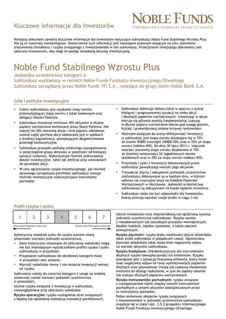 Kluczowe Informacje dla Inwestorów Niniejszy dokument zawiera kluczowe informacje dla Inwestorów dotyczące subfunduszu Noble Fund Stabilnego Wzrostu Plus. Nie są to materiały marketingowe. Dostarczenie tych informacji jest wymogiem prawnym mającym na celu ułatwienie zrozumienia charakteru i ryzyka związanego z inwestowaniem w ten subfundusz. Przeczytanie niniejszego dokumentu jest zalecane Inwestorowi, aby mógł on podjąć świadomą decyzję inwestycyjną. Noble Fund Stabilnego Wzrostu Plus Jednostka uczestnictwa kategorii A Subfundusz wydzielony w ramach Noble Funds Funduszu Inwestycyjnego Otwartego Subfundusz zarządzany przez Noble Funds TFI S.A., należące do grupy Getin Noble Bank S.A. Cele i polityka inwestycyjna ▪ Celem subfunduszu jest uzyskanie stopy zwrotu przewyższającej stopę zwrotu z lokat bankowych oraz obligacji Skarbu Państwa. ▪ Subfundusz inwestuje minimum 40% aktywów w dłużne papiery wartościowe emitowane przez Skarb Państwa. Nie więcej niż 50% stanowią akcje i inne papiery udziałowe. Istotna część portfela akcji ulokowana jest w spółkach o średniej kapitalizacji, posiadających długoterminowe przewagi konkurencyjne. ▪ ▪ Subfundusz prowadzi politykę zmiennego zaangażowania w poszczególne grupy aktywów w zależności od bieżącej sytuacji rynkowej. Wykorzystuje również jednorazowe okazje inwestycyjne, takie jak arbitraż przy wezwaniach do sprzedaży akcji. W celu ograniczania ryzyka inwestycyjnego, jak również sprawnego zarządzania portfelem subfundusz stosuje techniki inwestycyjne wykorzystujące instrumenty pochodne. ▪ Subfundusz dokonuje doboru lokat w oparciu o ocenę bieżącej i prognozowanej sytuacji na rynku akcji i dłużnych papierów wartościowych. Inwestując w akcje kieruje się głównie analizą fundamentalną. Lokując w dłużne papiery wartościowe bierze pod uwagę poziom, kształt i przewidywaną zmianę krzywej rentowności. ▪ Wzorcem służącym do oceny efektywności inwestycji w subfundusz jest stopa zwrotu składająca się w 75% ze stawki WIBID overnight (WIBID ON) oraz w 25% ze stopy zwrotu indeksu WIG. Do dnia 30 lipca 2013 r. włącznie wzorzec stanowiła stopa zwrotu zbudowana w 75% ze średniej rentowności 52 tygodniowych bonów skarbowych oraz w 25% ze stopy zwrotu indeksu WIG. ▪ Przychody i zyski z inwestycji dokonywanych przez subfundusz powiększają wartość jego aktywów. ▪ Transakcje zbycia i odkupienia jednostek uczestnictwa subfunduszu dokonywane są w każdym dniu, w którym odbywa się zwyczajna sesja na Giełdzie Papierów Wartościowych w Warszawie. Jednostki uczestnictwa subfunduszu są odkupywane na każde żądanie Inwestora. ▪ Subfundusz może nie być odpowiedni dla Inwestorów, którzy planują wycofać swoje środki w ciągu 3 lat. Profil ryzyka i zysku 1 2 3 Niższe ryzyko/Potencjalnie niższe zyski 4 5 6 7 Wyższe ryzyko/Potencjalnie wyższe zyski Syntetyczny wskaźnik zysku do ryzyka stanowi miarę zmienności wartości jednostki uczestnictwa. ▪ Dane historyczne stosowane do obliczenia wskaźnika mogą nie być miarodajnym wyznacznikiem profilu ryzyka i zysku subfunduszu w przyszłości. ▪ Przypisanie subfunduszu do określonej kategorii może w przyszłości ulec zmianie. ▪ Wartość wskaźnika równa 1 nie oznacza inwestycji wolnej od ryzyka. Subfundusz należy do czwartej kategorii z uwagi na średnią zmienność wahań wartości jednostki uczestnictwa w przeszłości. Istotne ryzyka związane z inwestycją w subfundusz, nieuwzględnione przy obliczaniu wskaźnika: Ryzyko operacyjne: ryzyko wystąpienia strat związanych z błędną lub opóźnioną realizacją transakcji portfelowych, zleceń Inwestorów oraz nieprawidłową lub opóźnioną wyceną jednostki uczestnictwa subfunduszu. Ryzyko wynika z nieadekwatnych lub zawodnych procesów wewnętrznych, błędów ludzkich, błędów systemów, a także zdarzeń zewnętrznych. Ryzyko płynności: ryzyko braku możliwości zbycia składników lokat przez subfundusz w pożądanym czasie. Ograniczona płynność składników lokat może mieć negatywny wpływ na wartość aktywów subfunduszu. Ryzyko kredytowe: charakterystyczne dla instrumentów dłużnych ryzyko niewypłacalności ich emitentów. Ryzyko powiązane jest z sytuacją finansową emitenta, która może mieć negatywny wpływ na cenę wyemitowanych papierów dłużnych oraz spowodować trwałą lub czasową niezdolność emitenta do obsługi zadłużenia, w tym do zapłaty odsetek lub wykupu dłużnych papierów wartościowych. Ryzyko instrumentów pochodnych: ryzyko związane z występowaniem różnic między cenami instrumentów pochodnych a cenami aktywów zabezpieczanych przez te instrumenty pochodne. Pełne omówienie obszarów ryzyka związanych z inwestowaniem w jednostki uczestnictwa subfunduszu znajduje się w części pkt. 3.5.2 prospektu informacyjnego Noble Funds Funduszu Inwestycyjnego Otwartego. Opłaty Opłaty ponoszone przez Inwestora przeznaczone są na pokrycie kosztów działania subfunduszu, w tym kosztów dystrybucji i marketingu. Opłaty te zmniejszają stopę zwrotu z inwestycji. Opłaty jednorazowe pobierane przed lub po dokonaniu inwestycji: Opłata za nabycie 3,00% Opłata za umorzenie brak Jest to maksymalna opłata (zgodnie z aktualną tabelą opłat manipulacyjnych udostępnioną na stronie internetowej www.noblefunds.pl), jaka może zostać pobrana z Państwa środków przed ich zainwestowaniem lub wypłaceniem środków z inwestycji. Opłaty pobierane z subfunduszu w ciągu roku: Opłaty i koszty bieżące 3,53% Opłaty pobierane z subfunduszu w określonych warunkach szczególnych: Opłata zmienna za wyniki W określonych przypadkach wysokość opłaty za nabycie może być niższa od podanej w tabeli. Dodatkowe informacje dotyczące opłat za nabycie i umorzenie uzyskać można u dystrybutora subfunduszu. Podana wysokość rocznych opłat bieżących opiera się na wydatkach roku obrotowego zakończoneg