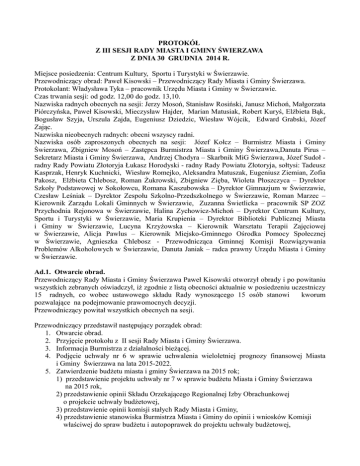 PROTOKÓŁ Z III SESJI RADY MIASTA I GMINY ŚWIERZAWA Z DNIA 30 GRUDNIA 2014 R. Miejsce posiedzenia: Centrum Kultury, Sportu i Turystyki w Świerzawie. Przewodniczący obrad: Paweł Kisowski – Przewodniczący Rady Miasta i Gminy Świerzawa. Protokolant: Władysława Tyka – pracownik Urzędu Miasta i Gminy w Świerzawie. Czas trwania sesji: od godz. 12,00 do godz. 13,10. Nazwiska radnych obecnych na sesji: Jerzy Mosoń, Stanisław Rosiński, Janusz Michoń, Małgorzata Piórczyńska, Paweł Kisowski, Mieczysław Hajder, Marian Matusiak, Robert Kuryś, Elżbieta Bąk, Bogusław Szyja, Urszula Zajda, Eugeniusz Dziedzic, Wiesław Wójcik, Edward Grabski, Józef Zając. Nazwiska nieobecnych radnych: obecni wszyscy radni. Nazwiska osób zaproszonych obecnych na sesji: Józef Kołcz – Burmistrz Miasta i Gminy Świerzawa, Zbigniew Mosoń – Zastępca Burmistrza Miasta i Gminy Świerzawa,Danuta Pirus – Sekretarz Miasta i Gminy Świerzawa, Andrzej Chodyra – Skarbnik MiG Świerzawa, Józef Sudoł radny Rady Powiatu Złotoryja Łukasz Horodyski - radny Rady Powiatu Złotoryja, sołtysi: Tadeusz Kasprzak, Henryk Kuchnicki, Wiesław Romejko, Aleksandra Matuszak, Eugeniusz Ziemian, Zofia Pakosz, Elżbieta Chlebosz, Roman Żukrowski, Zbigniew Zięba, Wioleta Płoszczyca – Dyrektor Szkoły Podstawowej w Sokołowcu, Romana Kaszubowska – Dyrektor Gimnazjum w Świerzawie, Czesław Leśniak – Dyrektor Zespołu Szkolno-Przedszkolnego w Świerzawie, Roman Marzec – Kierownik Zarządu Lokali Gminnych w Świerzawie, Zuzanna Świetlicka – pracownik SP ZOZ Przychodnia Rejonowa w Świerzawie, Halina Zychowicz-Michoń – Dyrektor Centrum Kultury, Sportu i Turystyki w Świerzawie, Maria Krupienia – Dyrektor Biblioteki Publicznej Miasta i Gminy w Świerzawie, Lucyna Krzyżowska – Kierownik Warsztatu Terapii Zajęciowej w Świerzawie, Alicja Pawlus – Kierownik Miejsko-Gminnego Ośrodka Pomocy Społecznej w Świerzawie, Agnieszka Chlebosz - Przewodnicząca Gminnej Komisji Rozwiązywania Problemów Alkoholowych w Świerzawie, Danuta Janiak – radca prawny Urzędu Miasta i Gminy w Świerzawie. Ad.1. Otwarcie obrad. Przewodniczący Rady Miasta i Gminy Świerzawa Paweł Kisowski otworzył obrady i po powitaniu wszystkich zebranych oświadczył, iż zgodnie z listą obecności aktualnie w posiedzeniu uczestniczy 15 radnych, co wobec ustawowego składu Rady wynoszącego 15 osób stanowi kworum pozwalające na podejmowanie prawomocnych decyzji. Przewodniczący powitał wszystkich obecnych na sesji. Przewodniczący przedstawił następujący porządek obrad: 1. Otwarcie obrad. 2. Przyjęcie protokołu z II sesji Rady Miasta i Gminy Świerzawa. 3. Informacja Burmistrza z działalności bieżącej. 4. Podjęcie uchwały nr 6 w sprawie uchwalenia wieloletniej prognozy finansowej Miasta i Gminy Świerzawa na lata 2015-2022. 5. Zatwierdzenie budżetu miasta i gminy Świerzawa na 2015 rok; 1) przedstawienie projektu uchwały nr 7 w sprawie budżetu Miasta i Gminy Świerzawa na 2015 rok, 2) przedstawienie opinii Składu Orzekającego Regionalnej Izby Obrachunkowej o projekcie uchwały budżetowej, 3) przedstawienie opinii komisji stałych Rady Miasta i Gminy, 4) przedstawienie stanowiska Burmistrza Miasta i Gminy do opinii i wniosków Komisji właściwej do spraw budżetu i autopoprawek do projektu uchwały budżetowej, - 2 5) dyskusja, 6) głosowanie zgłoszonych autopoprawek Burmistrza Miasta i Gminy oraz zgłoszonych podczas sesji poprawek, 7) głosowanie projektu uchwały budżetowej uwzględniającego przyjęte autopoprawki i poprawki. 6. Przedstawienie projektów uchwał, dyskusja i podjęcie uchwał: 1) nr 9 w sprawie zatwierdzenia planu pracy Rady Miasta i Gminy i Komisji Rady, 2) nr 10 w sprawie przyjęcia „Gminnego Programu Profilaktyki i Rozwiązywania Problemów Alkoholowych oraz Przeciwdziałania Narkomanii dla Miasta i Gminy Świerzawa na rok 2015”. 7. Interpelacje i zapytania radnych. 8. Odpowiedzi na interpelacje. 9. Wolne wnioski. 10. Sprawy różne. 11. Zamknięcie sesji. Nikt z radnych nie zgłosił uwag do przedstawionego porządku obrad. Ad 2. Przyjęcie protokołu z II sesji Rady Miasta i Gminy Świerzawa. Nikt z radnych nie zgłosił uwag do protokołu. W głosowaniu: za – 15, przeciw – 0, wstrzymujących się – 0 radnych protokół został przyjęty. Ad 3. Informacja Burmistrza z działalności bieżącej. Burmistrz J. Kołcz przedstawił informację z działalności międzysesyjnej (zał. nr 1). Nikt z radnych nie zabierał głosu w dyskusji nad informacją Burmistrza. Ad 4. Podjęcie uchwały nr 7 w sprawie uchwalenia wieloletniej prognozy finansowej Miasta i Gminy Świerzawa na lata 2015-2022. Skarbnik MiG A. Chodyra przedstawił projekt uchwały nr 7 w sprawie uchwalenia wieloletniej prognozy finansowej Miasta i Gminy Świerzawa na lata 2015 – 2022 (zał. nr 2). Burmistrz J. Kołcz odczytał uchwałę nr I/344/2014 Składu Orzekającego RIO we Wrocławiu z dnia 12 grudnia 2014 r. w sprawie opinii o projekcie uchwały w sprawie wieloletniej prognozy finansowej Miasta i Gminy Świerzawa na lata 2015-2022, przedstawionym wraz z projektem uchwały budżetowej Miasta i Gminy Świerzawa na 2015 rok (zał. nr 3). Nikt z radnych nie zabierał głosu w dyskusji nad projektem uchwały. W głosowaniu: za – 15, przeciw – 0, wstrzymujących się – 0 radnych uchwała została podjęta. Ad.5. Zatwierdzenie budżetu miasta i gminy Świerzawa na 2015 rok; 1) przedstawienie projektu uchwały nr 8 w sprawie budżetu Miasta i Gminy Świerzawa na 2015 rok: Skarbnik MiG A. Chodyra przedstawił projekt uchwały nr 8 w sprawie budżetu miasta i gminy Świerzawa na 2015 rok (zał. nr 4). 2) przedstawienie opinii Składu Orzekającego Regionalnej Izby Obrachunkowej o projekcie uchwały budżetowej: Burmistrz MiG J. Kołcz odczytał uchwałę nr I/343/2014 Składu Orzekającego RIO we Wrocławiu z dnia 12 grudnia 2014 r. w sprawie opinii o przedłożonym przez Burmistrza Miasta i Gminy Ś