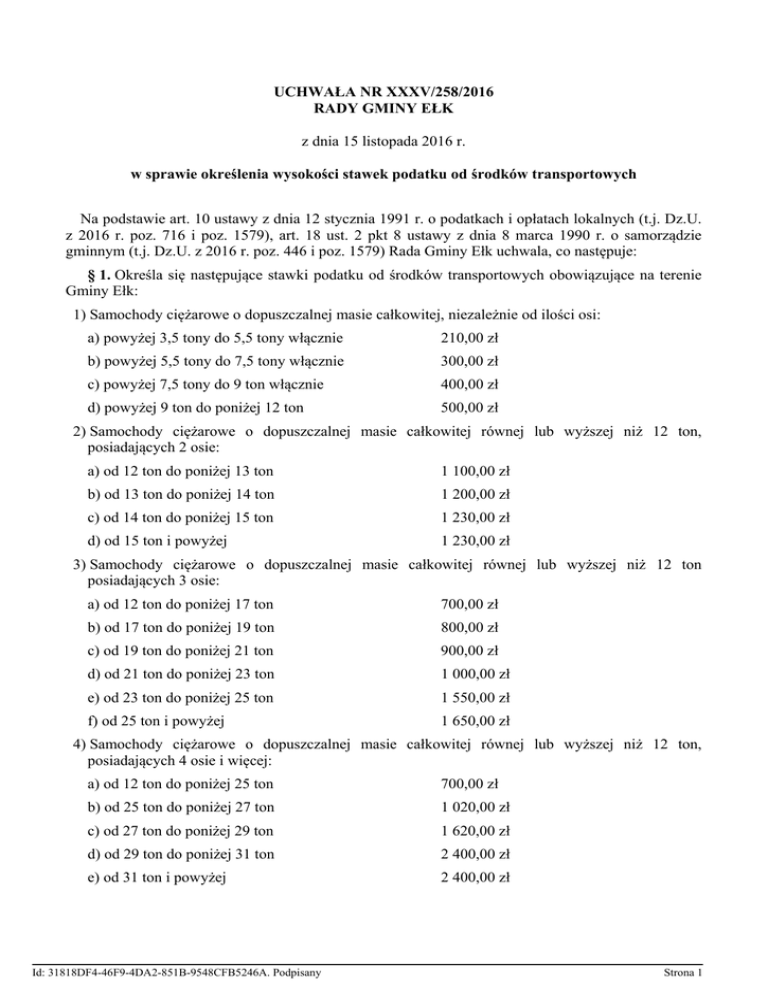 UCHWAŁA NR XXXV/258/2016 RADY GMINY EŁK z dnia 15 listopada 2016 r. w sprawie określenia wysokości stawek podatku od środków transportowych Na podstawie art. 10 ustawy z dnia 12 stycznia 1991 r. o podatkach i opłatach lokalnych (t.j. Dz.U. z 2016 r. poz. 716 i poz. 1579), art. 18 ust. 2 pkt 8 ustawy z dnia 8 marca 1990 r. o samorządzie gminnym (t.j. Dz.U. z 2016 r. poz. 446 i poz. 1579) Rada Gminy Ełk uchwala, co następuje: § 1. Określa się następujące stawki podatku od środków transportowych obowiązujące na terenie Gminy Ełk: 1) Samochody ciężarowe o dopuszczalnej masie całkowitej, niezależnie od ilości osi: a) powyżej 3,5 tony do 5,5 tony włącznie 210,00 zł b) powyżej 5,5 tony do 7,5 tony włącznie 300,00 zł c) powyżej 7,5 tony do 9 ton włącznie 400,00 zł d) powyżej 9 ton do poniżej 12 ton 500,00 zł 2) Samochody ciężarowe o dopuszczalnej masie całkowitej równej lub wyższej niż 12 ton, posiadających 2 osie: a) od 12 ton do poniżej 13 ton 1 100,00 zł b) od 13 ton do poniżej 14 ton 1 200,00 zł c) od 14 ton do poniżej 15 ton 1 230,00 zł d) od 15 ton i powyżej 1 230,00 zł 3) Samochody ciężarowe o dopuszczalnej masie całkowitej równej lub wyższej niż 12 ton posiadających 3 osie: a) od 12 ton do poniżej 17 ton 700,00 zł b) od 17 ton do poniżej 19 ton 800,00 zł c) od 19 ton do poniżej 21 ton 900,00 zł d) od 21 ton do poniżej 23 ton 1 000,00 zł e) od 23 ton do poniżej 25 ton 1 550,00 zł f) od 25 ton i powyżej 1 650,00 zł 4) Samochody ciężarowe o dopuszczalnej masie całkowitej równej lub wyższej niż 12 ton, posiadających 4 osie i więcej: a) od 12 ton do poniżej 25 ton 700,00 zł b) od 25 ton do poniżej 27 ton 1 020,00 zł c) od 27 ton do poniżej 29 ton 1 620,00 zł d) od 29 ton do poniżej 31 ton 2 400,00 zł e) od 31 ton i powyżej 2 400,00 zł Id: 31818DF4-46F9-4DA2-851B-9548CFB5246A. Podpisany Strona 1 5) Ciągniki siodłowe i balastowe przystosowane do używania łącznie z naczepą i przyczepą o dopuszczalnej masie całkowitej zespołu pojazdów niezależnie od ilości osi: a) od 3,5 tony do poniżej 12 ton 1 000,00 zł 6) Ciągniki siodłowe i balastowe przystosowane do używania łącznie z naczepą i przyczepą o dopuszczalnej masie całkowitej zespołu pojazdów posiadających 2 osie: a) od 12 ton do poniżej 18 ton 1 100,00 zł b) od 18 ton do poniżej 25 ton 1 050,00 zł c) od 25 ton do poniżej 31 ton 1 100,00 zł d) od 31 ton i powyżej 1 900,00 zł 7) Ciągniki siodłowe i balastowe przystosowane do używania łącznie z naczepą i przyczepą o dopuszczalnej masie całkowitej zespołu pojazdów posiadających 3 osie i więcej: a) od 12 ton do poniżej 40 ton 1 700,00 zł b) od 40 ton i powyżej 2 500,00 zł 8) Przyczepy i naczepy, które łącznie z pojazdem silnikowym posiadają dopuszczalną masę całkowitą od 7 ton i poniżej 12 ton, z wyjątkiem związanych wyłącznie z działalnością rolniczą prowadzoną przez podatnika podatku rolnego, niezależnie od ilości osi: a) od 7 ton do poniżej 12 ton 90,00 zł 9) Przyczepy i naczepy, które łącznie z pojazdem silnikowym posiadają dopuszczalną masę całkowitą równą lub wyższą niż 12 ton, z wyjątkiem związanych wyłącznie z działalnością rolniczą prowadzoną przez podatnika podatku rolnego w zależności od ilości osi: a) o liczbie osi – jedna - od 12 ton do poniżej 18 ton 110,00 zł - od 18 ton do poniżej 25 ton 320,00 zł - od 25 ton i powyżej 550,00 zł b) o liczbie osi – dwie - od 12 ton do poniżej 28 ton 305,00 zł - od 28 ton do poniżej 33 ton 840,00 zł - od 33 ton do poniżej 38 ton 1 270,00 zł - od 38 ton i powyżej 1 670,00 zł c) o liczbie osi – trzy i więcej - od 12 ton do poniżej 38 ton 930,00 zł - od 38 ton i powyżej 1 300,00 zł 10) Autobusy w zależności od liczby miejsc do siedzenia, poza miejscem kierowcy: a) mniejszej niż 22 miejsca 400,00 zł b) równej lub większej niż 22 miejsca 700,00 zł § 2. Wykonanie uchwały powierza się Wójtowi Gminy Ełk. Id: 31818DF4-46F9-4DA2-851B-9548CFB5246A. Podpisany Strona 2 § 3. Traci moc uchwała Nr XIX/121/2015 Rady Gminy Ełk z dnia 12 listopada 2015 roku w sprawie określenia wysokości stawek podatku od środków transportowych. § 4. Uchwała podlega ogłoszeniu w Dzienniku Urzędowym Województwa WarmińskoMazurskiego i obowiązuje od 1 stycznia 2017 r. Przewodniczący Rady Gminy Ełk Mirosław Radywoniuk Id: 31818DF4-46F9-4DA2-851B-9548CFB5246A. Podpisany Strona 3