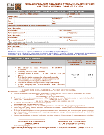 MISJA GOSPODARCZA POŁĄCZONA Z TARGAMI „MARITIME” 2009 MARITIME – WIETNAM , 24.02.-02.03.2009 TERMIN ZGŁOSZENIA UDZIAŁU W MISJI GOSPODARCZEJ UPŁYWA 15.XII.2008 UMOWA - ZGŁOSZENIE FAX: 22 827-82-28 Nazwa firmy: NIP: Ulica: Kod i Miasto: Tel.: Fax: E-mail: www: OSOBY UCZESTNICZĄCE W MISJI GOSPODARCZEJ: Imię i Nazwisko: Stanowisko: Data urodzenia:* Adres zamieszkania:* Nr Paszportu:* Imię i Nazwisko: Stanowisko: Data urodzenia:* Adres zamieszkania:* Nr Paszportu:* * Dane potrzebne do wystawienia polisy ubezpieczeniowej i wizy OSOBA KONTAKTOWA: Imię i Nazwisko: Tel.: Fax: E-mail: Atlas Business Service sp. z o.o. zaprasza przedsiębiorców do wzięcia udziału we wspólnym Projekcie. Koordynatorem oraz wnioskodawcą będzie firma ABS, która w imieniu Państwa wystąpi z wnioskiem o dofinansowanie do następujących przedsięwzięć: UWAGA!!! Umowę zgłoszenie musimy otrzymać zgodnie z wytycznymi Ministerstwa Gospodarki do 15 grudnia 2008. KOSZTY UDZIAŁU W MISJI GOSPODARCZEJ: Nazwa Usługi: 9 9 9 5 9 9 9 Bilet lotniczy na trasie Warszawa – Ho-Chi-Minh – Warszawa; Transfery lotnisko – hotel – lotnisko Zakwaterowanie w hotelu ****w pok. 1-os.lub 2-os (do wyboru) Zwiedzanie międzynarodowej wystawy połączonej z uczestnictwem w seminariach, konferencjach i innych imprezach targowych: spotkania branżowe Program kulturalny; ubezpieczenie, wizę wietnamską Pomoc merytoryczna przedstawiciela Atlas Business Service. Cena pakietu nettozakwaterowanie w pokoju 2-os. Dopłata do pokoju 1-os. 9,225 zł 875 zł □ □ LICZBA OSÓB BIORĄCYCH UDZIAŁ W MISJI GOSPODARCZEJ: ______ Postanowienia końcowe: 1. Podstawowym warunkiem uczestnictwa jest wypełnienie i przesłanie niniejszej Umowy-Zgłoszenia w 2 egzemplarzach na adres: Atlas Business Service Sp. z o.o. Ul. Niemcewicza 26 lok U9; 02-306 Warszawa 2. Przekazanie przelewem kwoty za uczestnictwo w Misji Gospodarczej na konto Organizatora nastąpi po wystawieniu i przesłaniu faktury VAT. Dane Organizatora: Atlas Business Service Sp. z o.o., DZ BANK Polska S. A. 60 1740 0006 0000 3000 0000 3699. 3. O udziale w Misji Gospodarczej decyduje kolejność zgłoszeń. Zgłoszenia prosimy przesyłać do 15.XII.2008 4. W przypadku rezygnacji firmy po dniu 15.XII.2008 organizator nie zwraca kosztów. Rezygnację należy zgłosić faksem. 5. Istnieje możliwość zmiany nazwiska uczestnika misji gospodarczej zgodnie z ograniczeniami wizowymi i regulaminem przewozów grupowych linii lotniczych. 6. Wysyłając wypełnioną umowę uczestnik wyraża zgodę na gromadzenie, przetwarzanie oraz wykorzystywanie podanych informacji przez Organizatora w celach statystycznych i marketingowych zgodnie z ustawą o ochronie danych osobowych z 29.08.1997r. (Dz.U. nr 133 z 1997r). 7. Jednocześnie oświadczamy, że jesteśmy/ nie jesteśmy płatnikiem podatku VAT i upoważniamy Organizatora do wystawienia faktury _________________________ _________________________ (MIEJSCOWOŚĆ, DATA, PIECZĄTKA, PODPIS) (MIEJSCOWOŚĆ, DATA, PIECZĄTKA, PODPIS) ZAMAWIAJĄCY ATLAS BUSINESS SERVICE VAT bez naszego podpisu. Zgłoszenia prosimy przesłać do Organizatora – firmy ABS na faks: (022) 827 82 28