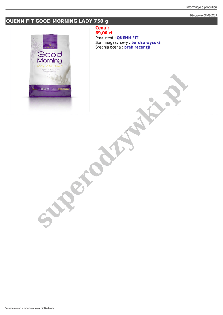 Informacje o produkcie Utworzono 07-03-2017 QUENN FIT GOOD MORNING LADY 750 g Cena : 69,00 zł su pe ro dz y w ki .p l Producent : QUENN FIT Stan magazynowy : bardzo wysoki Średnia ocena : brak recenzji Wygenerowano w programie www.oscGold.com GOOD MORNING LADY AM. SHAKE to doskonała kompozycja różnych form białka zaprojektowana specjalnie z myślą o kobietach ceniących sobie najwyższej jakości produkty białkowe, pyszny smak oraz skuteczne działanie. GOOD MORNING LADY AM. SHAKE jest najlepszym partnerem w walce o wymarzoną figurę! Odżywia najbardziej aktywne metabolicznie tkanki zapewniając profesjonalne wsparcie dla trenującego organizmu. Co niezwykle istotne, jest on przeznaczony dla wszystkich kobiet odchudzających się i pragnących wymodelować sylwetkę. Preparat pomaga doskonale wymodelować i ujędrnić ciało a jego przyjmowanie nie skutkuje nadmiernym przyrostem masy mięśniowej! Już wiesz jak powinnaś zacząć każdy dzień, lub czym odżywić organizm po treningu! W jaki sposób stosować GOOD MORNING LADY AM. SHAKE? To wspaniała w smaku przekąska – zdrowy zamiennik deserów czy słodyczy. Zapomnij na zawsze o wyrzutach sumienia. Teraz pyszny, słodki posiłek zjesz z poczuciem, że robisz dla własnego organizmu coś dobrego! GOOD MORNING LADY AM. SHAKE najlepiej stosować rano – po przebudzeniu lub po treningu. Znakomicie sprawdza się na przykład jako: • pyszny, samodzielny koktajl przygotowany na bazie wody lub mleka, • bogaty koktajl z dodatkiem: owoców, musli, płatków śniadaniowych lub orzechów, • składnik domowych lodów białkowych, • baza do przygotowania wyśmienitych i zdrowych, nie wymagających pieczenia „batoników”, • w połączeniu z musli i orzechami oraz zdrowymi tłuszczami, • podstawa doskonałego musu – w połączeniu na przykład z masłem orzechowym. Dla czego wybór GOOD MORNING LADY AM. SHAKE jest tak dobry? W skład preparatu wchodzą: dobrze przyswajalne koncentrat i izolat białka serwatki - podane w wysokim stężeniu, hydrolizatkolagenuzawierający niewielkie peptydy o najkrótszym czasie wchłaniania oraz kazeina micelarna. Zhydrolizowany kolagen zawiera składniki będące niezwykle istotnym budulcem tkanki łącznej, odpowiadające za prawidłową strukturę skóry oraz utrzymanie jej jędrności i elastyczności, a czy właśnie nie oto Ci chodzi? Optymalny udział białka w diecie to istotny czynnik kontroli masy ciała oraz zachowania prawidłowych proporcji tkankowych. Skuteczna odbudowa po treningu oznacza lepszy metabolizm tkanki tłuszczowej, przedłużone uczucie sytości i poprawę ogólnego samopoczucia. Właściwa jakość tkanki mięśniowej umożliwia zachowanie odpowiedniej definicji, kształtu i jędrności ciała. Faktem jest, że spożywanie odpowiedniego rodzaju produktów białkowych ma decydujący wpływ na jakość tkanki mięśniowej – zdecydowanie jednak nie należy obawiać się nadmiernego jej rozrostu! Niski poziom testosteronu w kobiecym organizmie jest głównym czynnikiem uniemożliwiającym przybranie nadmiernej ilości tkanki mięśniowej. Dodatkowo zachowanie właściwej podaży kalorycznej pomaga utrzymać masę mięśniową i sylwetkę w pożądanych granicach! Zawarty w preparacie błonnik kukurydziany jest źródłem nieprzyswajalnych frakcji węglowodanowych, które usprawniają trawienie, absorbują związki tłuszczowe z przewodu pokarmowego i wspomagają jego oczyszczanie. Jego ogromną zaletą jest brak glutenu, znajdującego się w większości preparatów błonnikowych. Zawarty się w suplemencie SINETROL® to opatentowany ekstrakt owoców cytrusowych i guarany o potwierdzonym badaniami klinicznymi działaniu oraz wszechstronnie przebadana L-karnityna. Obie wymienione substancje wzajemnie wspierają swoje działanie. W pierwszej linii decydujące znaczenie mają zawarte w SINETROL®u: polifenole – funkcja antyoksydacyjna (neutralizacja wolnych rodników i ochrona struktur komórkowych, przede wszystkim wielonienasyconych kwasów tłuszczowych, związków białka oraz DNA) oraz ekstrakt z guarany – przyśpiesza lipolizę, czyli ułatwia rozkład triglicerydów zawartych w komórkach tkanki tłuszczowej (adipocytach) do postaci wolnych kwasów tłuszczowych i glicerolu. W drugiej kolejności rozpoczyna swoje działanie L – karnityna, która umożliwia transport kwasów tłuszczowych przez wewnętrzną błonę mitochondrialną do matriks centrum energetycznego komórki, gdzie związki te są rozkładane. Dowody na korzyści płynące ze zwiększenia udziału białka w diecie: Badanie analizujące wpływ diet: wysokobiałkowej oraz wysokowęglowodanowej o porównywalnych wartościach energetycznych jednoznacznie wykazało pozytywny wpływ większego udziału białka w dziennej racji pokarmowej na stosunek komponentów tkankowych ciała, wskaźniki lipidowe krwi, glikemię oraz kontrolę łaknienia (większe uczucie sytości) w okresie redukcji masy ciała u dorosłych kobiet. Utrata masy ciała w krótkim okresie czasu wymaga najczęściej stosowania diety niskoenergetycznej z równoczesną zwiększoną podażą białka. Jednak jak wskazuje kolejny eksperyment – suplementacja produktami zawierającymi białko (szczególnie białko serwatkowe) może pomóc w stabilizacji masy ciała w dłuższym okresie czasu nawet bez stosowania restrykcji energetycznych. Powyższa próba po zakończeniu badania wskazała na niższą masę ciała (-1,8 kg), niższą masę tkanki tłuszczowej (-2,3 kg) oraz mniejszy obwód w talii u badanych stosujących suplementację białkiem typu whey protein niż w grupie spożywającej suplementy węglowodanowe o takiej samej wartości kalorycznej. Według innych autorów badających wpływ diet niskoenergetycznych na wskaźniki biochemiczne krwi, diety o wysokiej zawartości białka miały większy wpływ na redukcję stężenia triacylogliceroli, poprawę gospodarki żelazem (hemoglobina) oraz lepszy metabolizm witaminy B