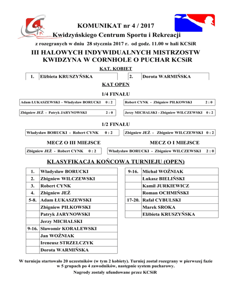 KOMUNIKAT nr 4 / 2017 Kwidzyńskiego Centrum Sportu i Rekreacji z rozegranych w dniu 28 stycznia 2017 r. od godz. 11.00 w hali KCSiR III HALOWYCH INDYWIDUALNYCH MISTRZOSTW KWIDZYNA W CORNHOLE O PUCHAR KCSiR KAT. KOBIET 1. Elżbieta KRUSZYŃSKA 2. Dorota WARMIŃSKA KAT OPEN 1/4 FINAŁU Adam ŁUKASZEWSKI – Władysław BORUCKI 0:2 Robert CYNK - Zbigniew PIŁKOWSKI 2:0 Zbigniew JEŻ - Patryk JARYNOWSKI 2:0 Jerzy MICHALSKI - Zbigniew WILCZEWSKI 0:2 1/2 FINAŁU Władysław BORUCKI - Robert CYNK MECZ O III MIEJSCE Zbigniew JEŻ - Robert CYNK 0:2 0:2 Zbigniew JEŻ - Zbigniew WILCZEWSKI 0 : 2 MECZ O I MIEJSCE Władysław BORUCKI - Zbigniew WILCZEWSKI 2:0 KLASYFIKACJA KOŃCOWA TURNIEJU (OPEN) 1. Władysław BORUCKI 2. Zbigniew WILCZEWSKI Łukasz BIELIŃSKI 3. Robert CYNK Kamil JURKIEWICZ 4. Zbigniew JEŻ Roman OCHMIŃSKI 5-8. Adam ŁUKASZEWSKI 9-16. Michał WOŹNIAK 17-20. Rafał CYBULSKI Zbigniew PIŁKOWSKI Marek SROKA Patryk JARYNOWSKI Elżbieta KRUSZYŃSKA Jerzy MICHALSKI 9-16. Sławomir KORALEWSKI Jan WOŹNIAK Ireneusz STRZELCZYK Dorota WARMIŃSKA W turnieju startowało 20 uczestników (w tym 2 kobiety). Turniej został rozegrany w pierwszej fazie w 5 grupach po 4 zawodników, następnie system pucharowy. Nagrody zostały ufundowane przez KCSiR