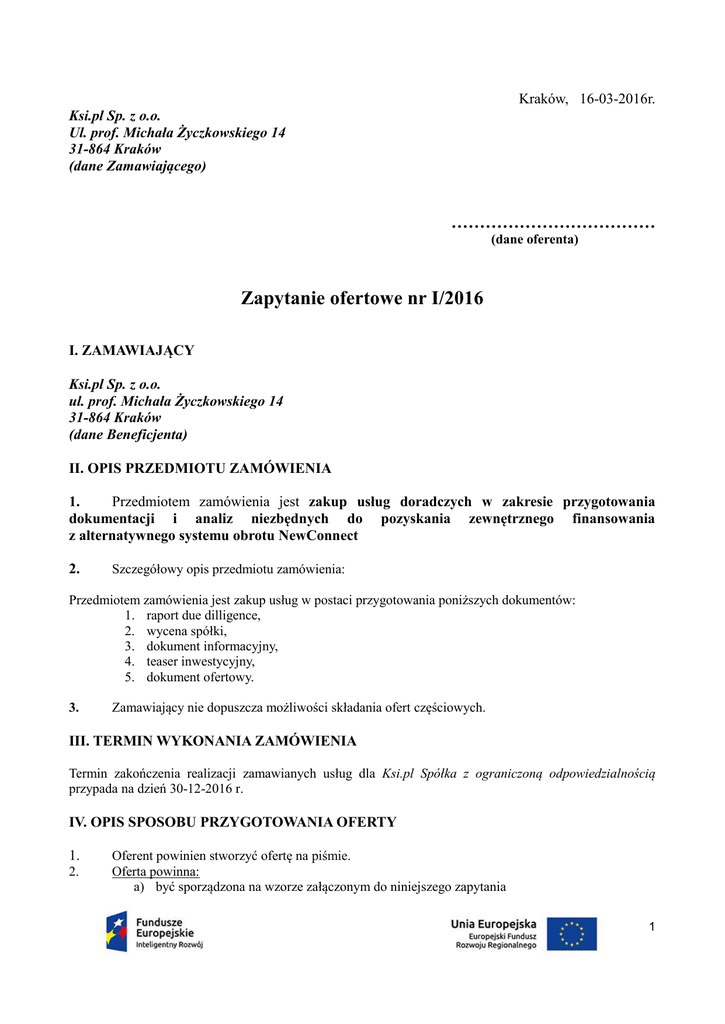 Kraków, 16-03-2016r. Ksi.pl Sp. z o.o. Ul. prof. Michała Życzkowskiego 14 31-864 Kraków (dane Zamawiającego) ……………………………… (dane oferenta) Zapytanie ofertowe nr I/2016 I. ZAMAWIAJĄCY Ksi.pl Sp. z o.o. ul. prof. Michała Życzkowskiego 14 31-864 Kraków (dane Beneficjenta) II. OPIS PRZEDMIOTU ZAMÓWIENIA 1. Przedmiotem zamówienia jest zakup usług doradczych w zakresie przygotowania dokumentacji i analiz niezbędnych do pozyskania zewnętrznego finansowania z alternatywnego systemu obrotu NewConnect 2. Szczegółowy opis przedmiotu zamówienia: Przedmiotem zamówienia jest zakup usług w postaci przygotowania poniższych dokumentów: 1. raport due dilligence, 2. wycena spółki, 3. dokument informacyjny, 4. teaser inwestycyjny, 5. dokument ofertowy. 3. Zamawiający nie dopuszcza możliwości składania ofert częściowych. III. TERMIN WYKONANIA ZAMÓWIENIA Termin zakończenia realizacji zamawianych usług dla Ksi.pl Spółka z ograniczoną odpowiedzialnością przypada na dzień 30-12-2016 r. IV. OPIS SPOSOBU PRZYGOTOWANIA OFERTY 1. 2. Oferent powinien stworzyć ofertę na piśmie. Oferta powinna: a) być sporządzona na wzorze załączonym do niniejszego zapytania 1 b) zawierać adres lub siedzibę oferenta lub pieczęć c) zawierać cenę netto, wartość VAT i cenę brutto wyrażone w polskich złotych (PLN) poszczególnych dokumentów, jak również cenę łączną. d) być podpisana przez osoby upoważnione do reprezentowania Oferenta. e) oferta musi być ważna do dnia podpisania przez Zamawiającego umowy o dofinansowanie w ramach konkursu dla poddziałania 3.1.5 Wsparcie MŚP w dostępie do rynku kapitałowego – 4 Stock. V. MIEJSCE ORAZ TERMIN SKŁADANIA OFERT 1. 2. 3. 4. 5. Oferty powinny być złożone do dnia 21.03.2016 do godz. 16:00. Oferty należy składać elektronicznie na adres: [email protected] Za termin dostarczenia oferty przyjmuje się wpłynięcie oferty do siedziby firmy Ksi.pl Spółka z ograniczoną odpowiedzialnością, ul. prof. Michała Życzkowskiego 14, 31-864 Kraków lub na adres email [email protected] Oferty złożone po terminie nie będą rozpatrywane. Oferent może przed upływem terminu składania ofert zmienić lub wycofać swoją ofertę. Zapytania w zakresie przedmiotu zamówienia należy kierować na adres email: [email protected] . Osobą uprawnioną do kontaktu z Oferentami jest Pan Jacek Mirecki – Prezes Zarządu. VI. OCENA OFERT Zamawiający dokona oceny ważnych ofert na podstawie następujących kryteriów: - Cena 70% - Okres realizacji 30% VII. INFORMACJE DOTYCZĄCE WYBORU NAJKORZYSTNIEJSZEJ OFERTY 1. 2. 3. 4. Otwarcie ofert, ich ocena oraz wybór najkorzystniejszej oferty zostanie dokonany w dniu 21-032016 r. Za prawidłowość postępowania odpowiedzialna będzie Pan Jacek Mirecki. W toku badania i oceny ofert Zamawiający może żądać od Oferentów wyjaśnień dotyczących treści złożonych ofert. Firma Ksi.pl Spółka z ograniczoną odpowiedzialnością zastrzega sobie prawo do negocjacji ceny po wyborze oferenta. VIII. DODATKOWE INFORMACJE Dodatkowych informacji udziela Pan Jacek Mirecki; [email protected]; (12) 633 47 27 IX. ZAŁĄCZNIKI: Załącznik nr 1 – Formularz ofertowy. Załącznik nr 2 – Potwierdzenie otrzymania oferty. 2