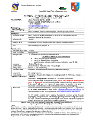 European Employment Services Wojewódzki Urząd Pracy w Rzeszowie (Opole) NIEMCY – PIELĘGNIARKA /PIELĘGNIARZ nr ref. EURES: 10000-1057620419, Kod ISCO: 5132 PRACODAWCA: alpha Personal-Service GmbH Waldstrasse 235, D-63071 Offenbach am Main +49 69 83009862 www.personalservice-alpha.pl Miejsce pracy: Liczba miejsc pracy: Opis: Wymagania: - znajomość języka Okolice Frankfurtu nad Menem 20 Praca w klinikach, centrach rehabilitacyjnych, domach spokojnej starości - wykształcenie Dobra znajomość języka niemieckiego na poziomie B1 (niezbędna do uznania kwalifikacji (dyplomu) w Niemczech) wyższe - doświadczenie Preferowane osoby z doświadczeniem ale mogą być również absolwenci - inne Mile widziane prawo jazdy kat. B Warunki pracy: - data rozpoczęcia pracy od zaraz - okres zatrudnienia bez ograniczeń - wynagrodzenie W zależności od kwalifikacji i doświadczenia : od 1900 do 2500 euro brutto miesięcznie - czas pracy - godziny pracy - rodzaj umowy - zakwaterowanie - wyżywienie - koszt podróży Dodatkowe informacje: Rekrutacja premia urlopowa (wypłacane latem) premia na Święta Bożego Narodzenia dodatki za pracę w święta, niedziele, noce, nadgodziny wg taryfy IGZ. Średnio 40 godz. tyg. praca zmianowa, możliwość pracy w nocy i święta. Umowa na czas nieokreślony bezpłatne – zapewnione przez pracodawcę w hotelach firmowych Na koszt pracownika Pracodawca oferuje możliwość pokrycia kosztów przejazdu do Polski raz w miesiącu UWAGA! Pracodawca nie występuje o zezwolenie na zatrudnienie w Niemczech. Osoby zainteresowane przedmiotową ofertą muszą mieć prawo do podejmowania pracy w Niemczech (obywatelstwo niemieckie, paszport niemiecki, paszport innego kraju „starej” UE lub inne dokumenty uprawniające do podejmowania pracy w Niemczech bez konieczności występowania o uzyskanie zezwolenia na pracę). Osoby zainteresowane i spełniające wymagania pracodawcy proszone są o przesłanie CV w języku niemieckim na adres e-mail: [email protected] lub złożenie aplikacji poprzez stronę internetową: http://www.personalservice-alpha.pl/ Do CV należy dołączyć kopię dyplomu, tłumaczenie wykonane przez tłumacza przysięgłego, kopię dokumentu potwierdzającego dostęp do niemieckiego rynku pracy lub kopię paszportu niemieckiego albo kopię paszportu innego kraju pozwalającego na pracę w Niemczech bez konieczności uzyskania zezwolenia. Agencja alpha Personal-Service GmbH oświadczyła, iż prowadzi swoją działalność zgodnie z przepisami obowiązującymi w swoim kraju. Uwaga: Stosunek pracy z pracodawcą zagranicznym będzie zawarty w ramach prawa obowiązującego w kraju zatrudnienia. Oznacza to, że wszelkie roszczenie z tytułu nie wywiązywania się pracodawcy z warunków zawartych w umowie o pracę, dochodzić można wyłącznie w sądzie pracy w kraju zatrudnienia. W sytuacjach losowych pomoc polskich placówek konsularnych ogranicza się do ewentualnego udzielenia doraźnej pomocy ( np. kredytu na zakup biletu powrotnego do Polski ). Na podstawie ustawy o ochronie danych osobowych z dnia 29 sierpnia 1997 r. (Dz. U. z 2002 r. Nr 101, poz. 926 ze zm.) informujemy, że administratorem danych osobowych wskazanych w dokumentach przekazanych w odpowiedzi na ofertę pracy jest Wojewódzki Urząd Pracy w Rzeszowie, ul. Lisa-Kuli 20, 35-025 Rzesz ów. Dane osobowe wskazane dobrowolnie w ww. dokumentach będą przetwarzane i udostępniane publicznym służbom zatrudnienia, pracodawcom lub podmiotom reprezentującym pracodawców do celów związanych z pośrednictwem pracy w ramach sieci EURES, na podstawie ustawy z dnia 20 kwietnia 2004 r. o promocji zatrudnienia i instytucjach rynku pracy (Dz. U. z 2008 r. Nr 69, poz. 415 ze zm.) przez okres konieczny do osiągnięcia celu określonego w przedmiotowej ustawie..Osobie, której dane osobowe dotyczą przysługuje prawo dostępu do ich treści i prawo ich poprawiania. OFERTA WAŻNA DO ODWOŁANIA www.eures.europa.eu www.wup-rzeszow.pl